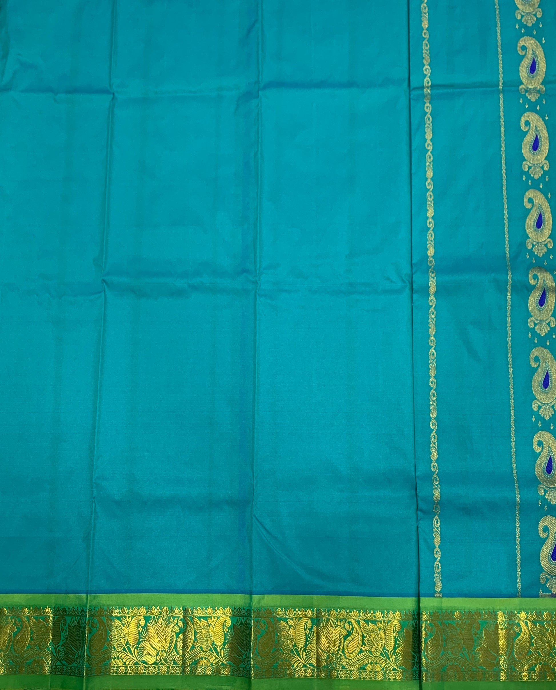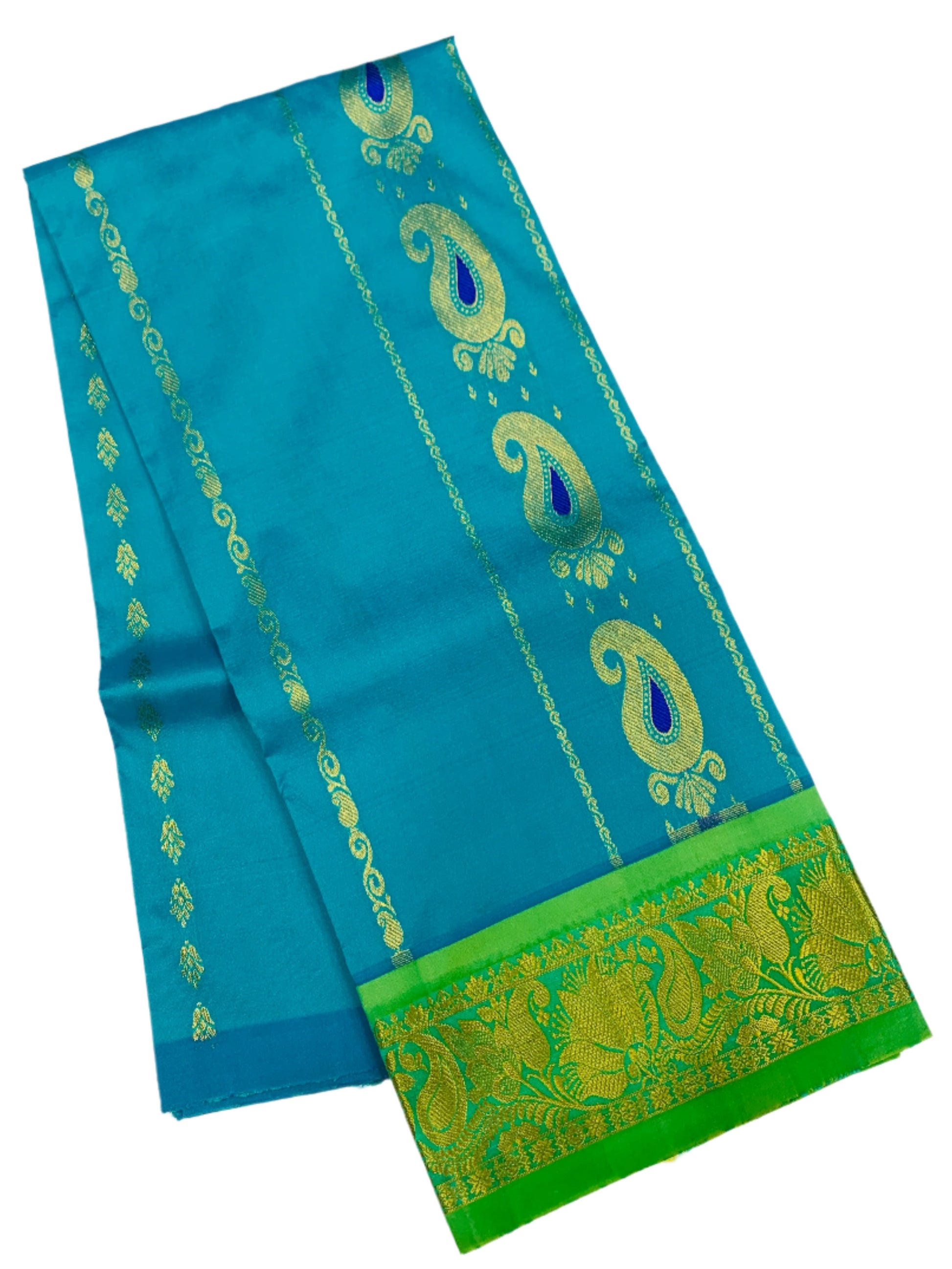 Rama Blue shade with Light Green contrast border Semi silk Pattu Pavadai material for kids age 5 to 10