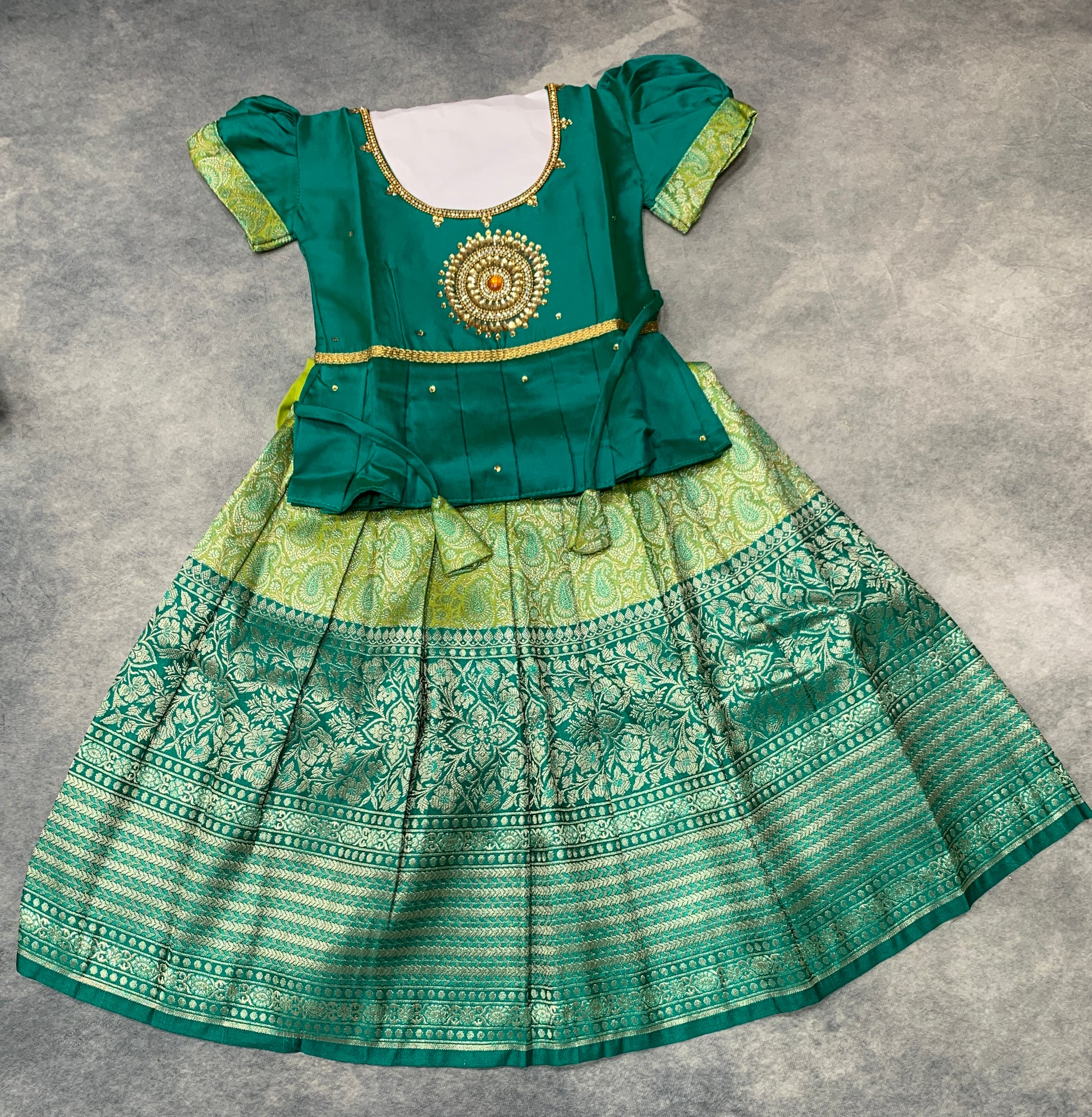 Ready To Wear Apple Green Pavadai with Contrast Peacock Green Blouse