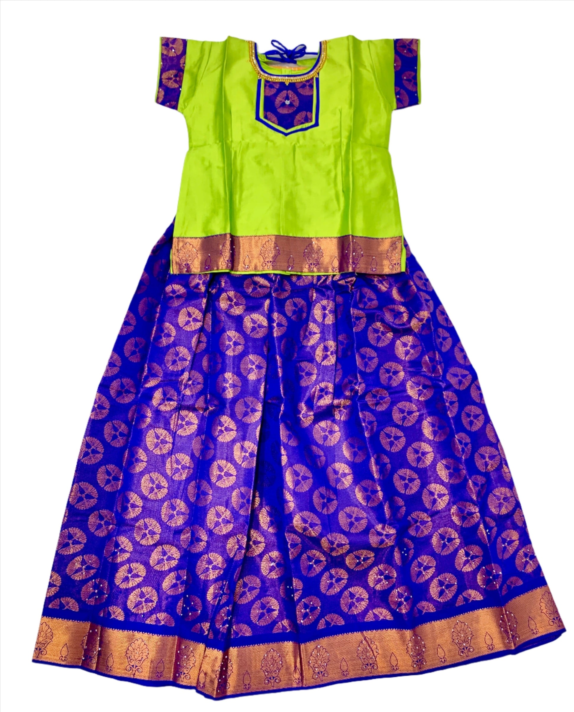 Ready To Wear Blue Pavadai with contrast Apple Green Blouse.