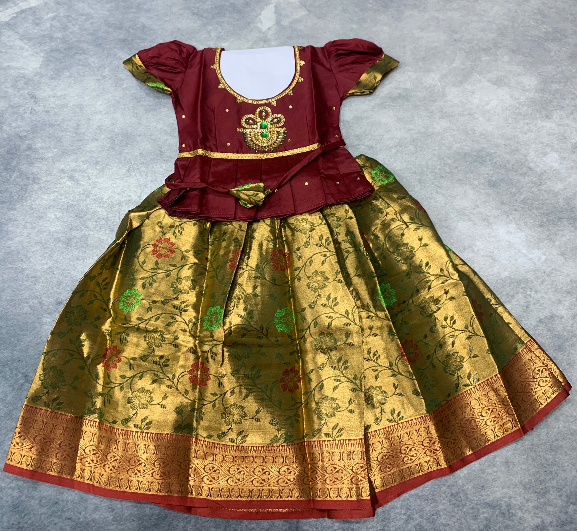 Ready To Wear Golden Green Pavadai with Contrast Brown Blouse