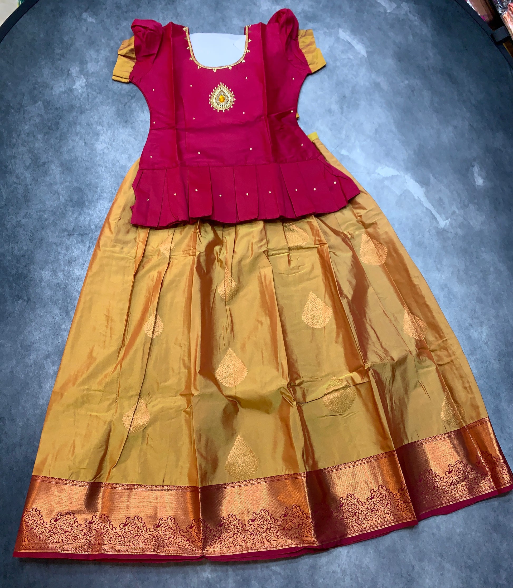 Ready To Wear Golden Pavadai with Contrast Pink Blouse