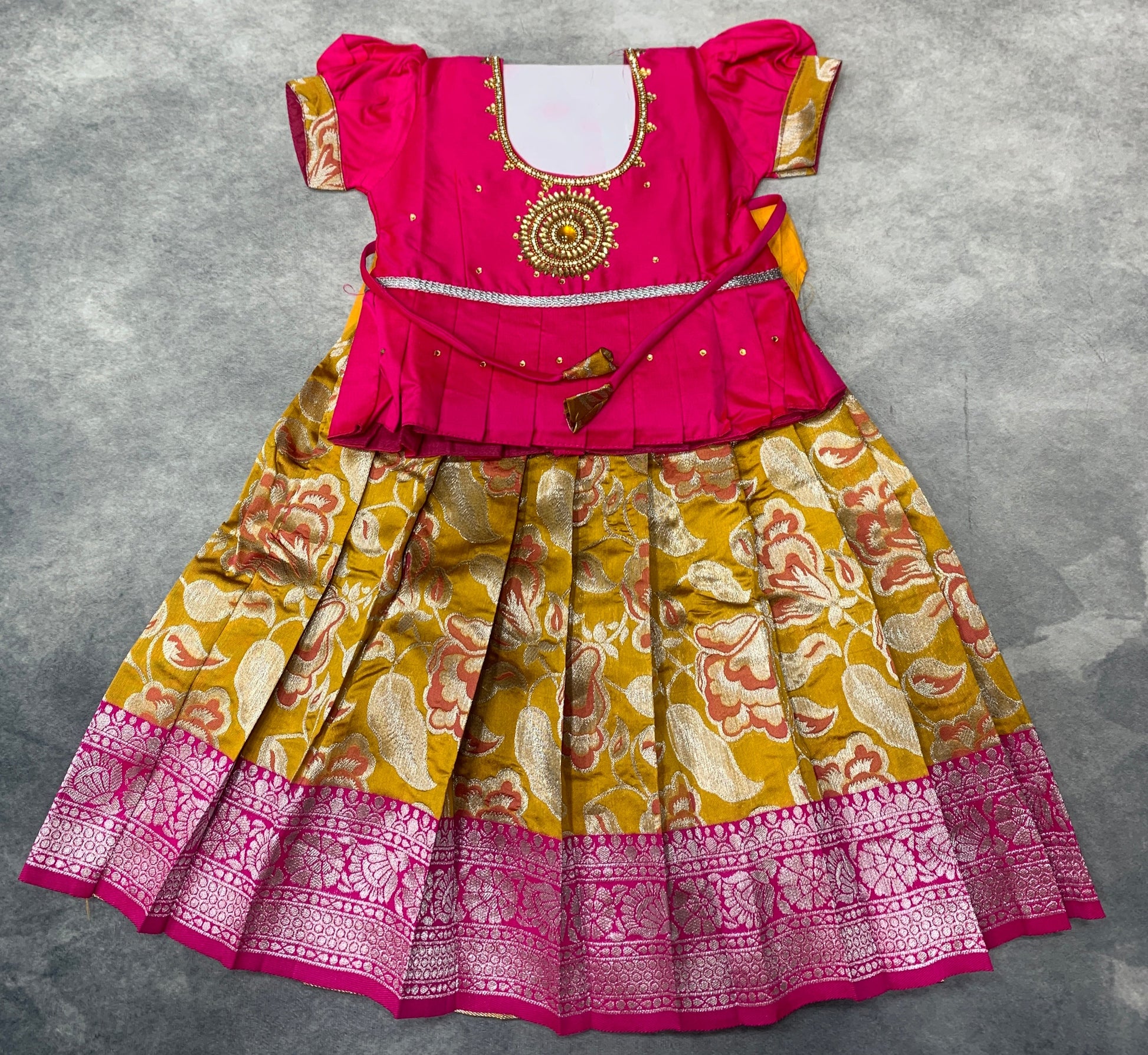 Ready To Wear Golden Yellow Pavadai with Contrast Pink Blouse.