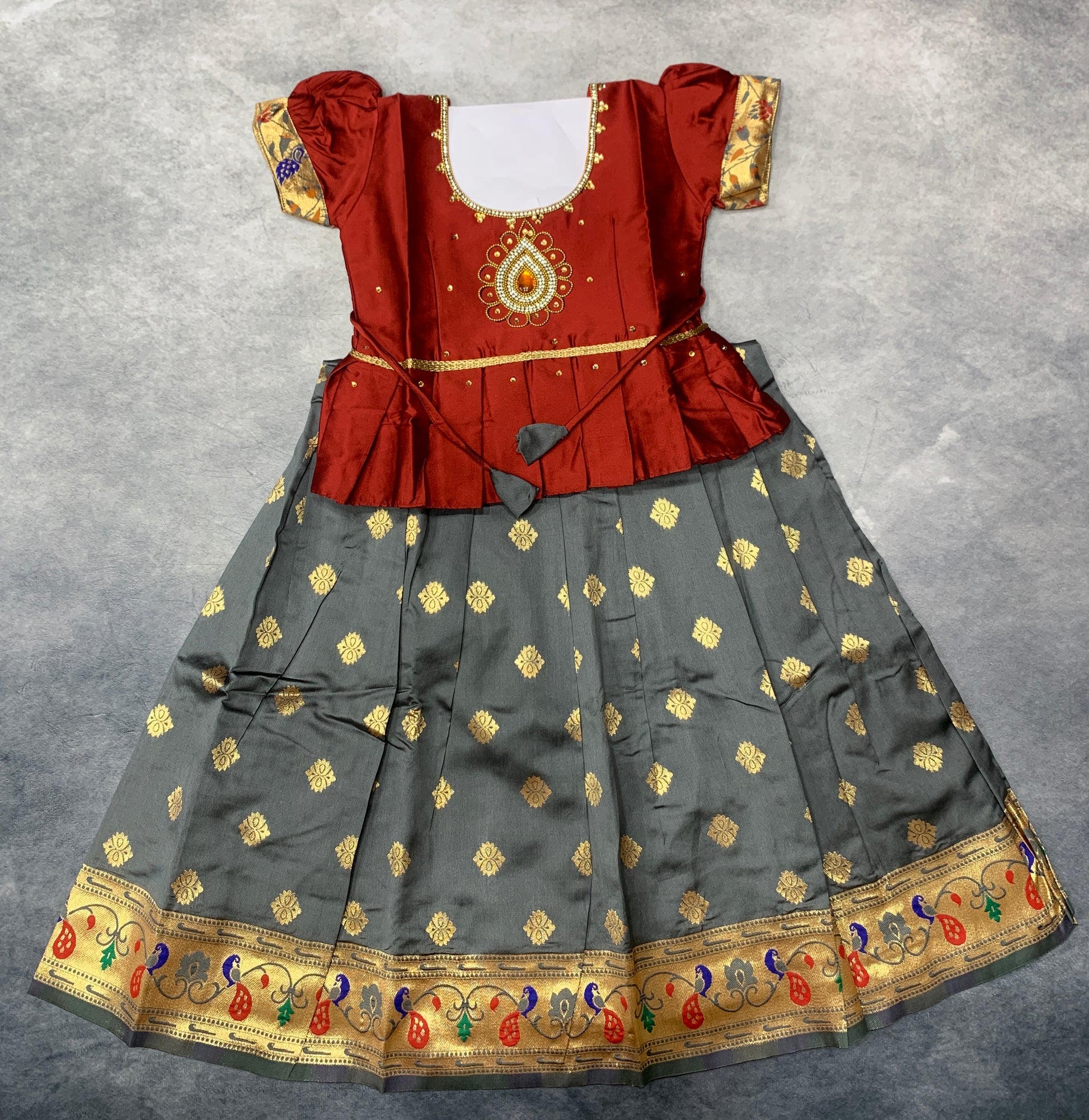 Ready To Wear Gray Pavadai with Contrast Maroon Blouse.