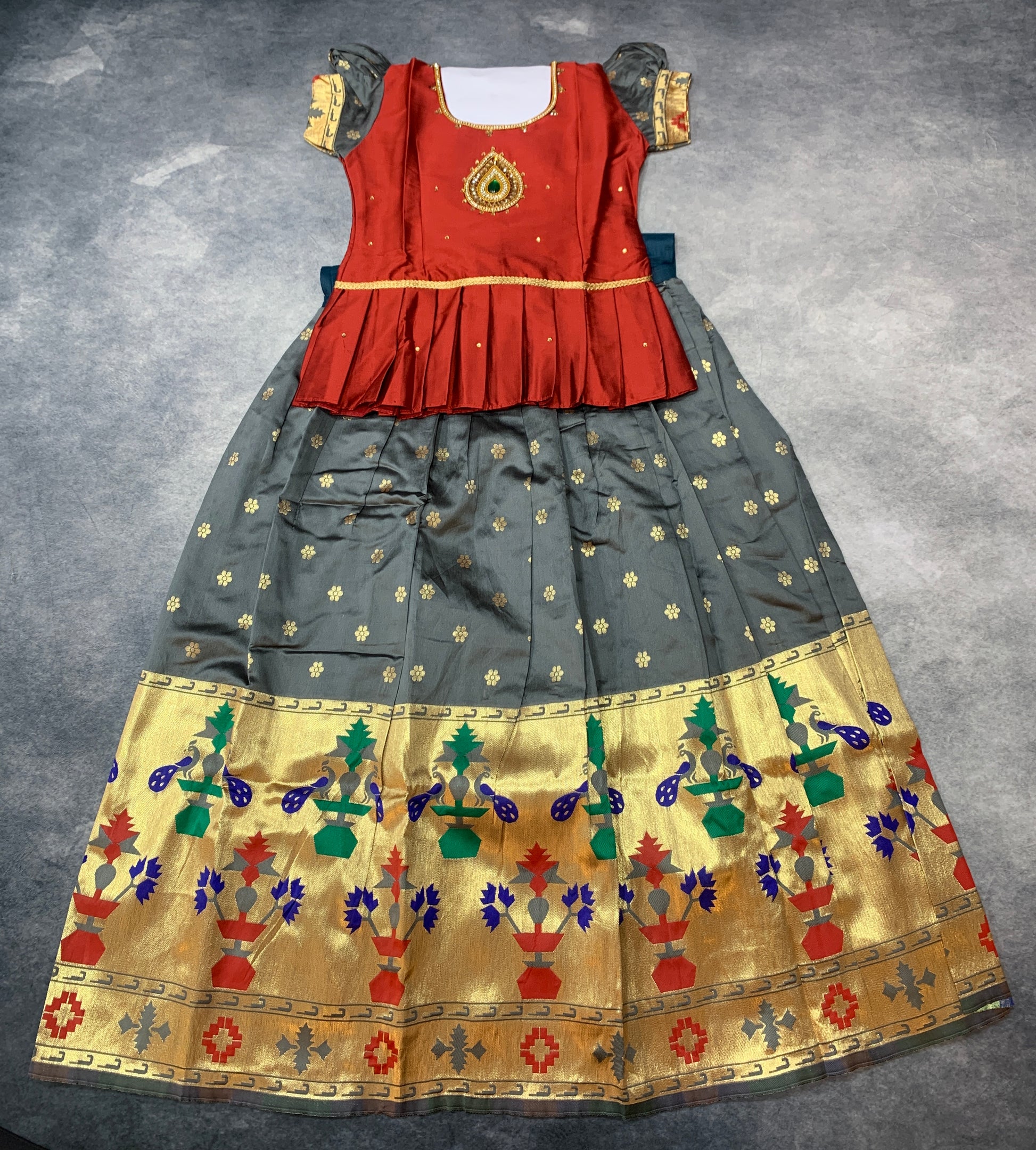 Ready To Wear Gray Pavadai with Contrast Maroon Blouse