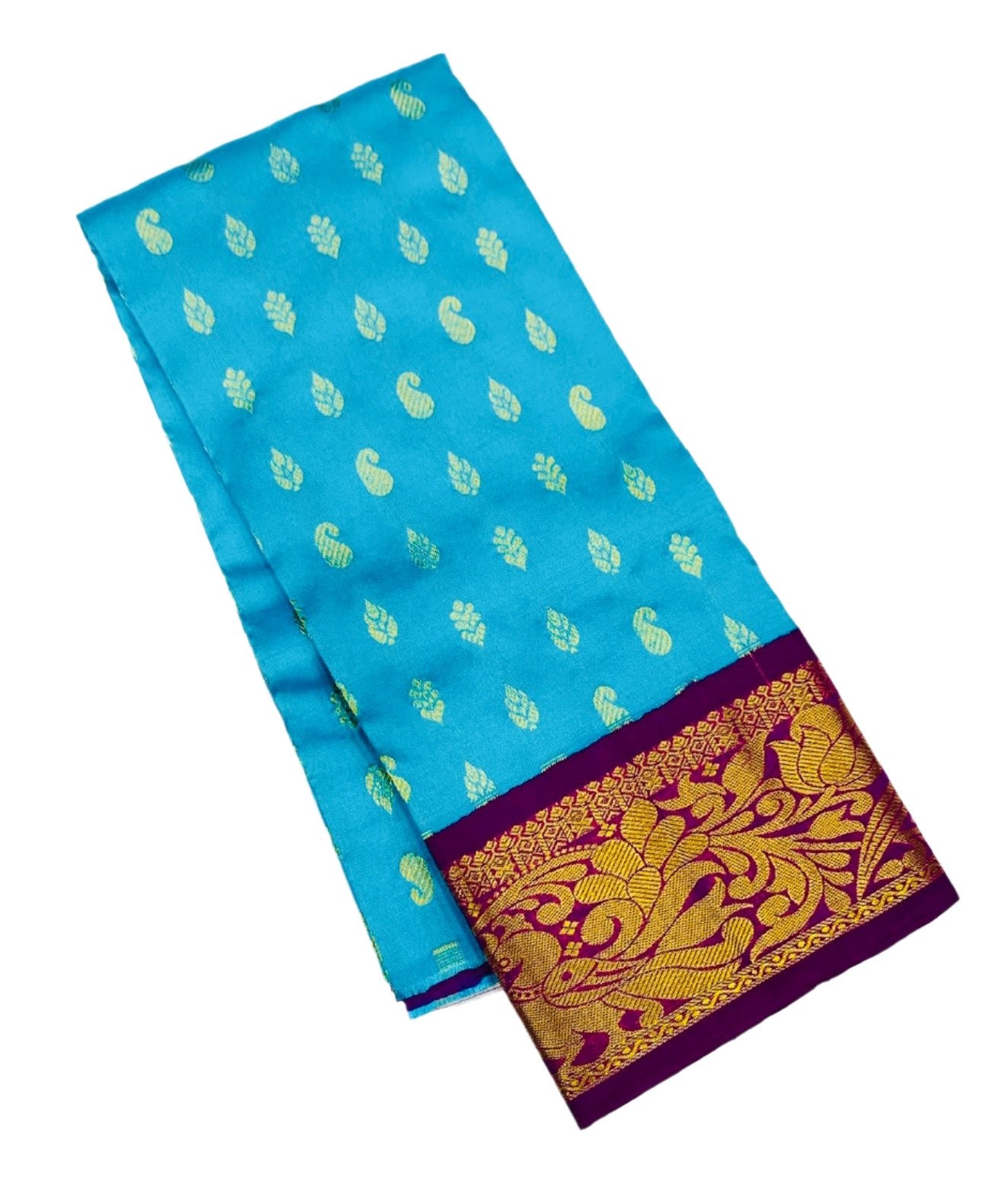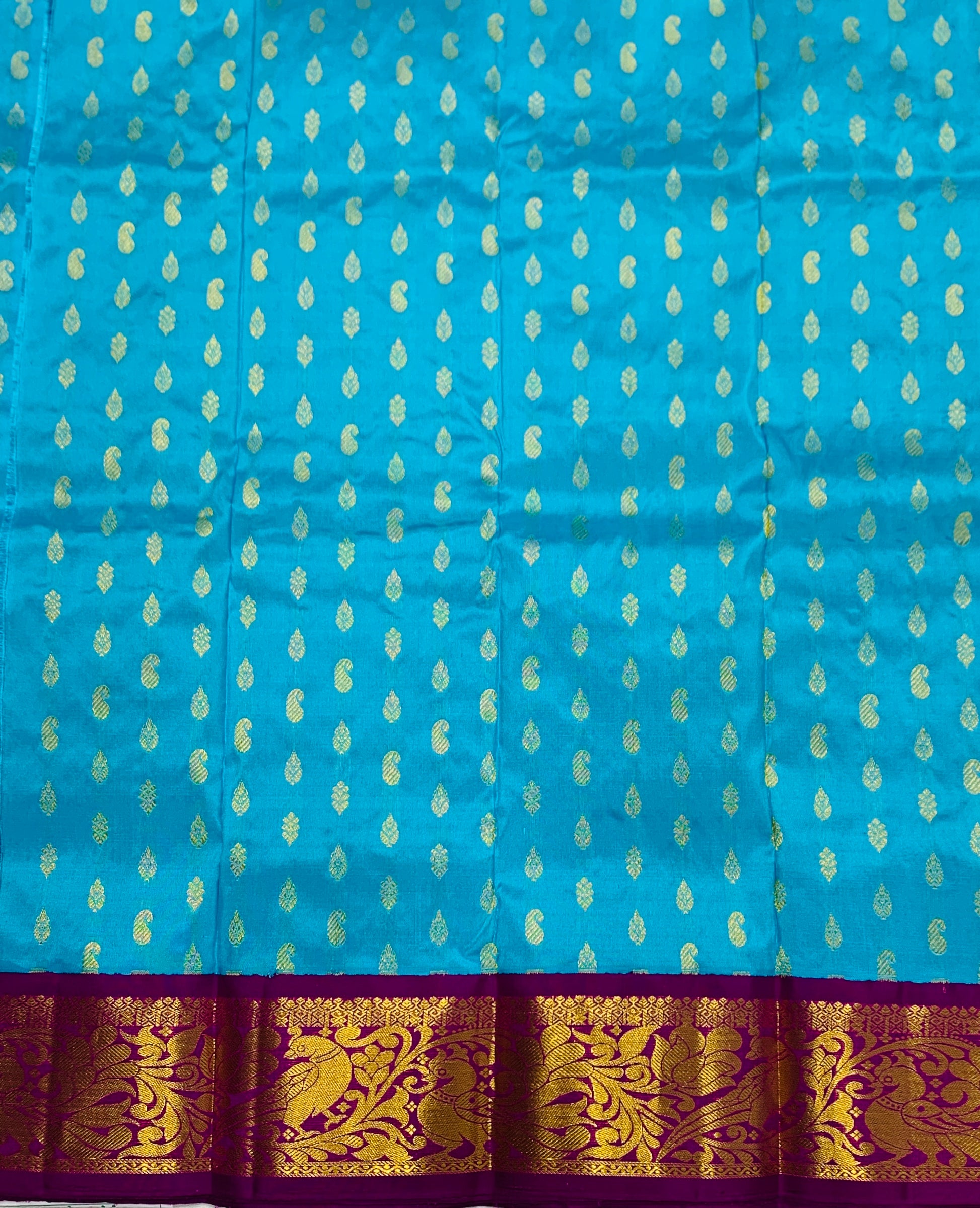 Sky Blue shade Pure kanchipuram Kids Pattu Pavadai with contrast border for newborn to 2 Years