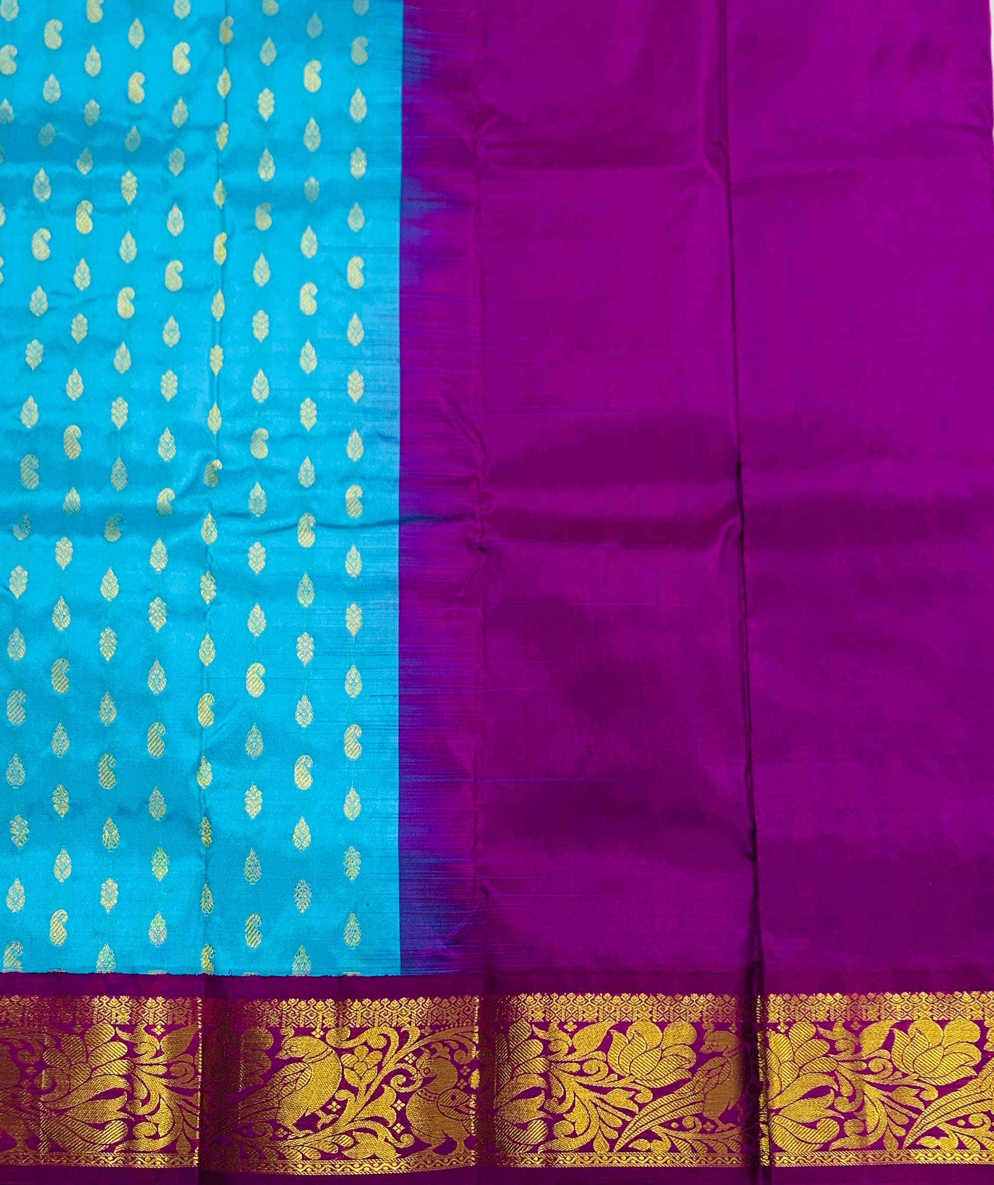 Sky Blue shade with Magenta contrast border Pure Kanchipuram Pattu Pavadai material for kids age newborn to 2 Years