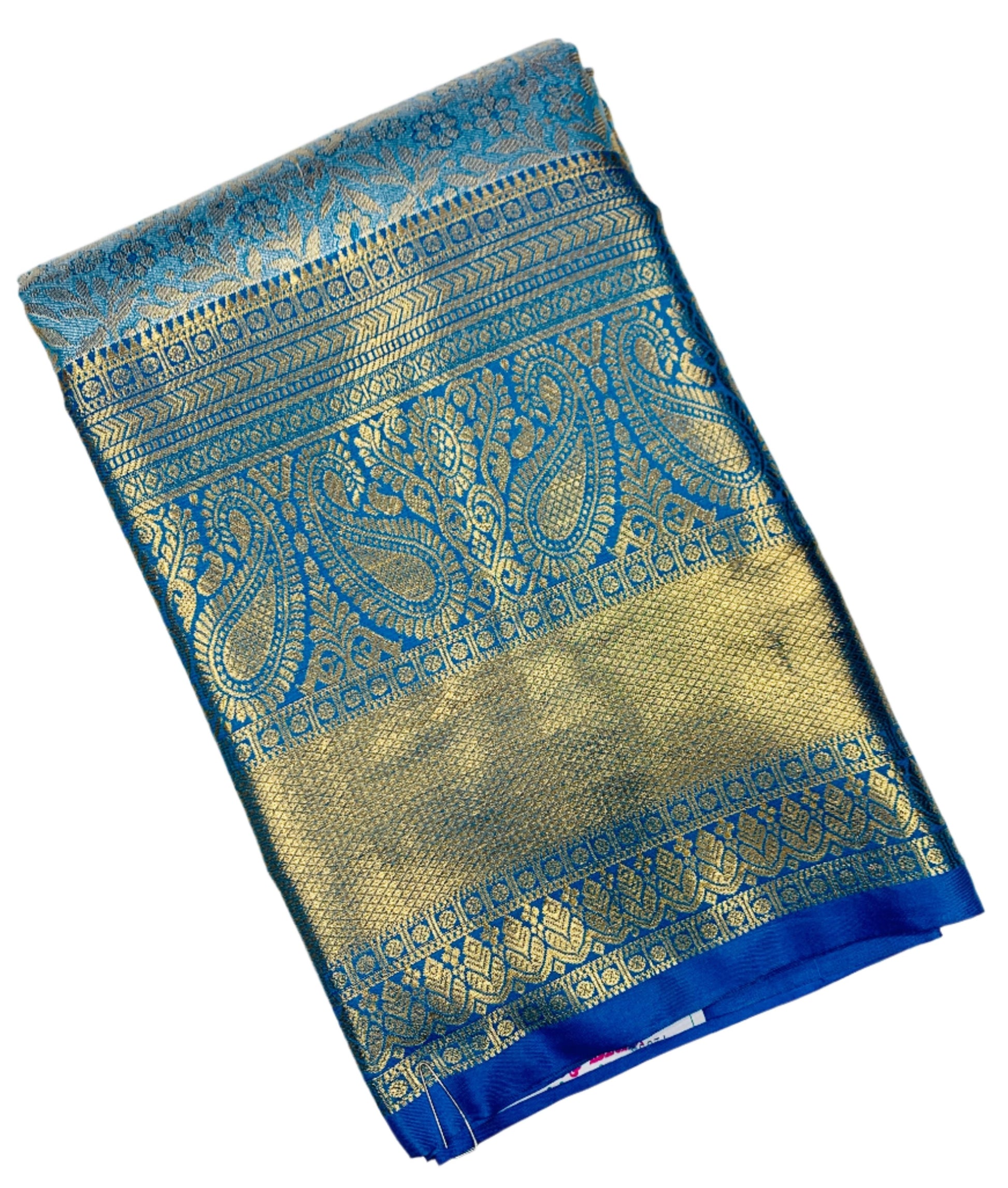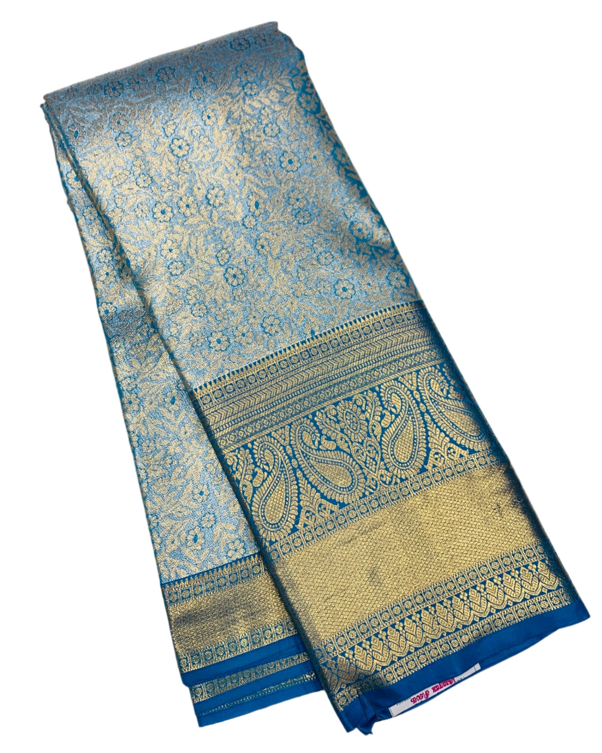 Border : Sky Blue Colour with Golden Zari Border and Floral Design
