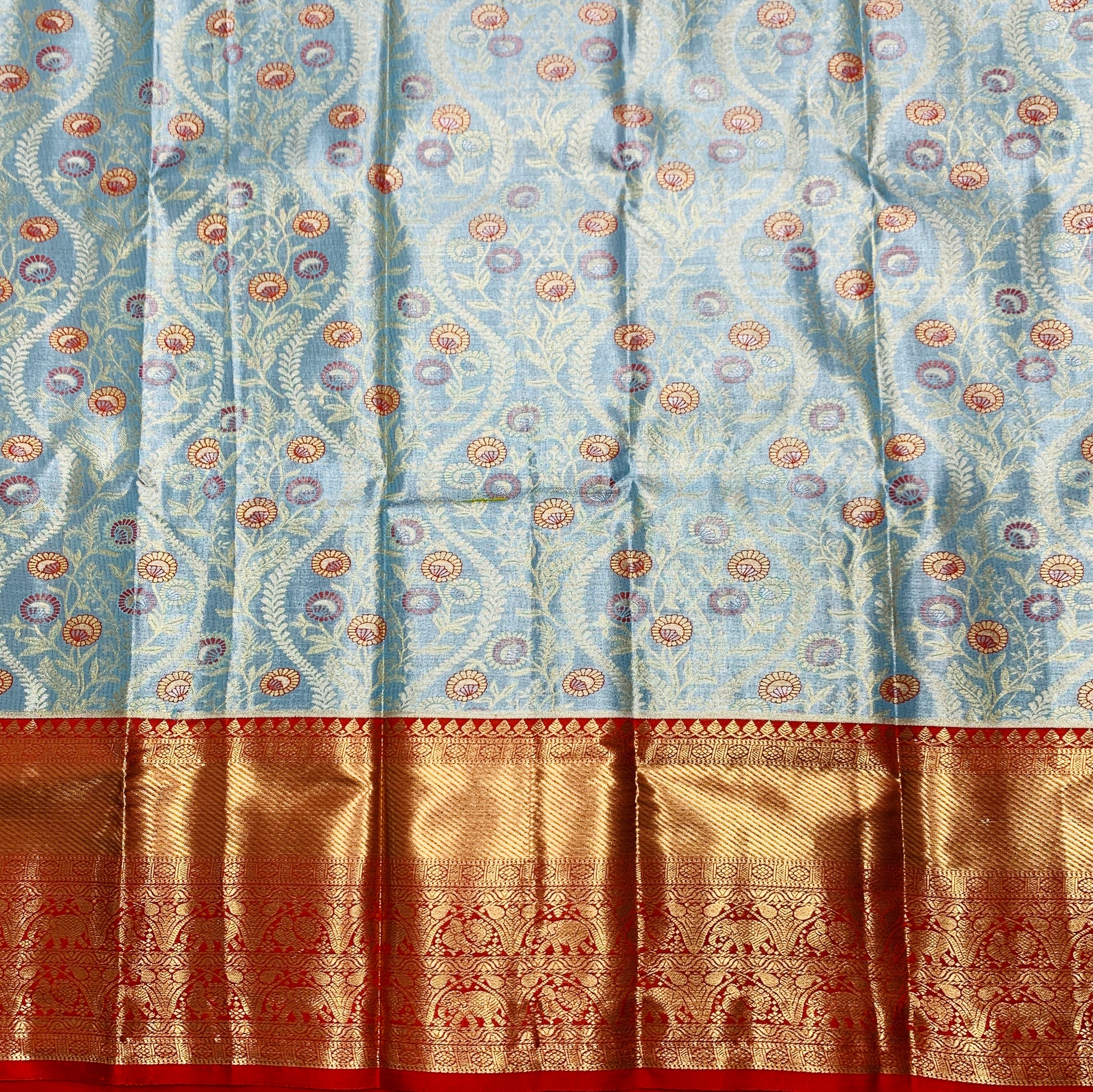 Sky Blue Shade with Contrast Border Vegan silk unstitched Pattu Pavadai material for kids age 2 to 5