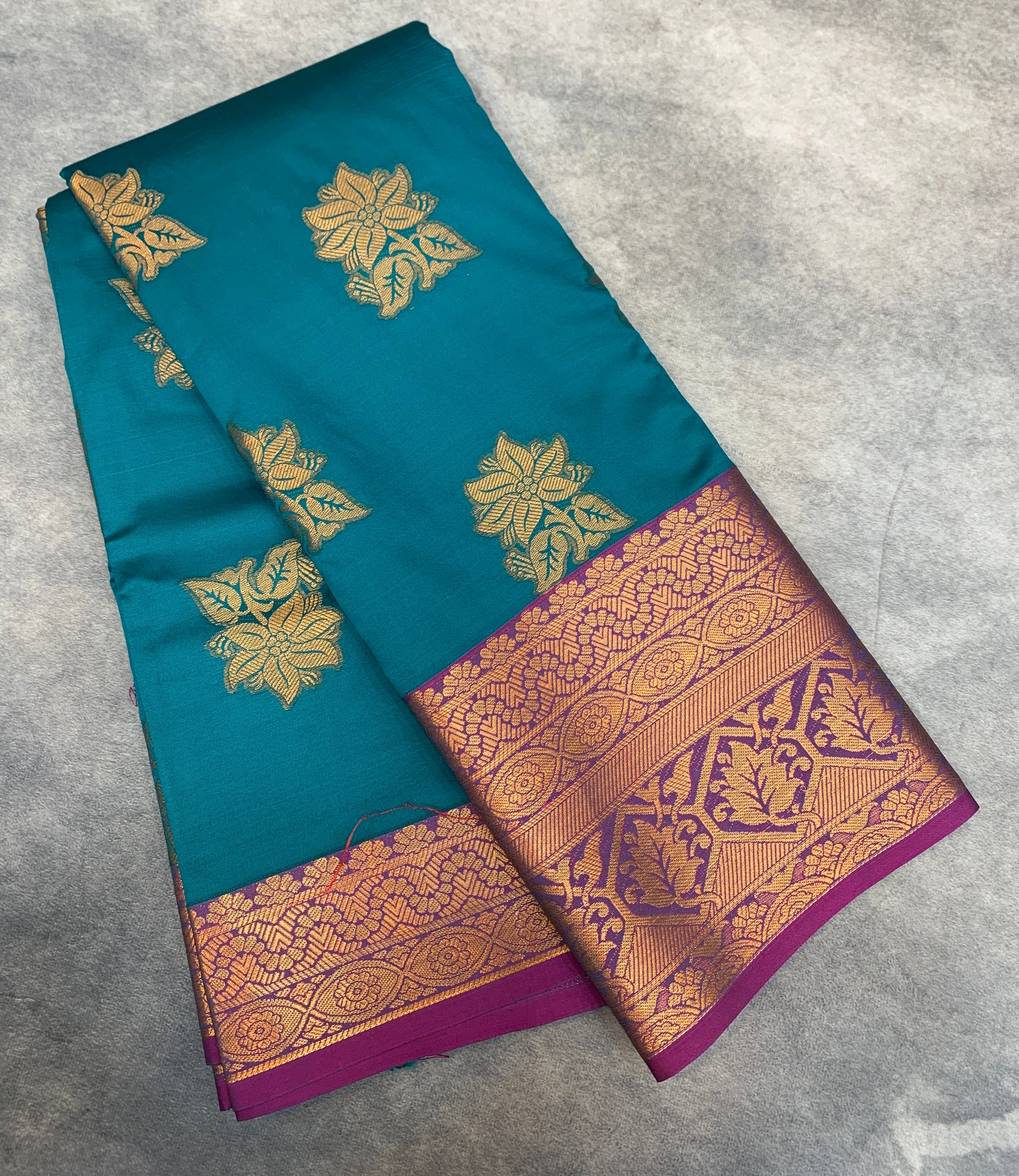 Soft Silk Casual Saree Peacock Green Colour with Pink and Golden Colour Border