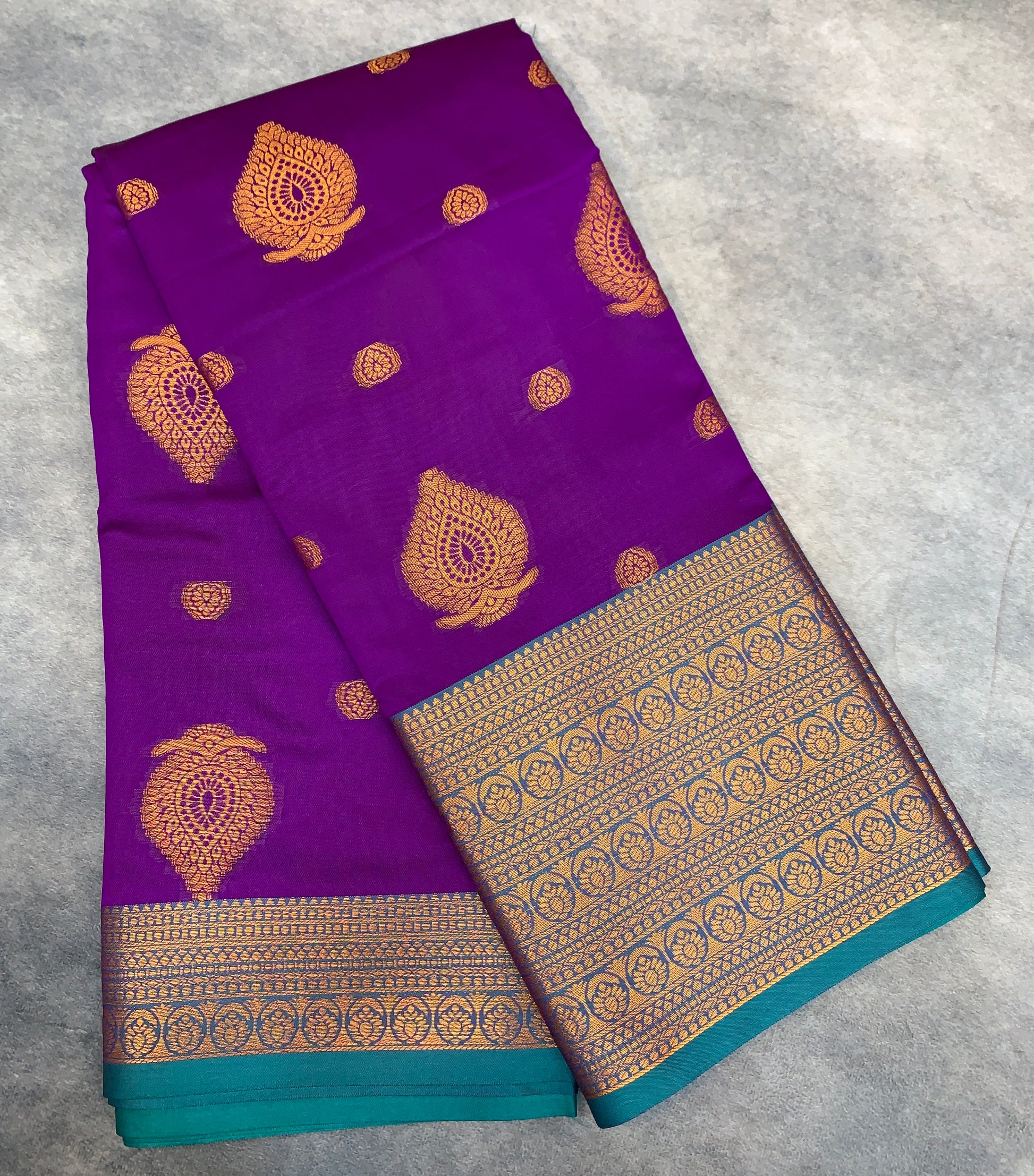 Soft Silk Casual Saree Purple Colour with Rama Green and Golden Colour Border