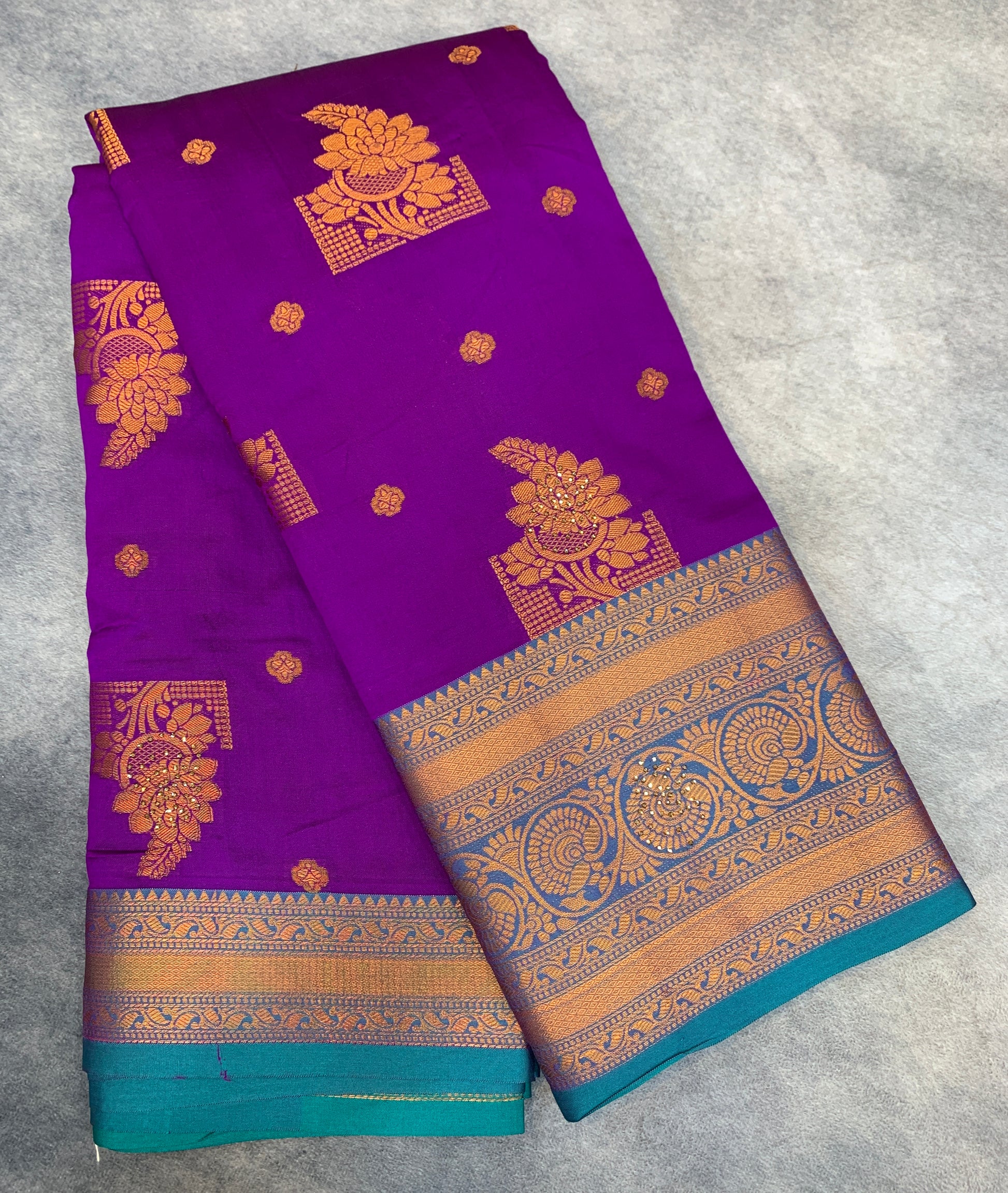 Soft Silk Casual Saree Purple Colour with Rama Green and Golden Colour Border