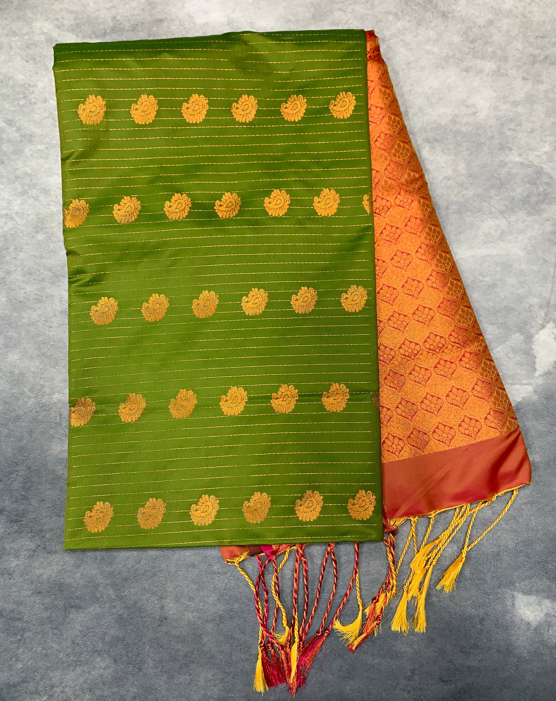 Soft Vegan Silk Saree Olive Green Colour with Light Peach and Copper Border