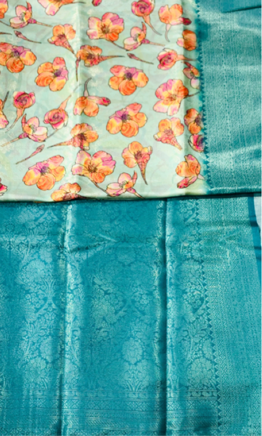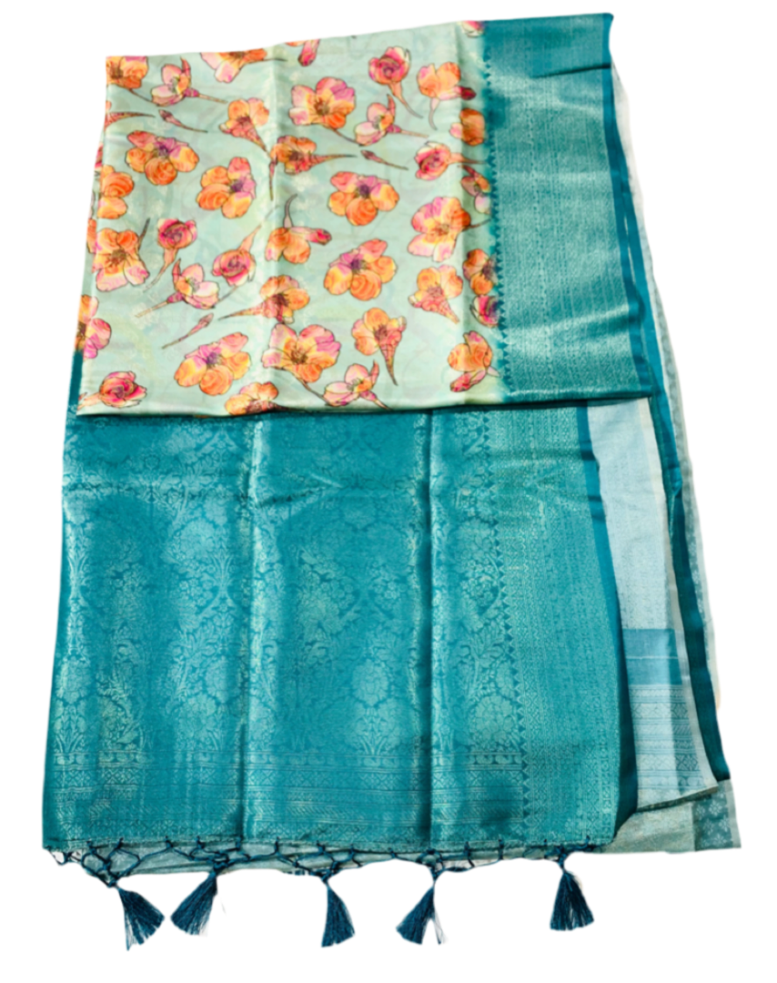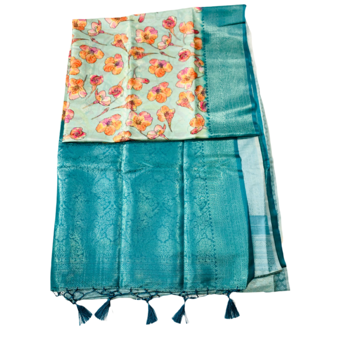 Tussar Colour Digital Print silk saree with Aqua Blue Border.