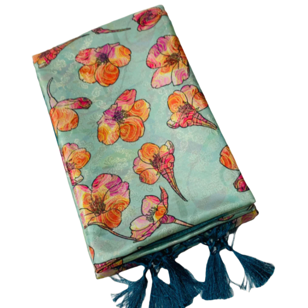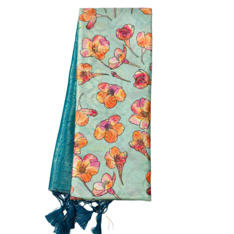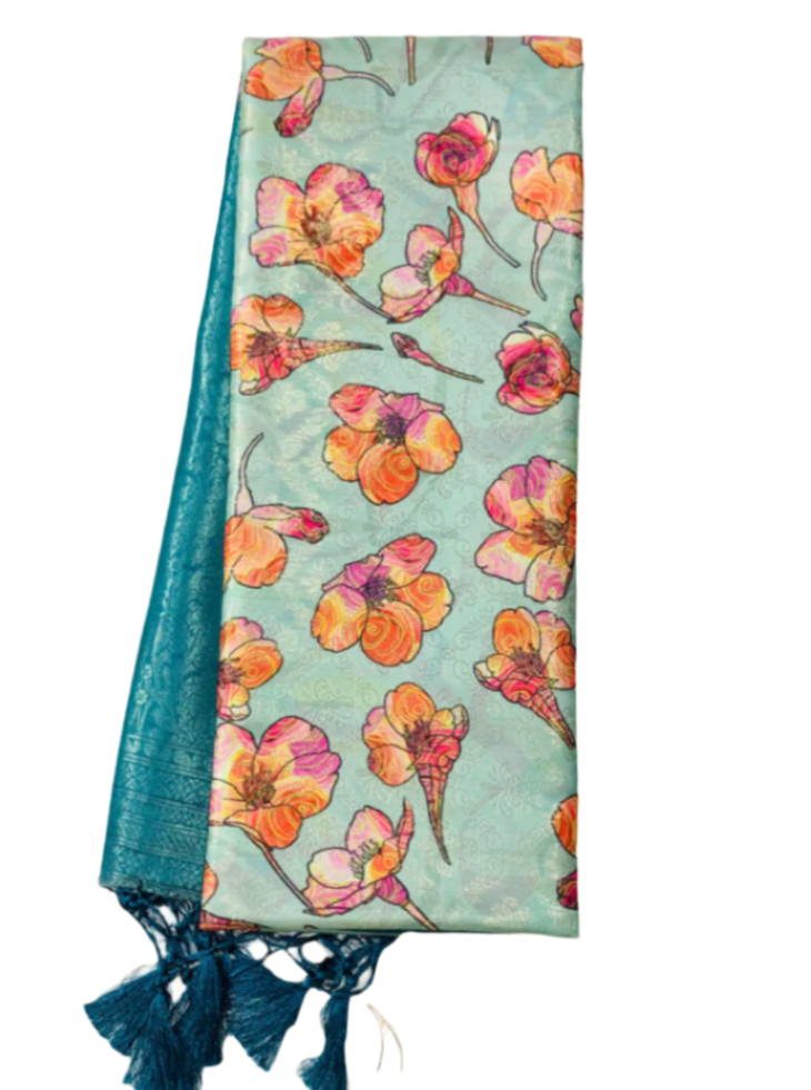Attractive Tussar colour Digital Print silk saree with flower. Aqua Blue Border.light weight to easy wash.