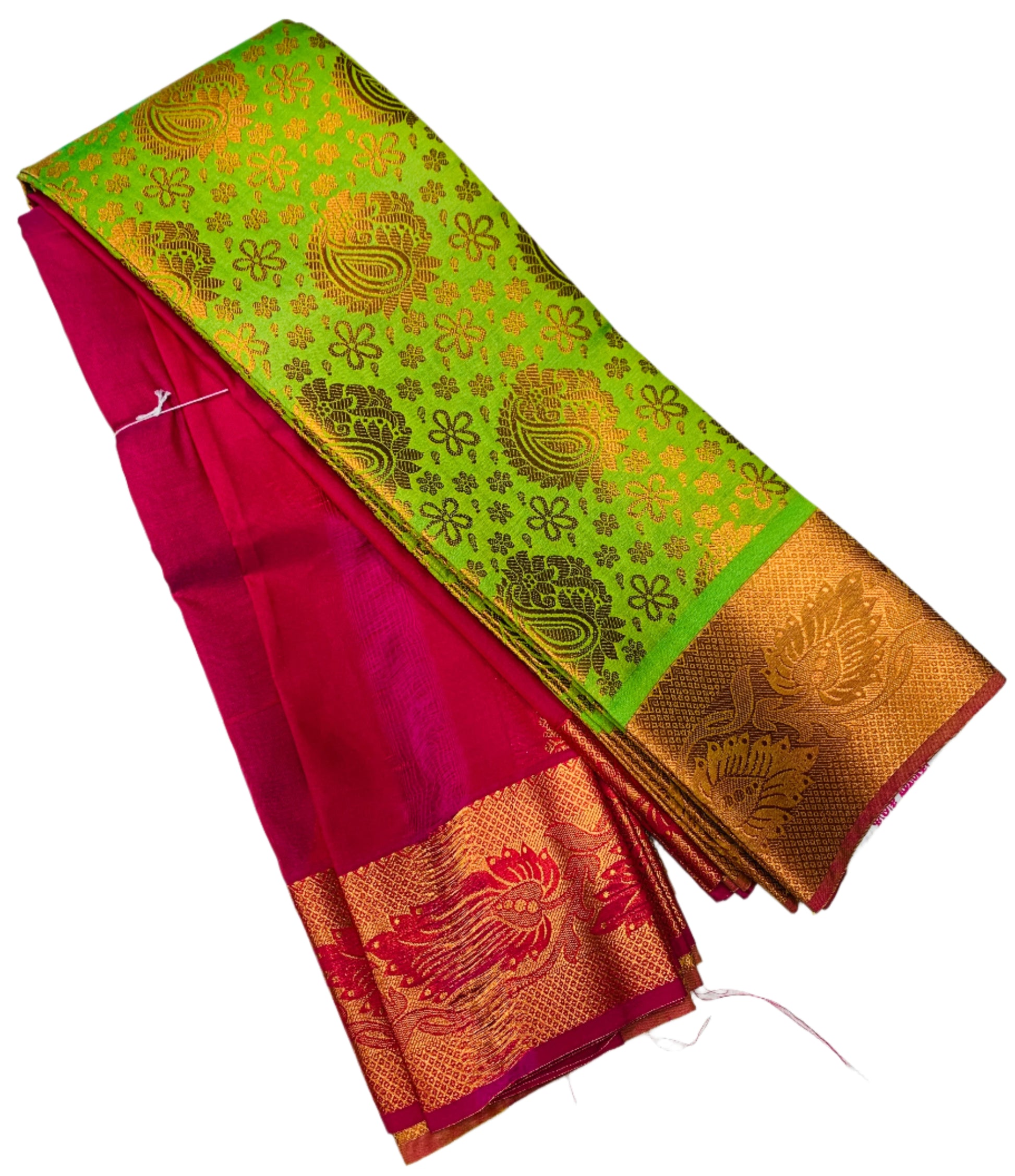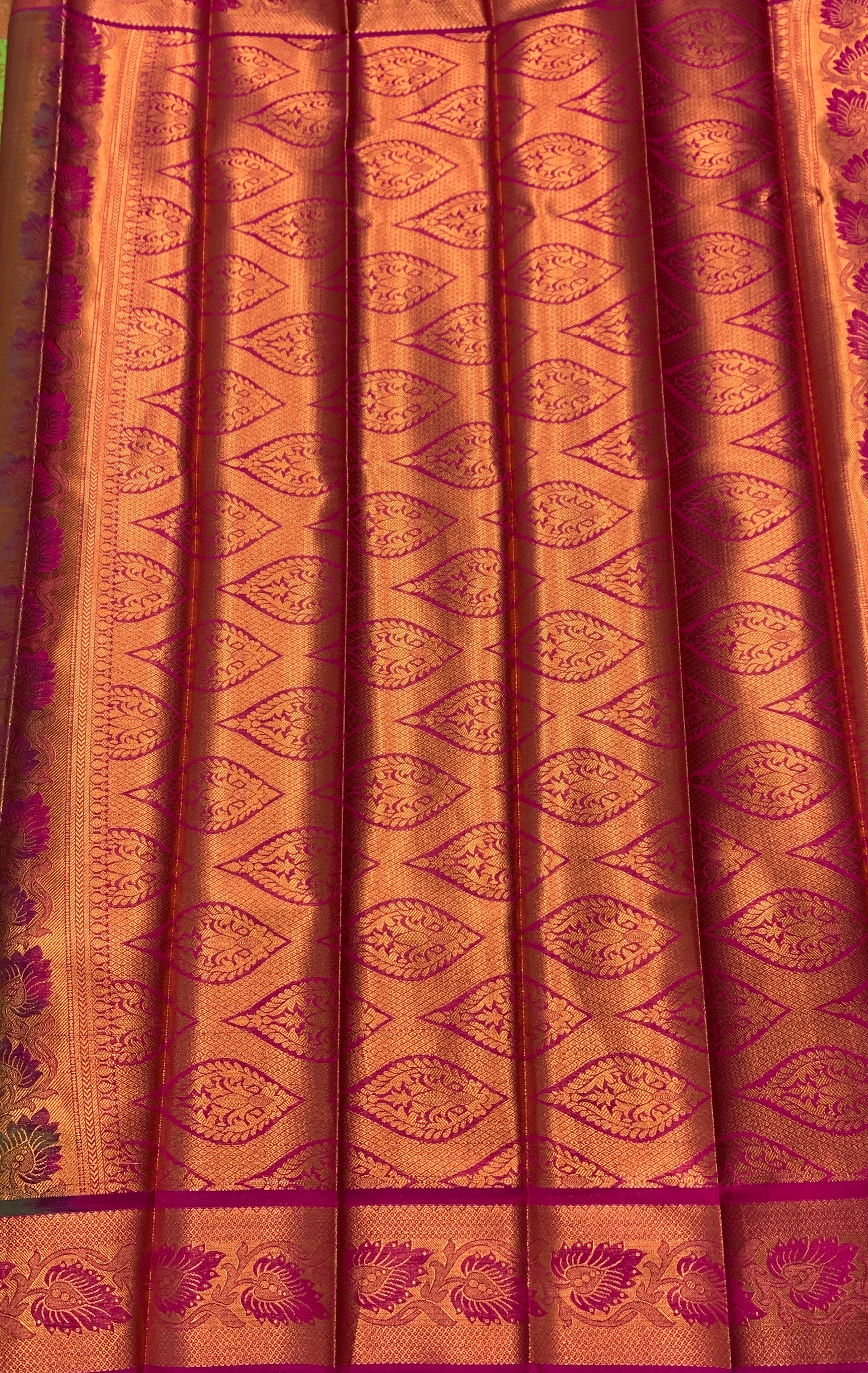 Vegan Silk Saree Apple Green Colour with Mango design. Copper and Pink border with floral design.