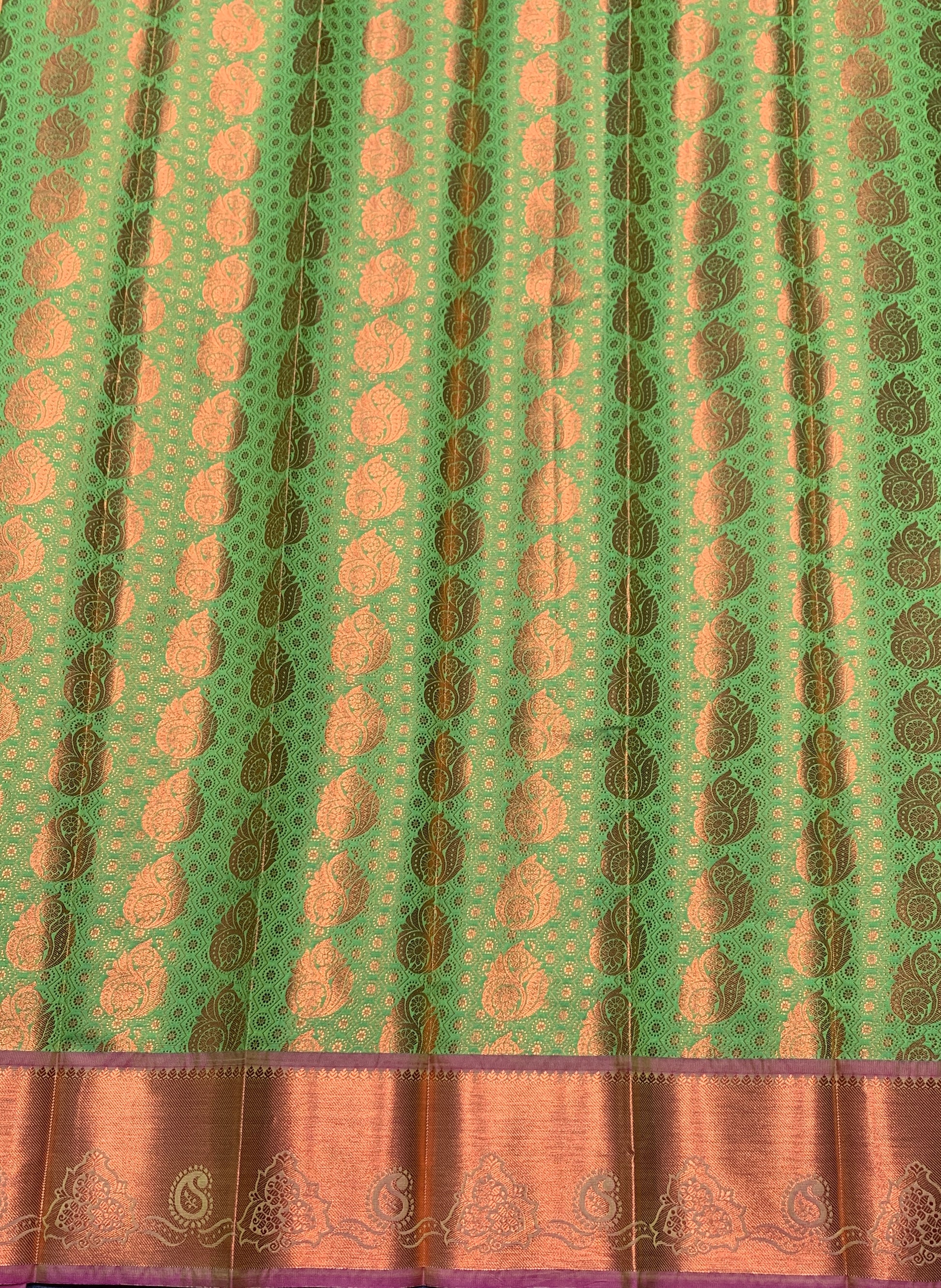 Vegan Silk Saree Apple Green Colour with Pink and Copper Border