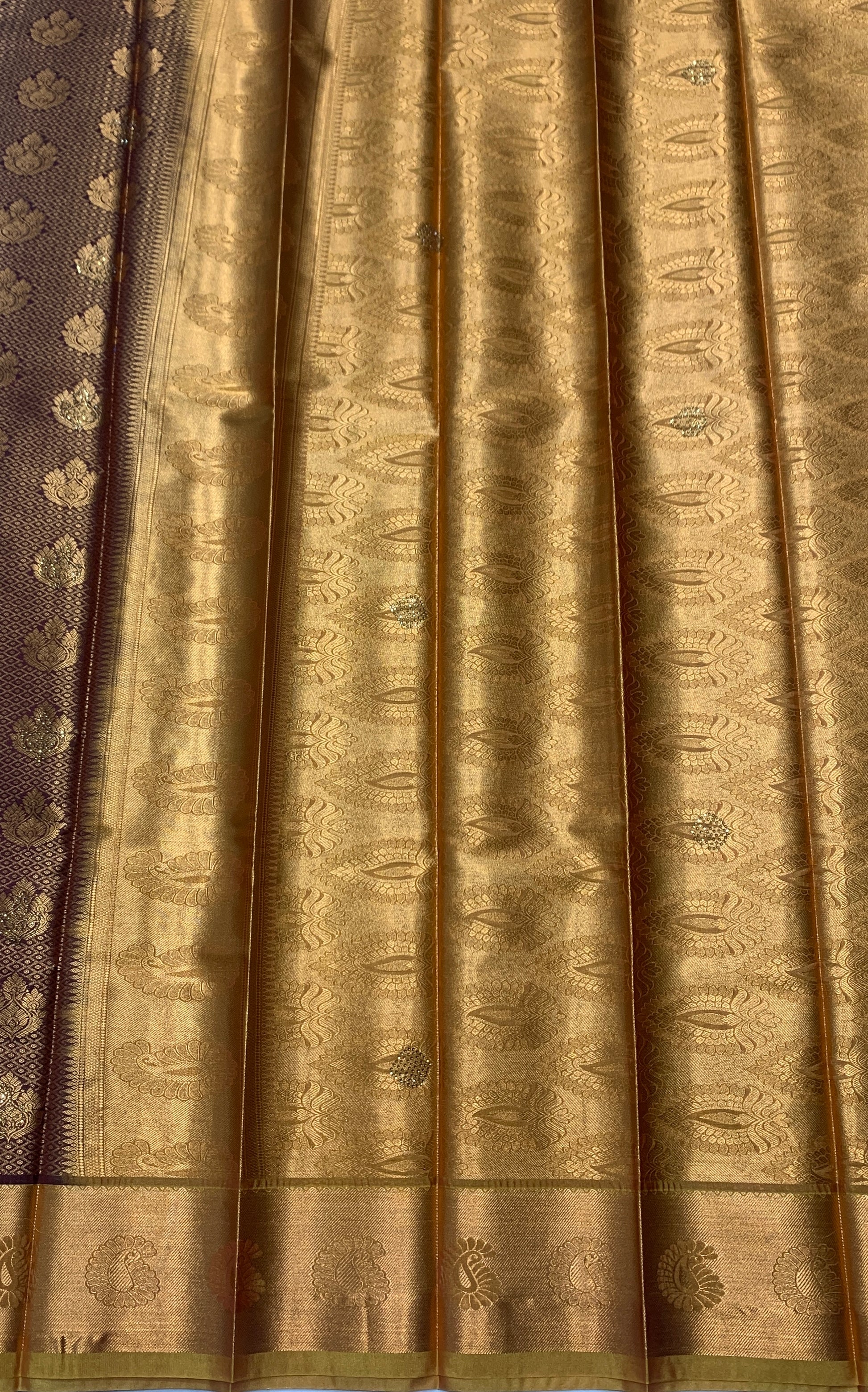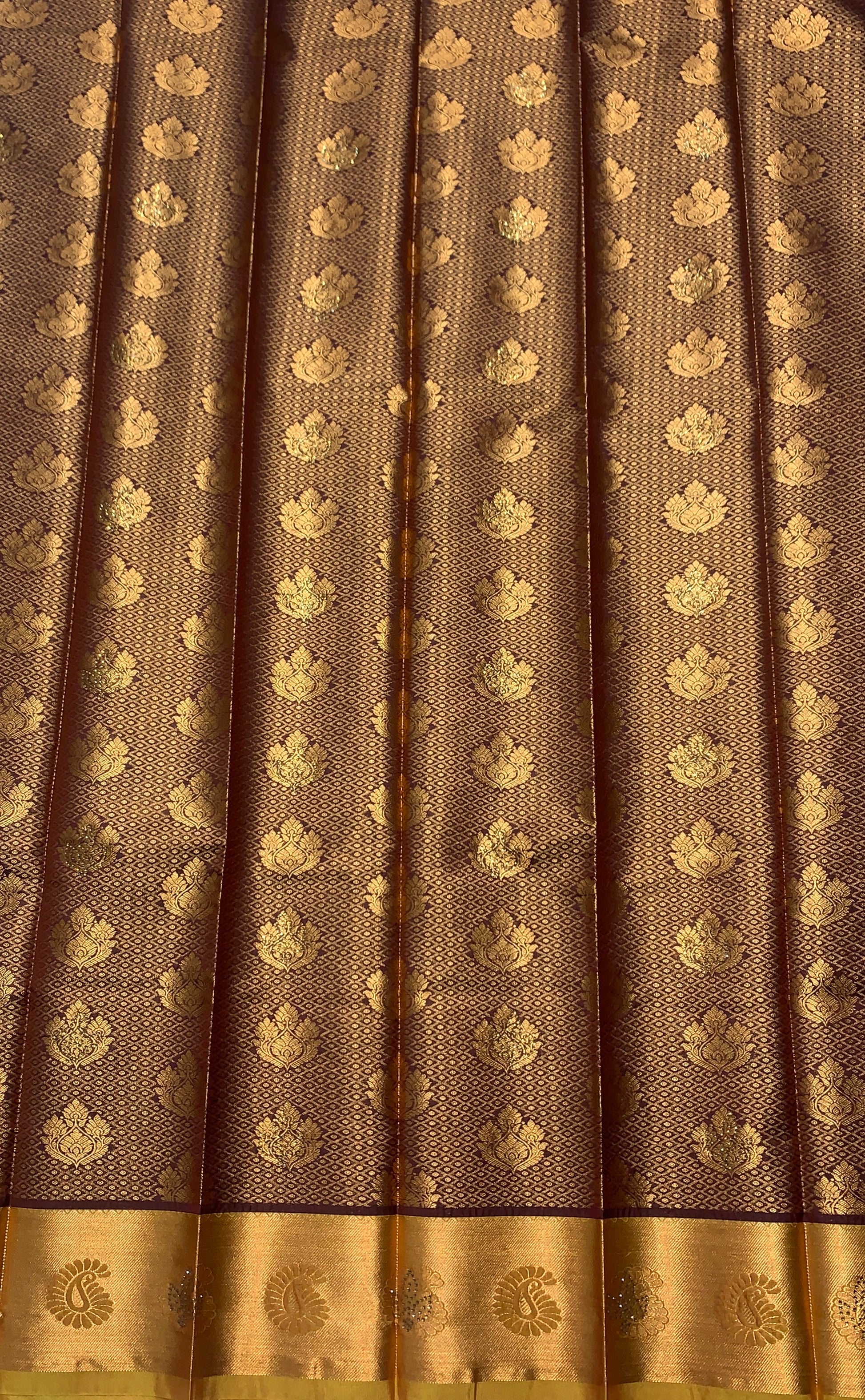 Bridal Vegan Silk Saree Brown Colour and floral design. Copper and Mustard Border with Floral design. Dry wash only.