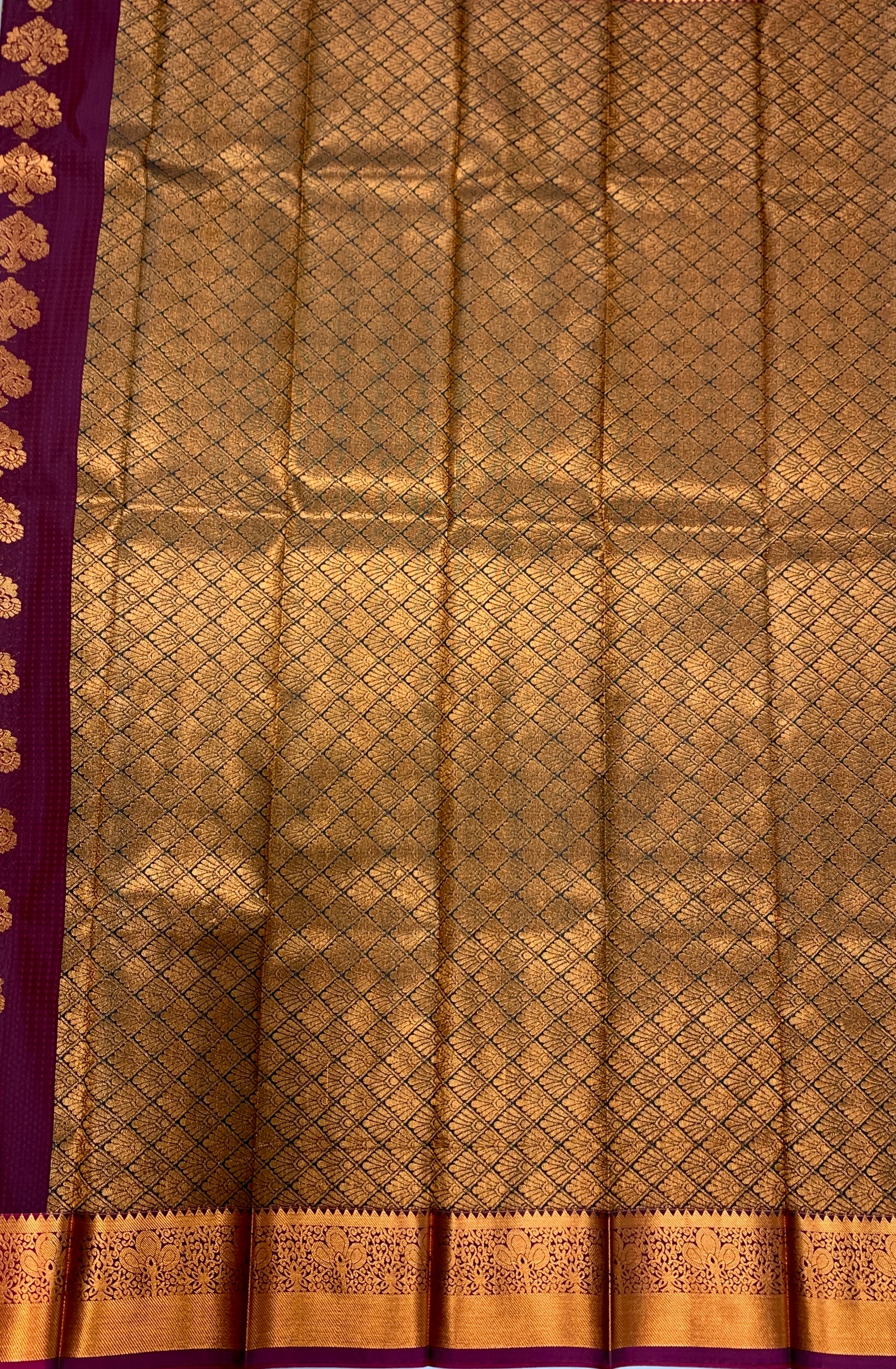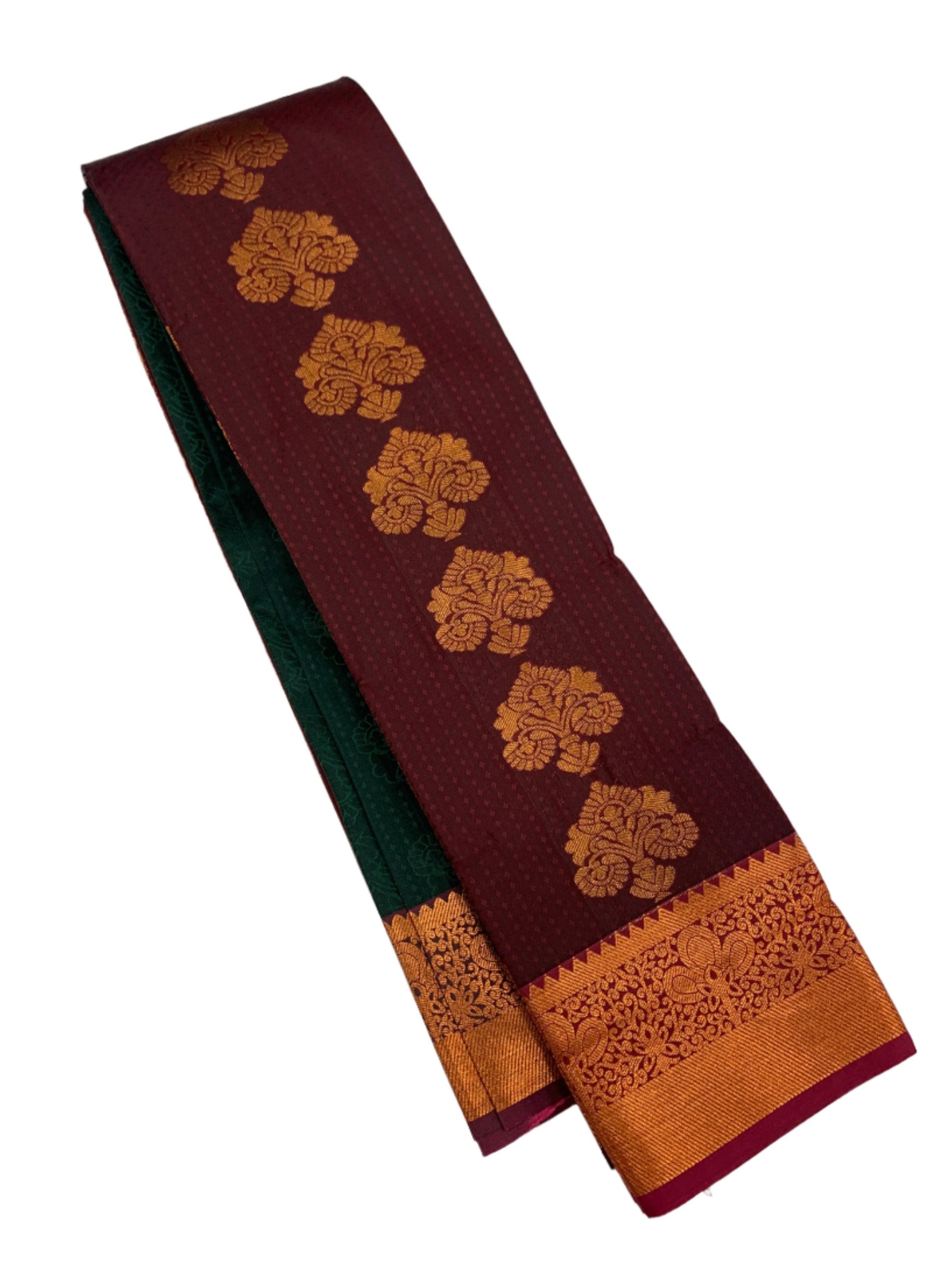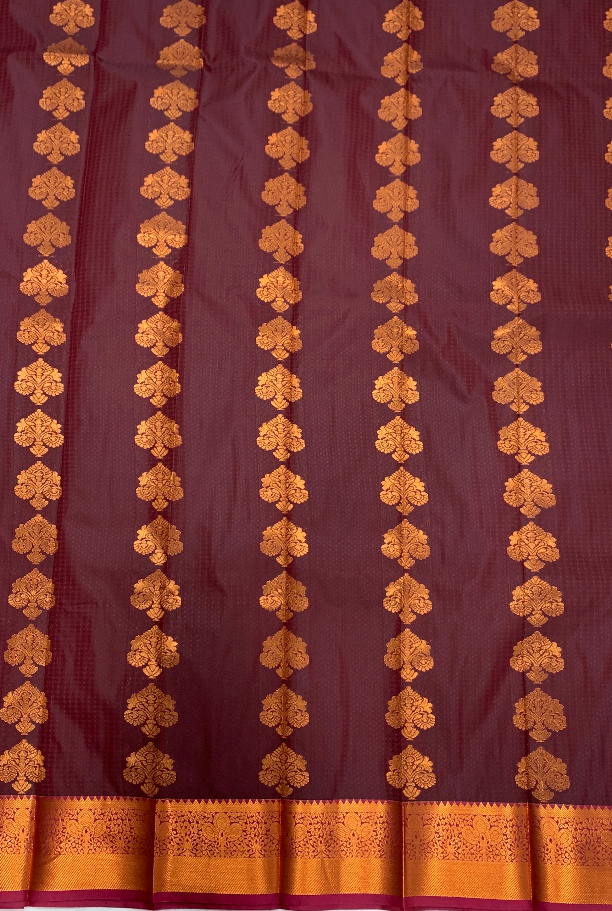 Vegan Silk Saree Brown Colour with flower design. Copper Border with Flower design. Dry wash only.