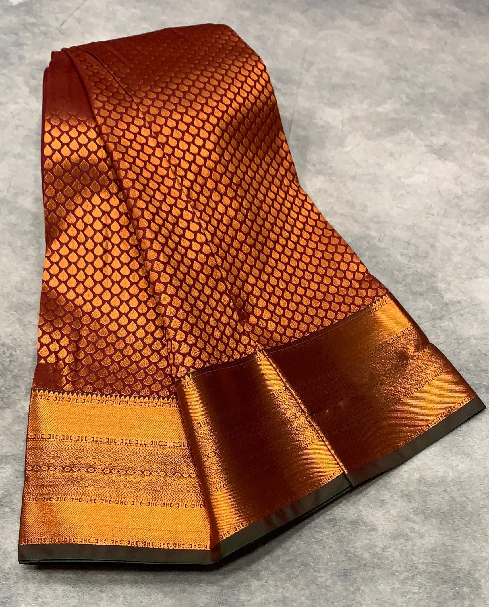Vegan Silk Saree Brown Colour with Olive Green and Copper Border