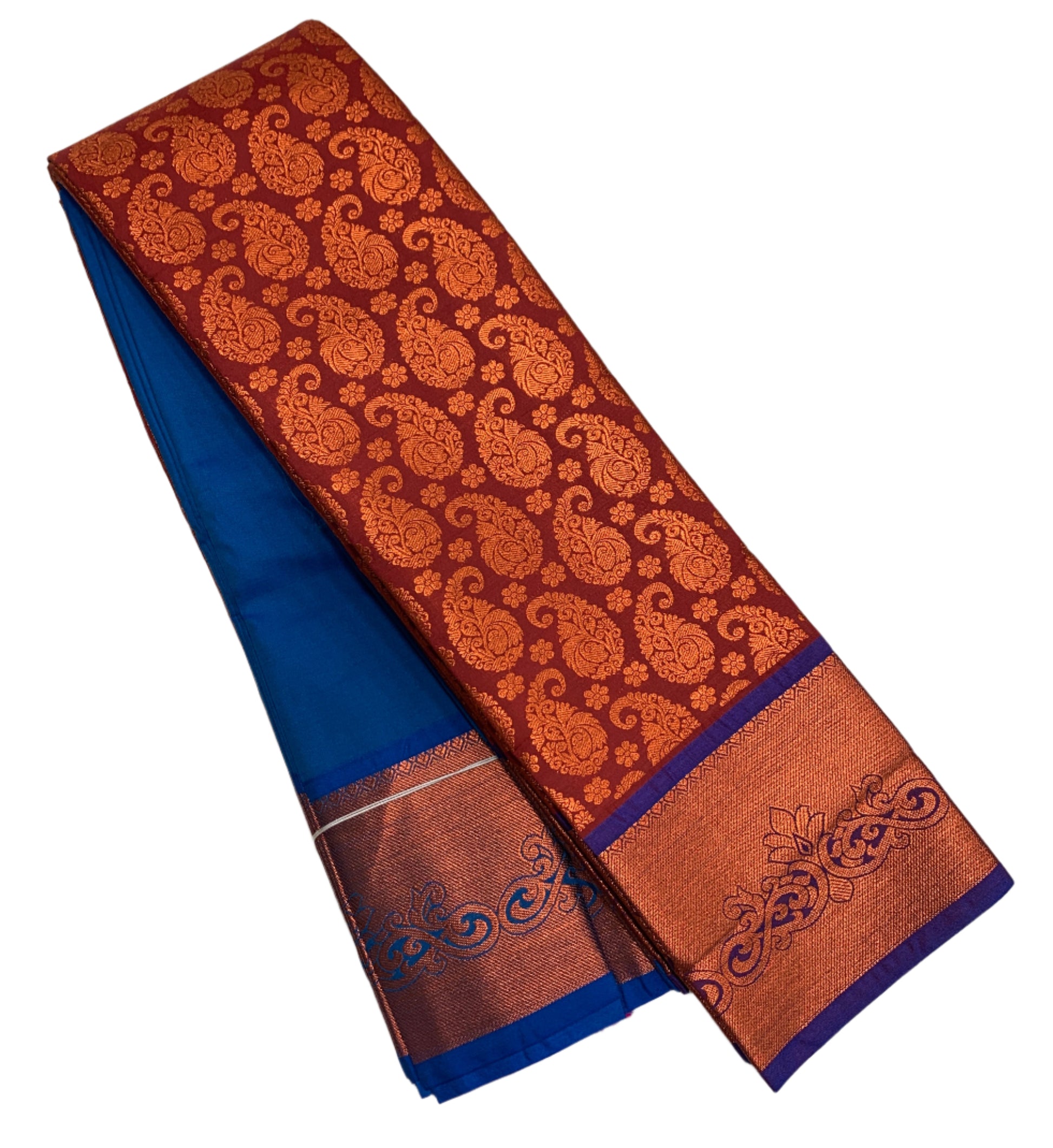 Vegan Silk Saree Dark Maroon Colour with Copper and Blue Border