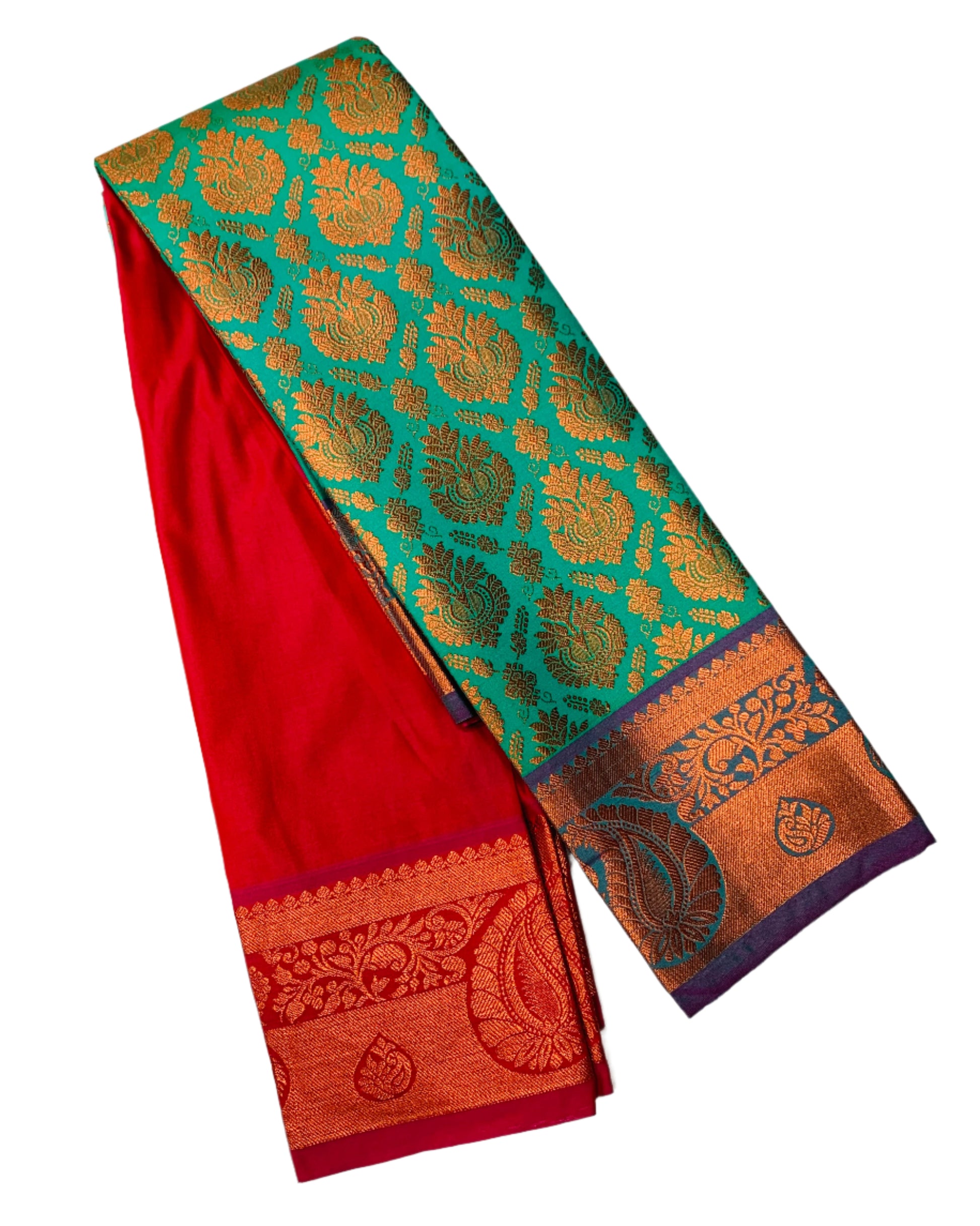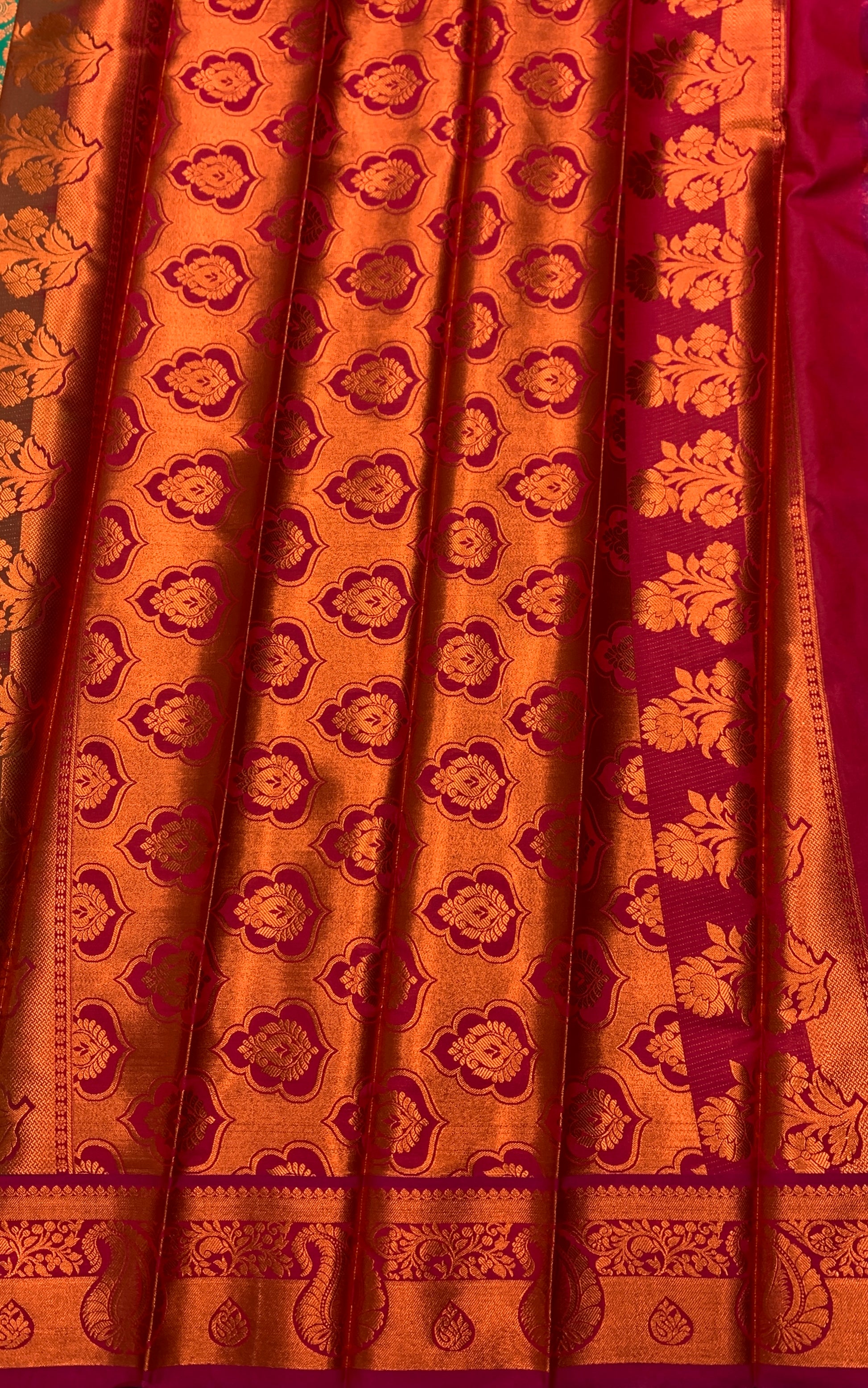 Vegan Silk Saree Vegan Silk Saree Green Colour with Copper and Magenta Border.