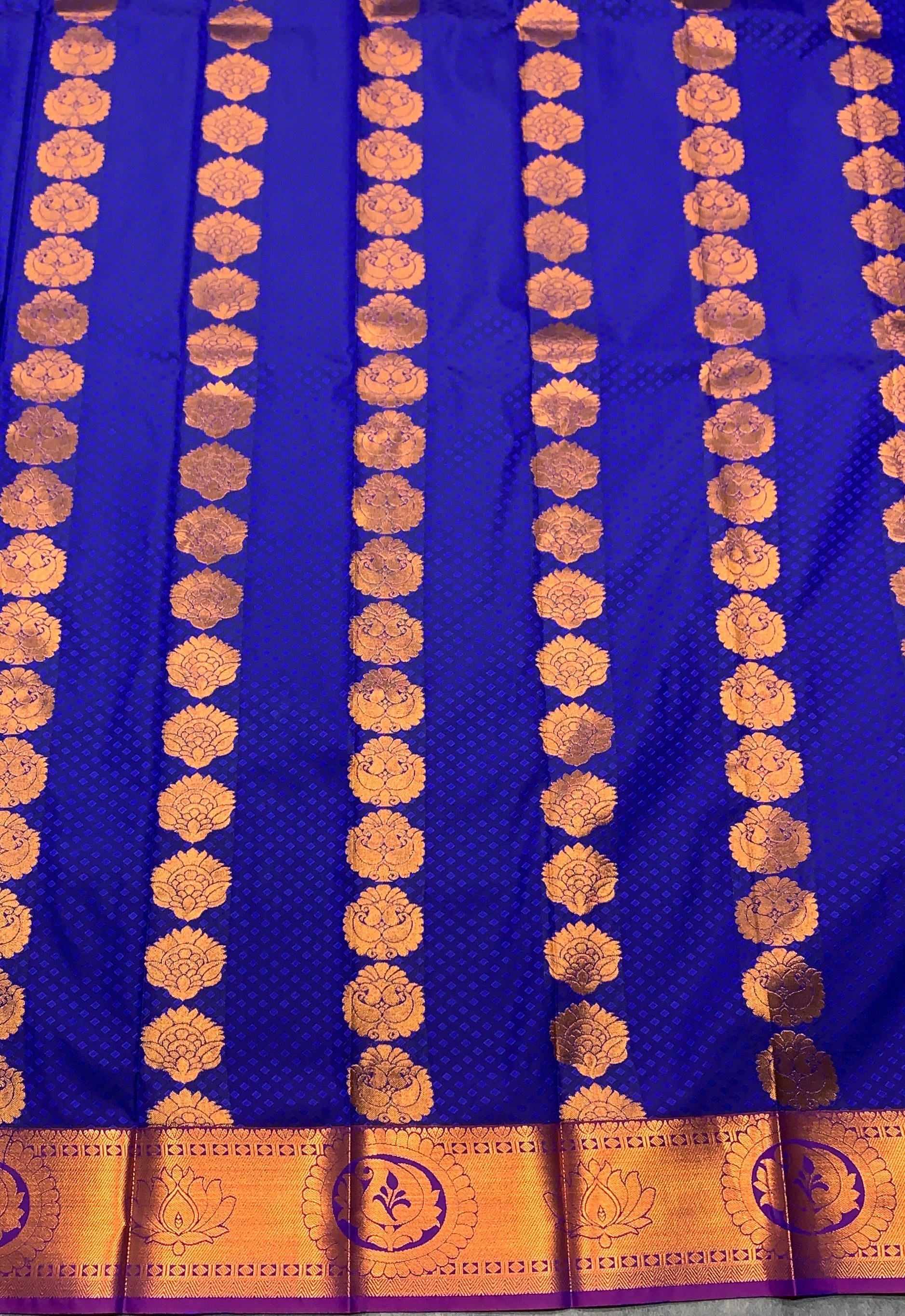 Vegan Silk Saree Ink Blue Colour with flower design. Copper Border with Flower design.