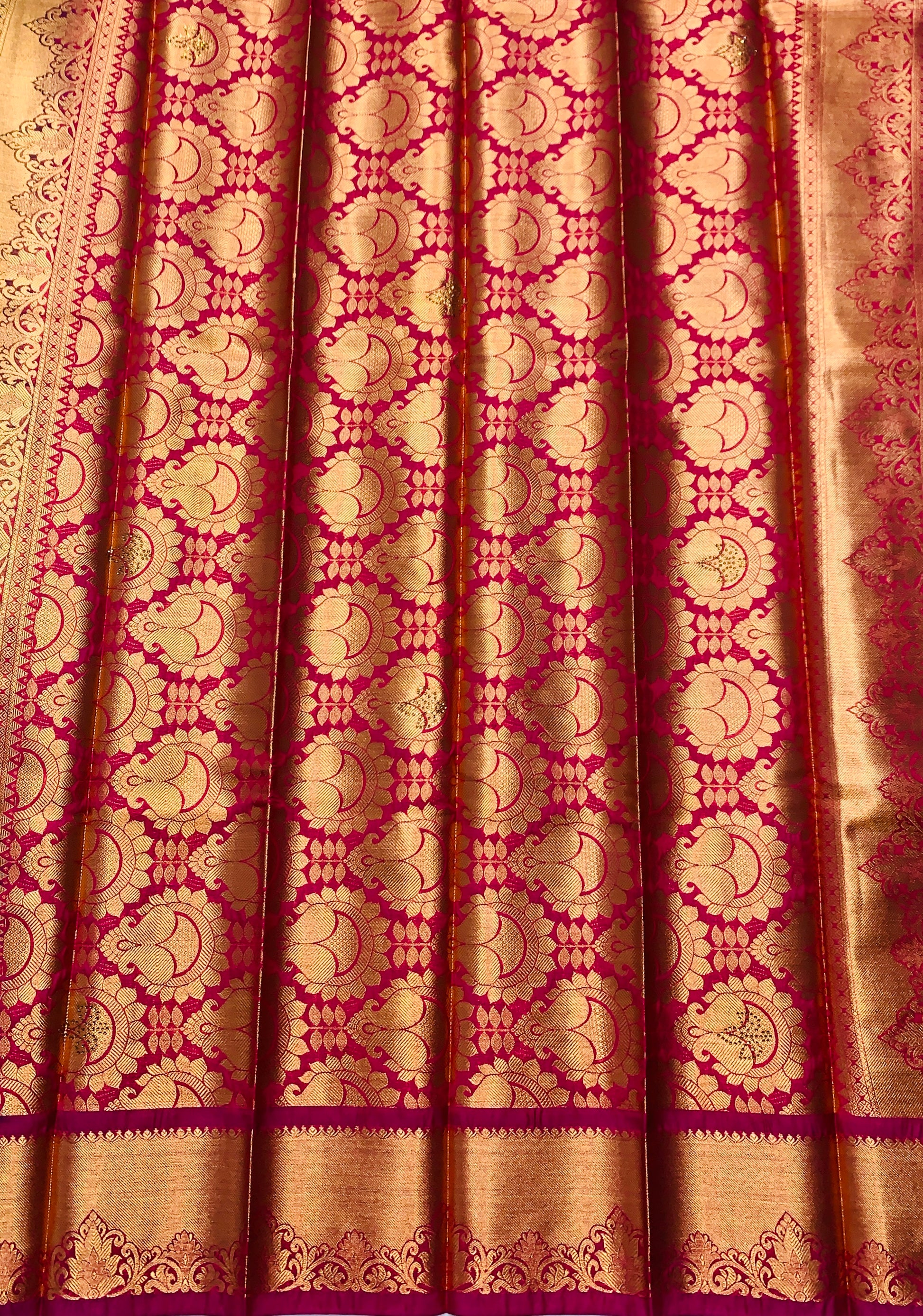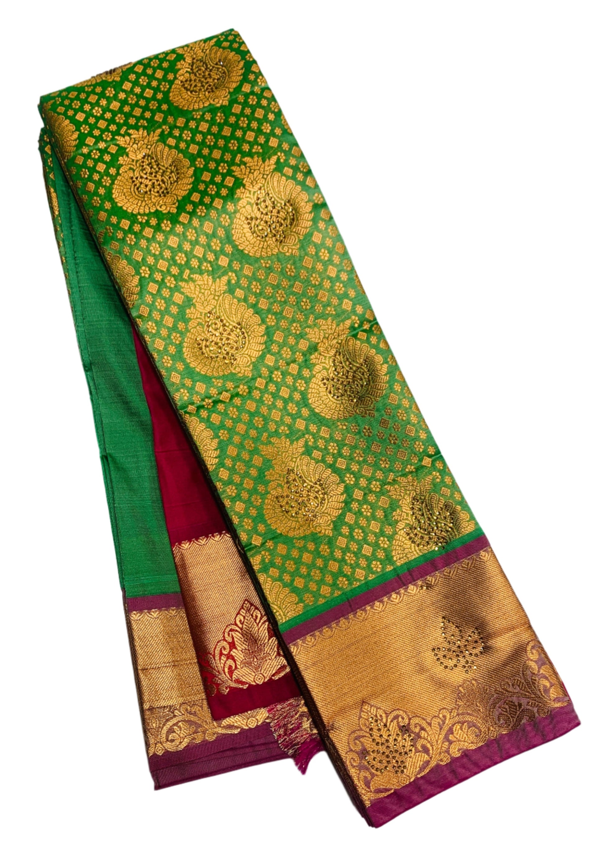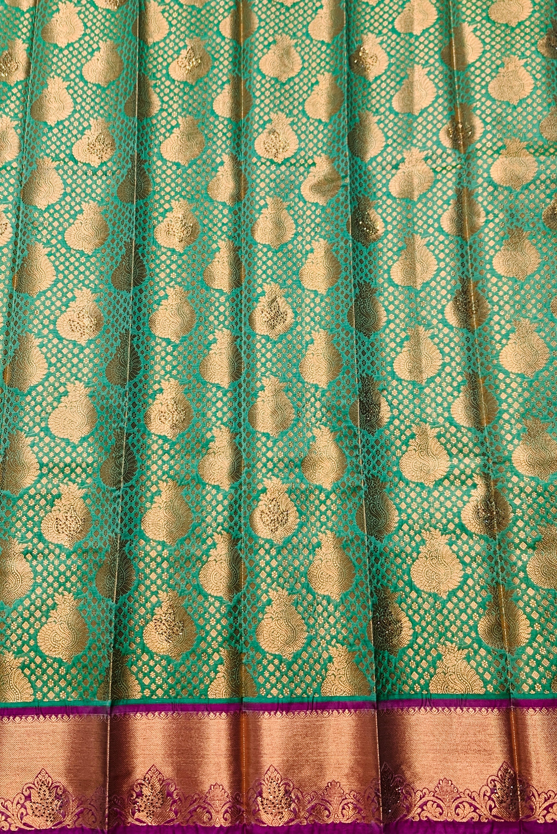 Bridal Vegan Silk Saree Light Green Colour and floral design. Copper and Pink Border with Floral design. Dry wash only.