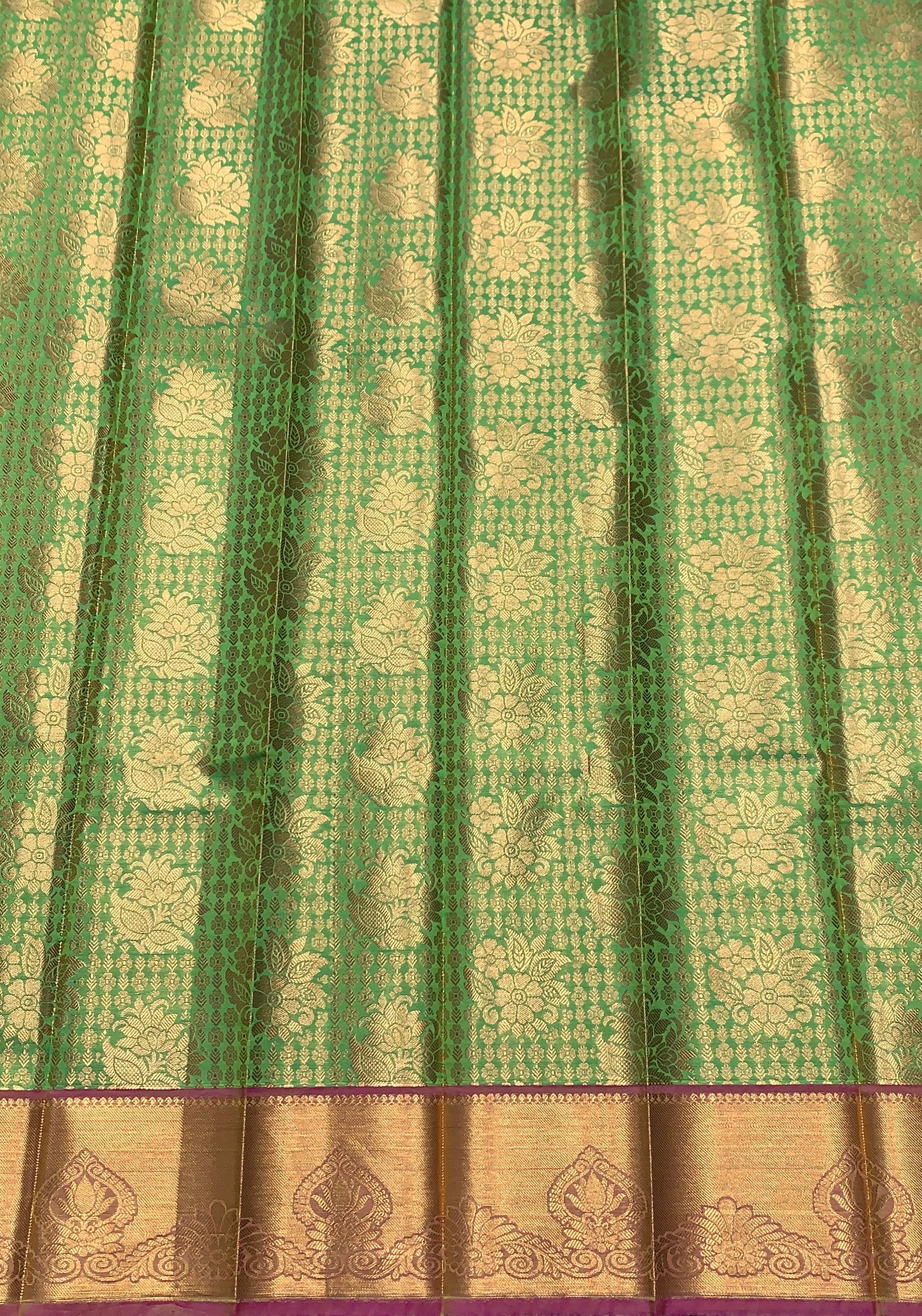 Vegan Silk Saree Light Green Colour with Pink and Copper Border
