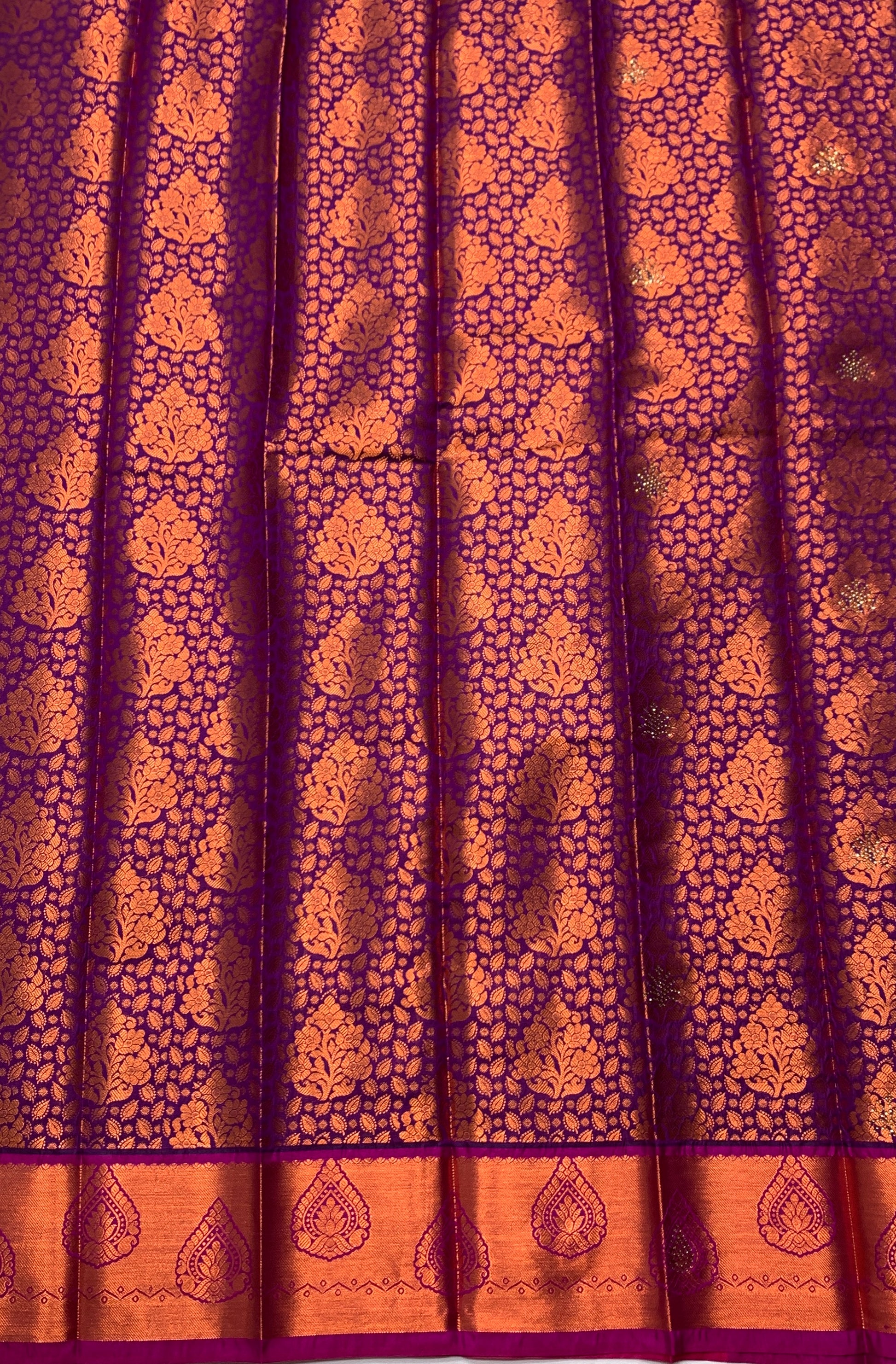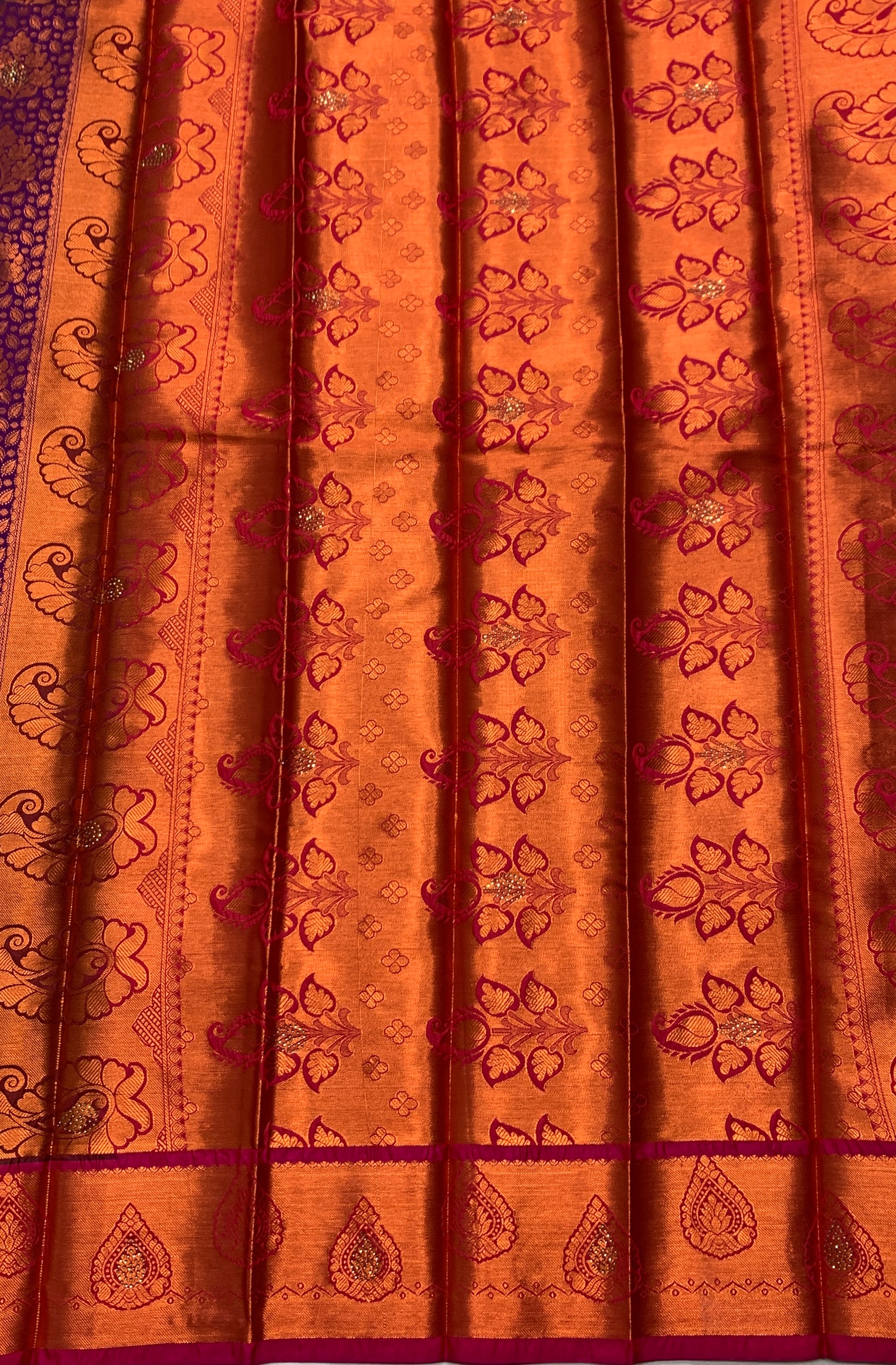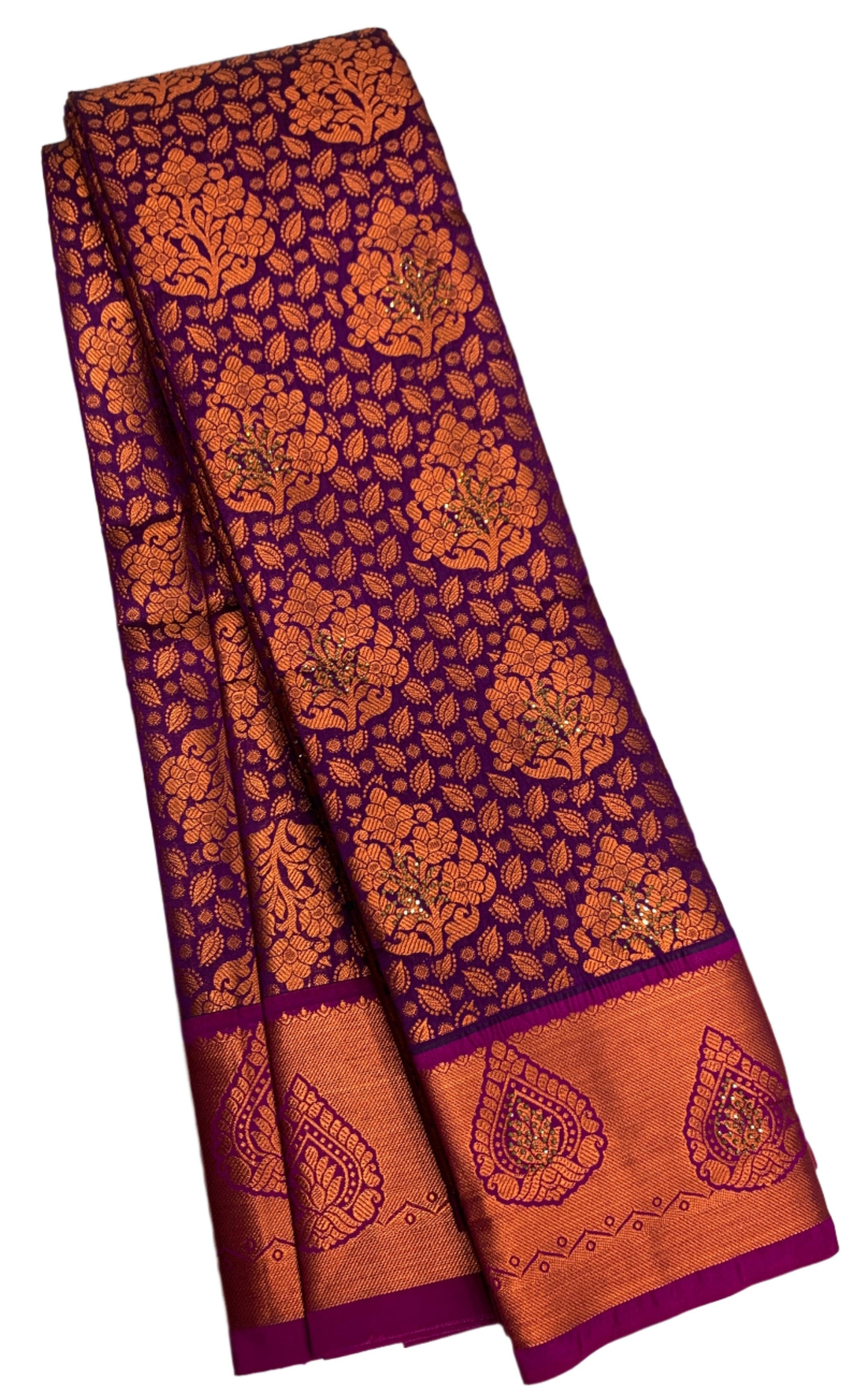 Bridal Vegan Silk Saree Magenta Colour and floral design. Copper and Purple Border with Floral design. Dry wash only.