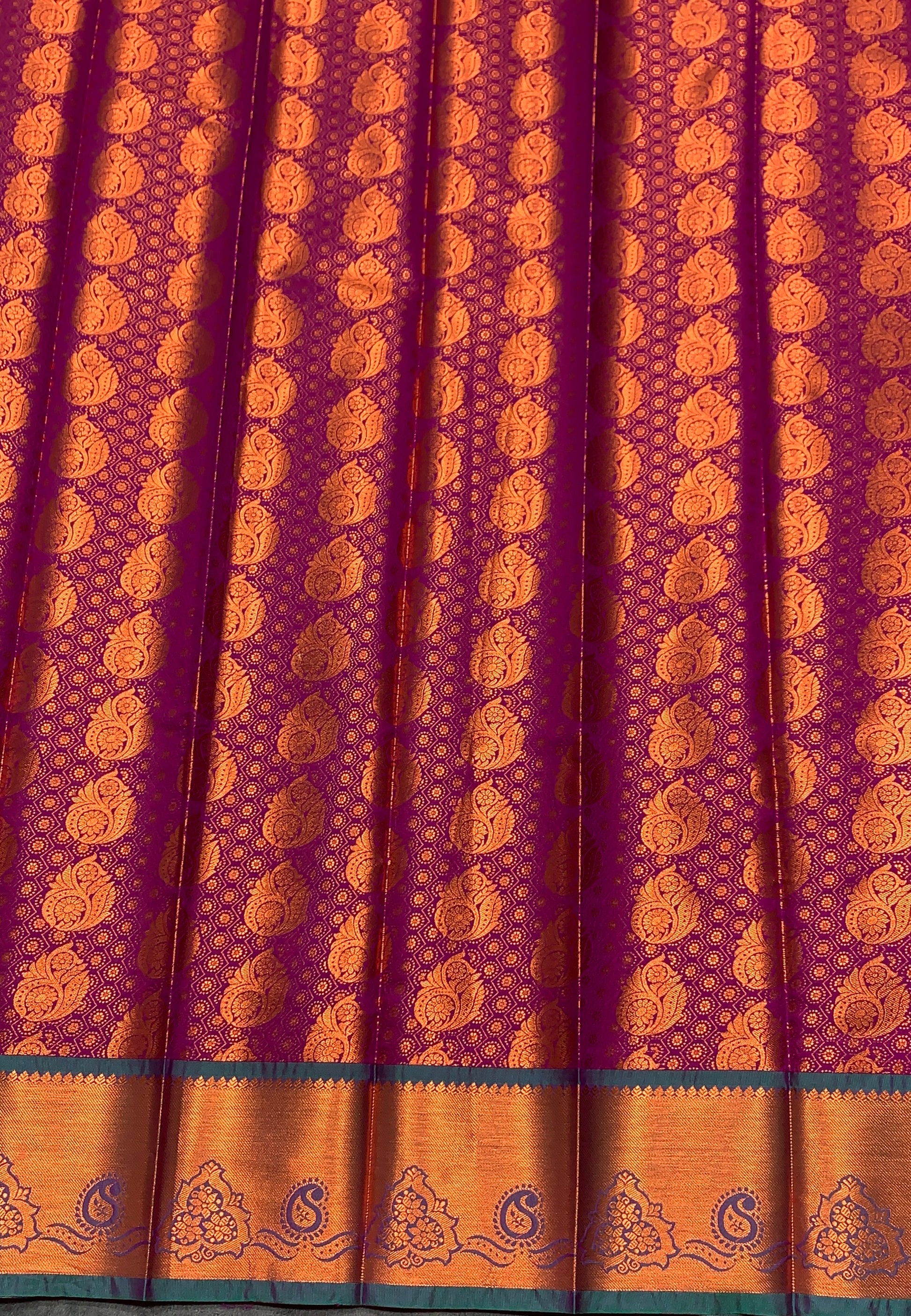Vegan Silk Saree Magenta Colour with Green and Copper Border