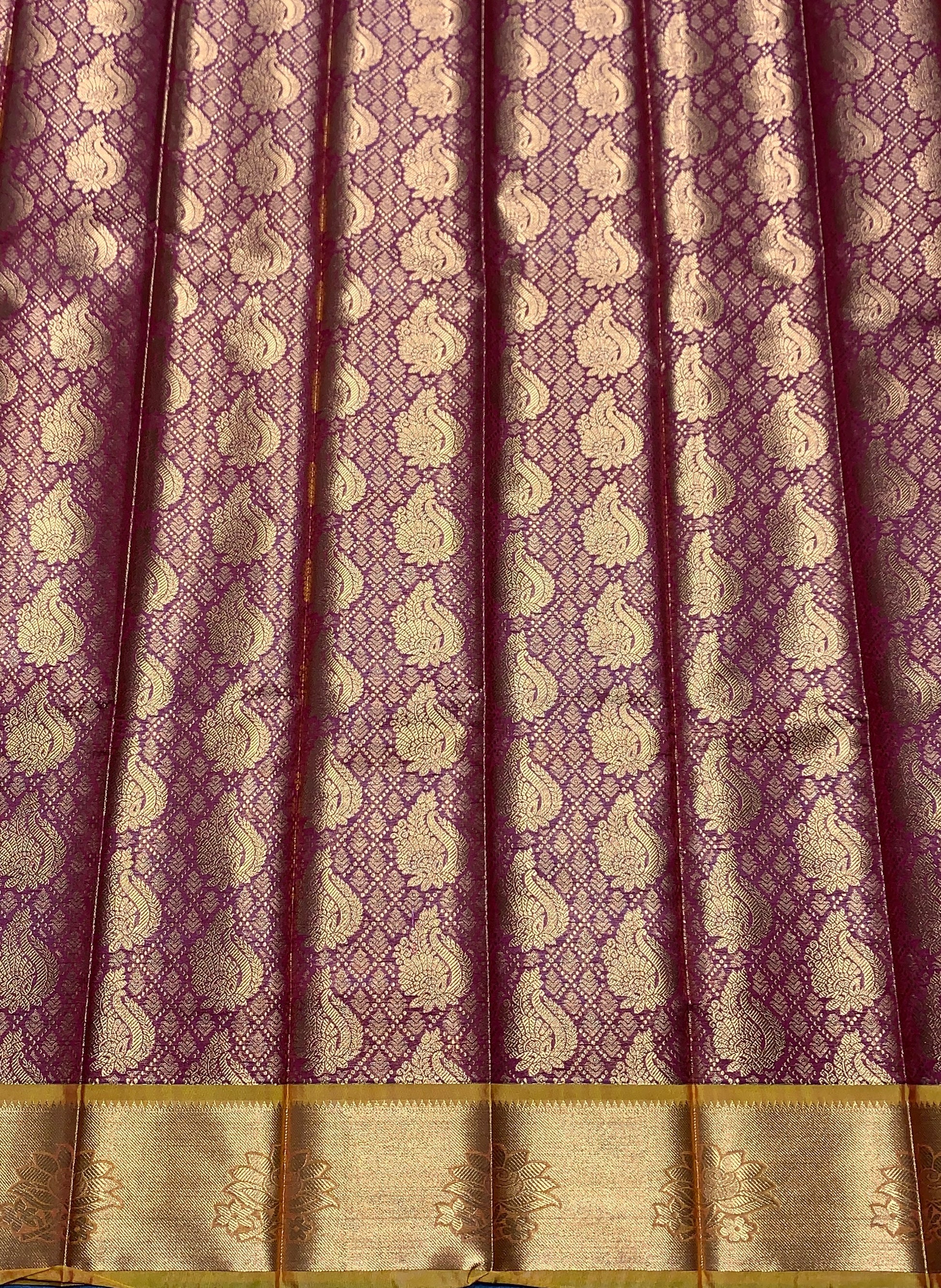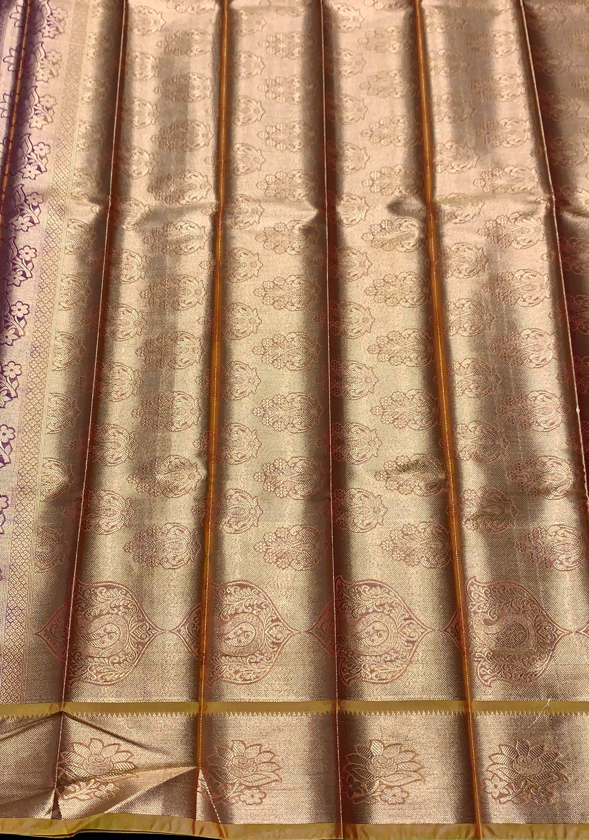 Bridal Vegan Silk Saree Maroon Colour and floral design. Copper and Golden Yellow Border with Floral design. Dry wash only.