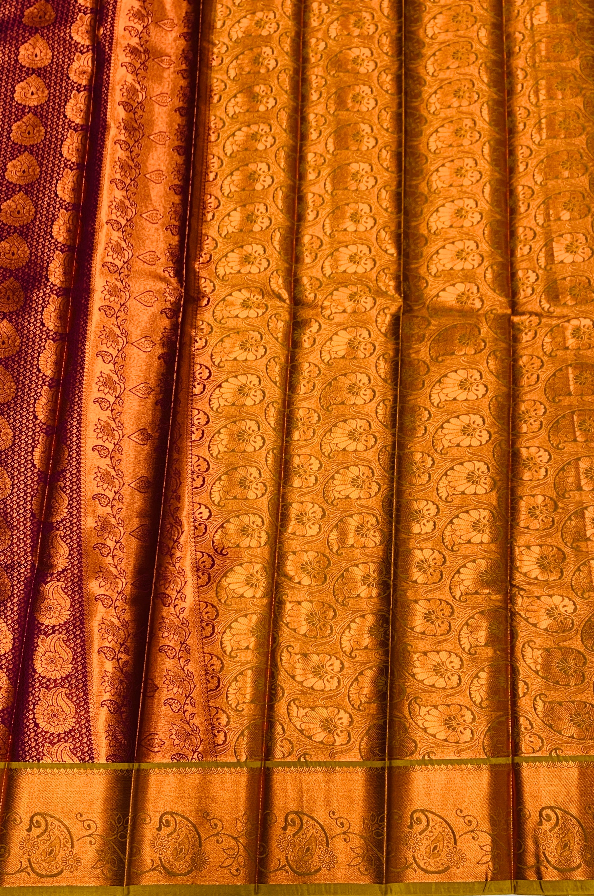 Bridal Vegan Silk Saree Maroon Colour and floral design. Copper and Golden Yellow Border with Floral design. Dry wash only.