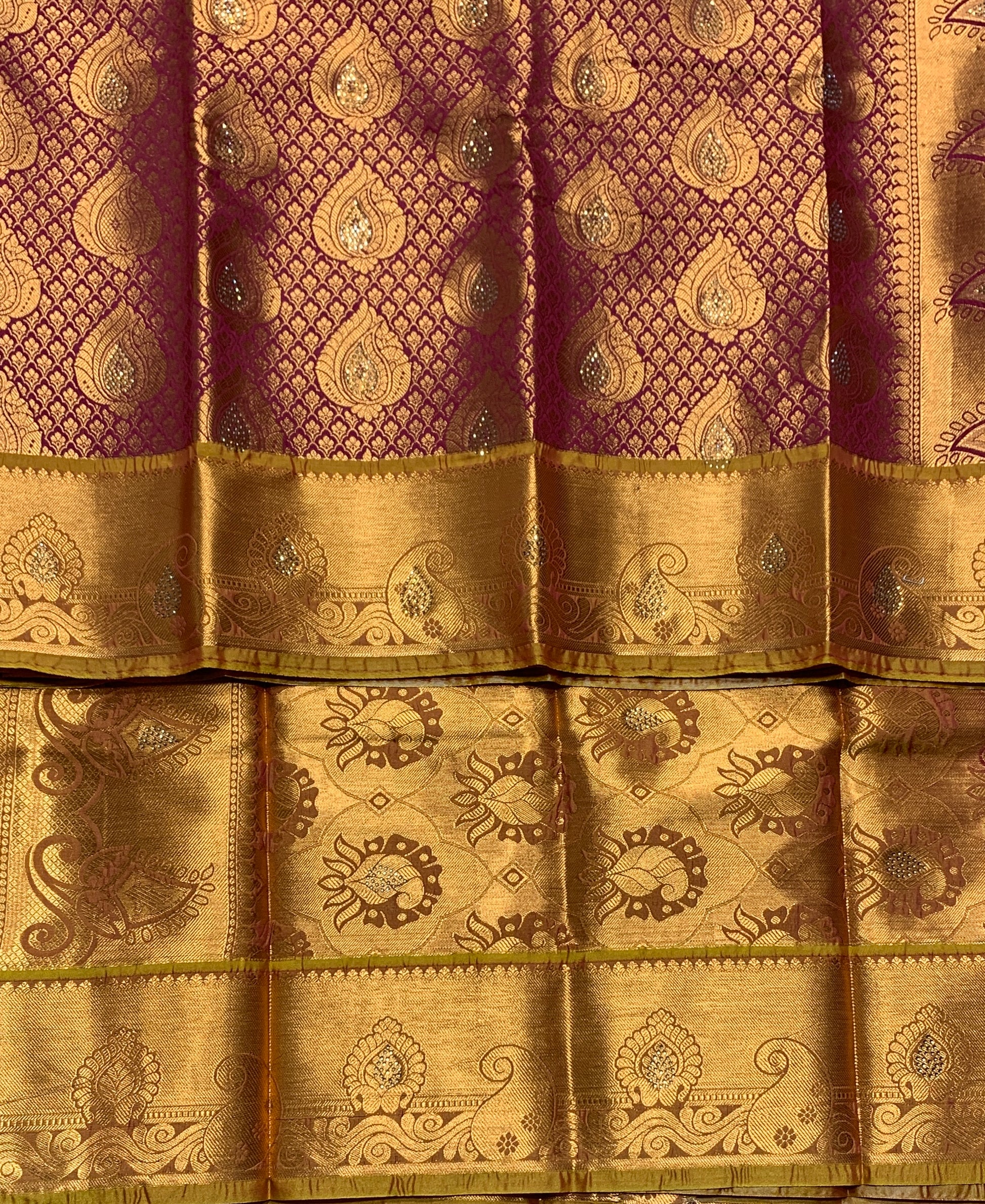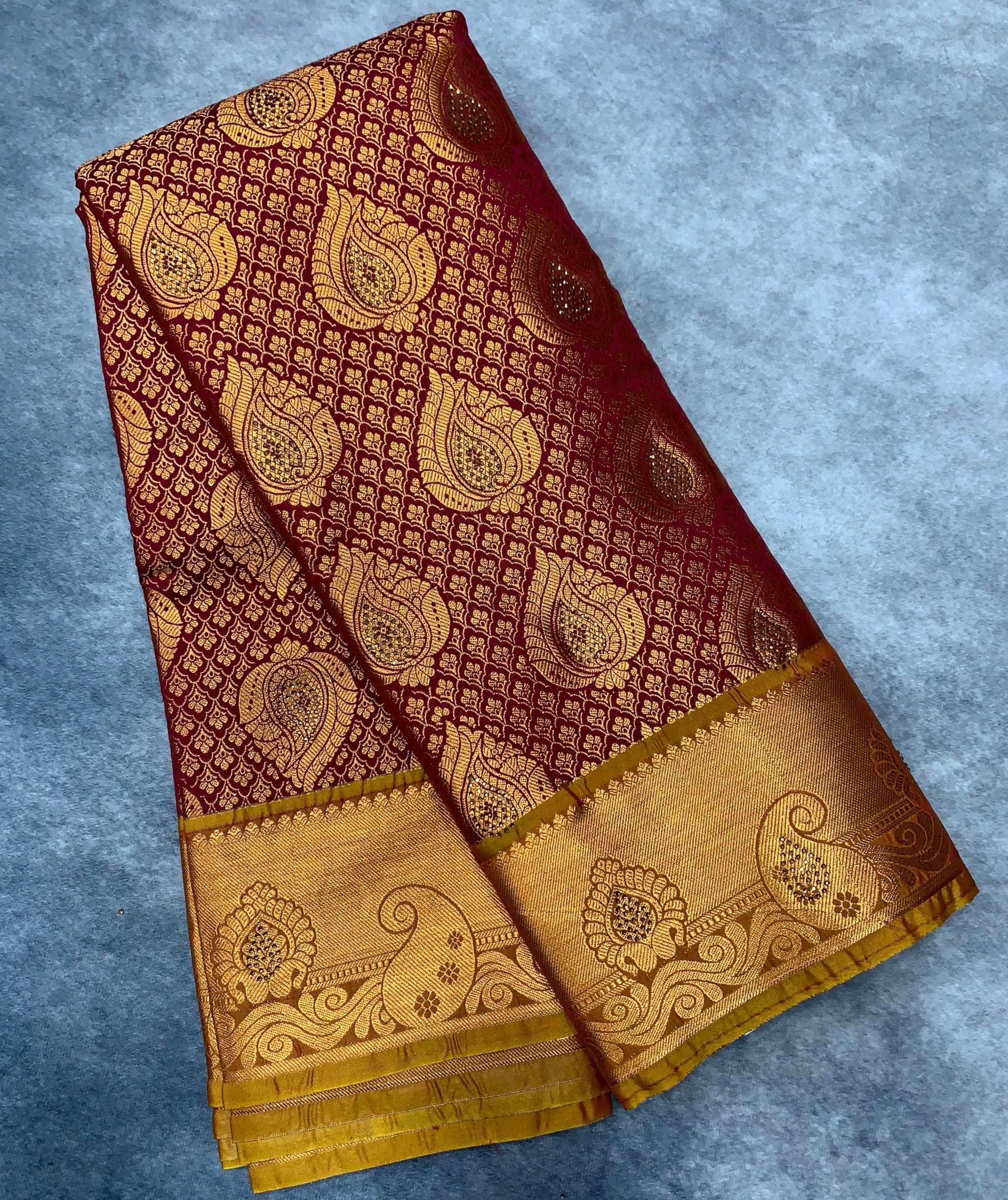 Vegan Silk Saree Maroon Colour with Copper and Golden Yellow Border