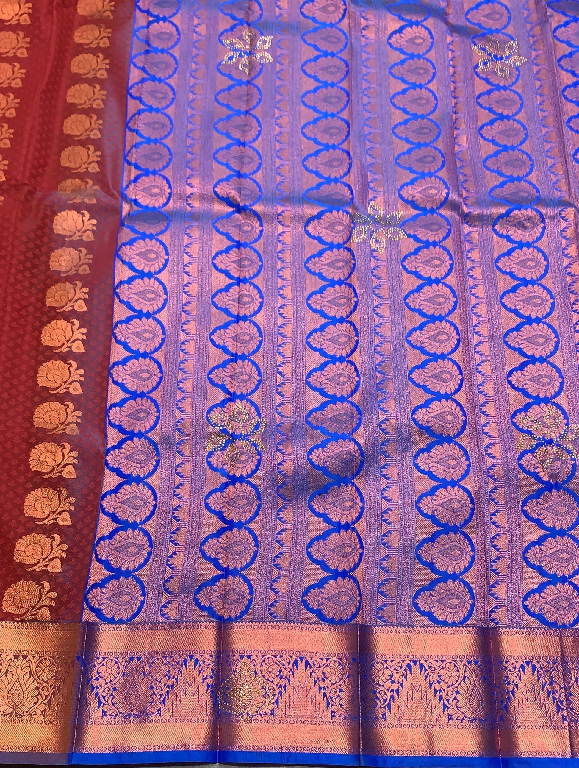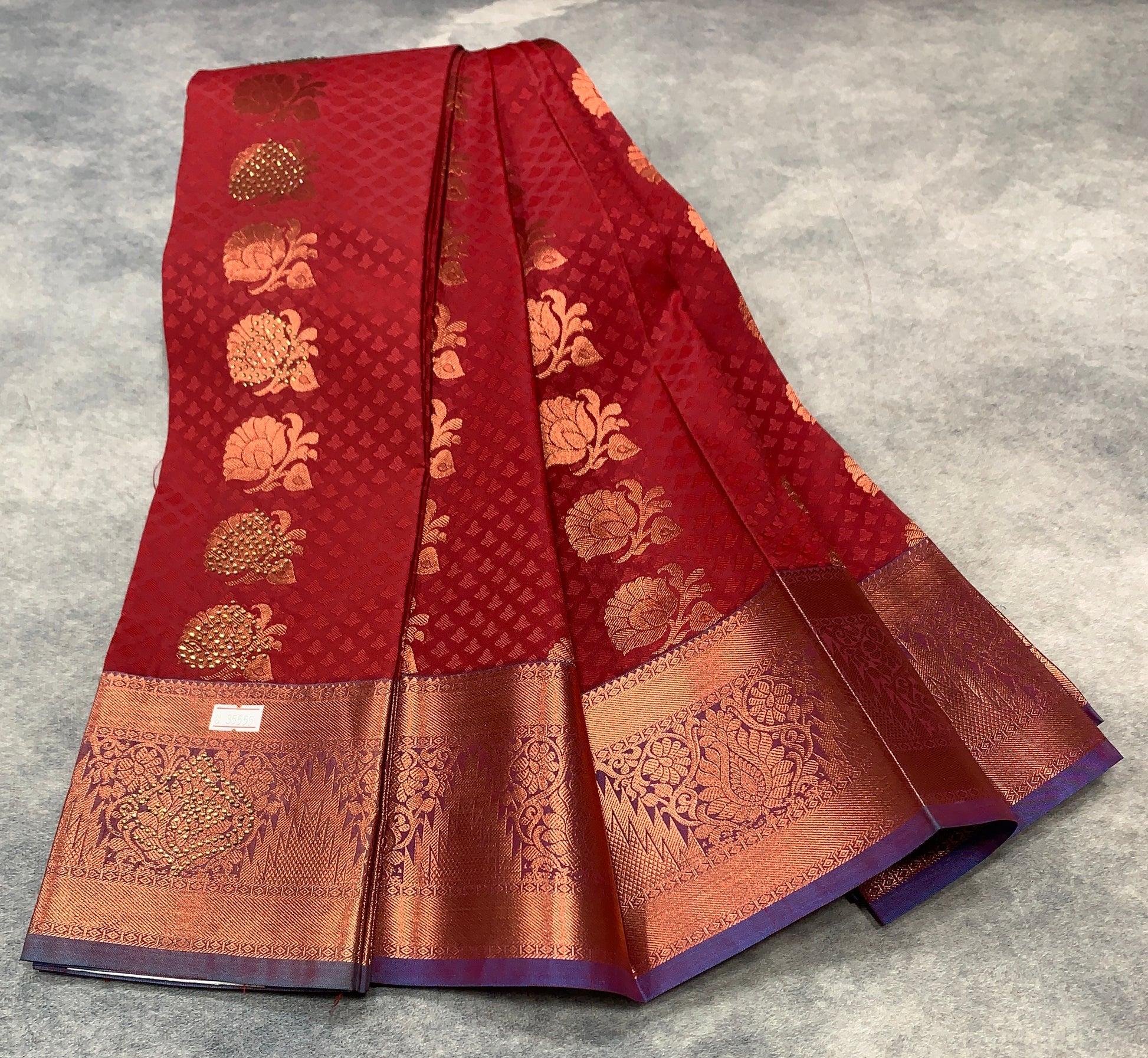 Vegan Silk Saree Maroon Colour with Copper Floral Design Border