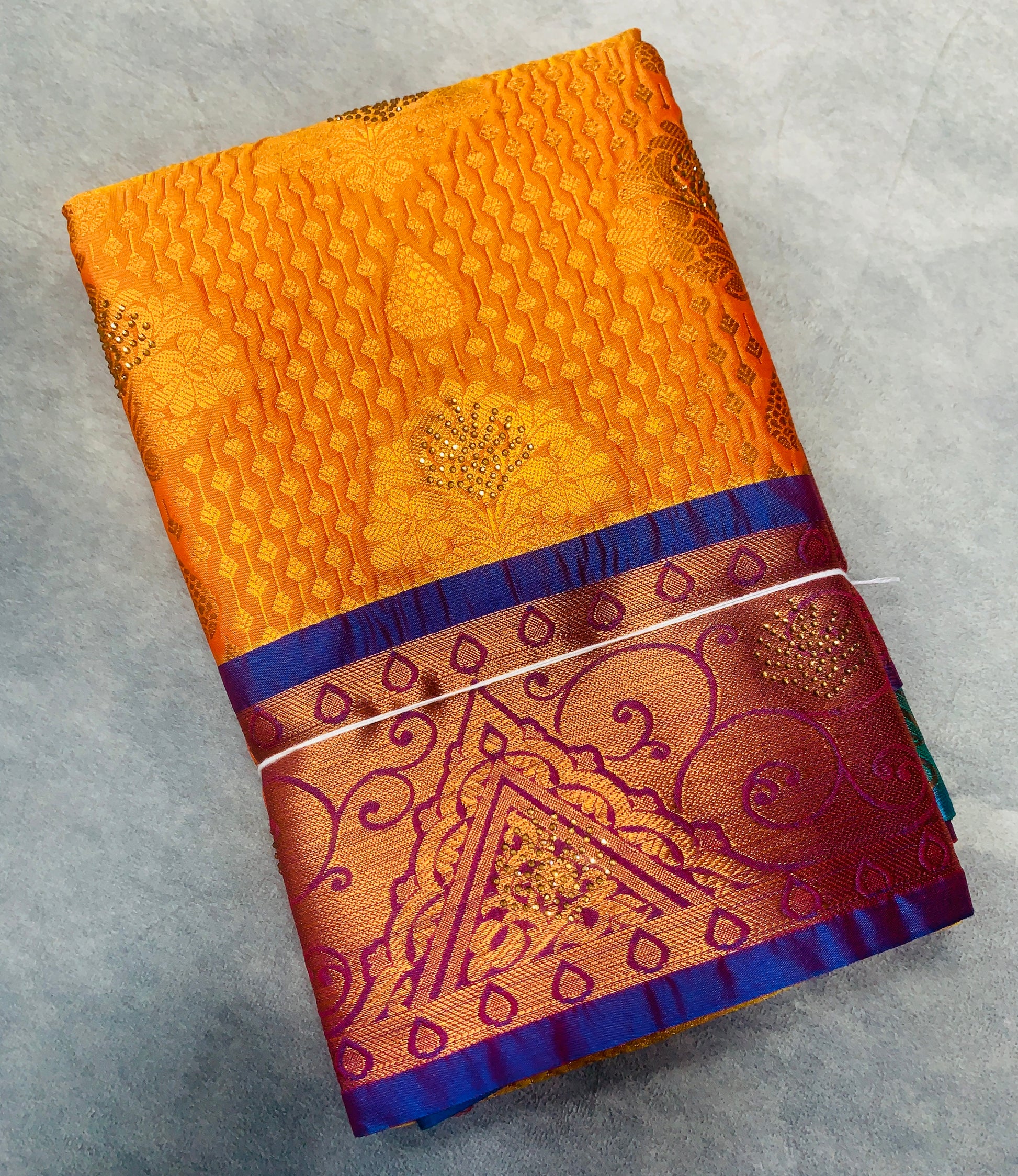 Vegan Silk Saree Mustard Colour with Copper and Blue Border