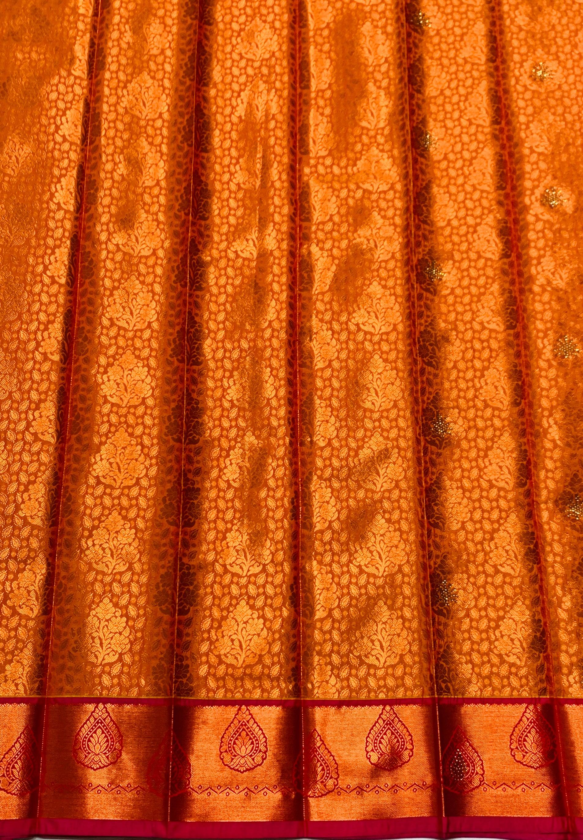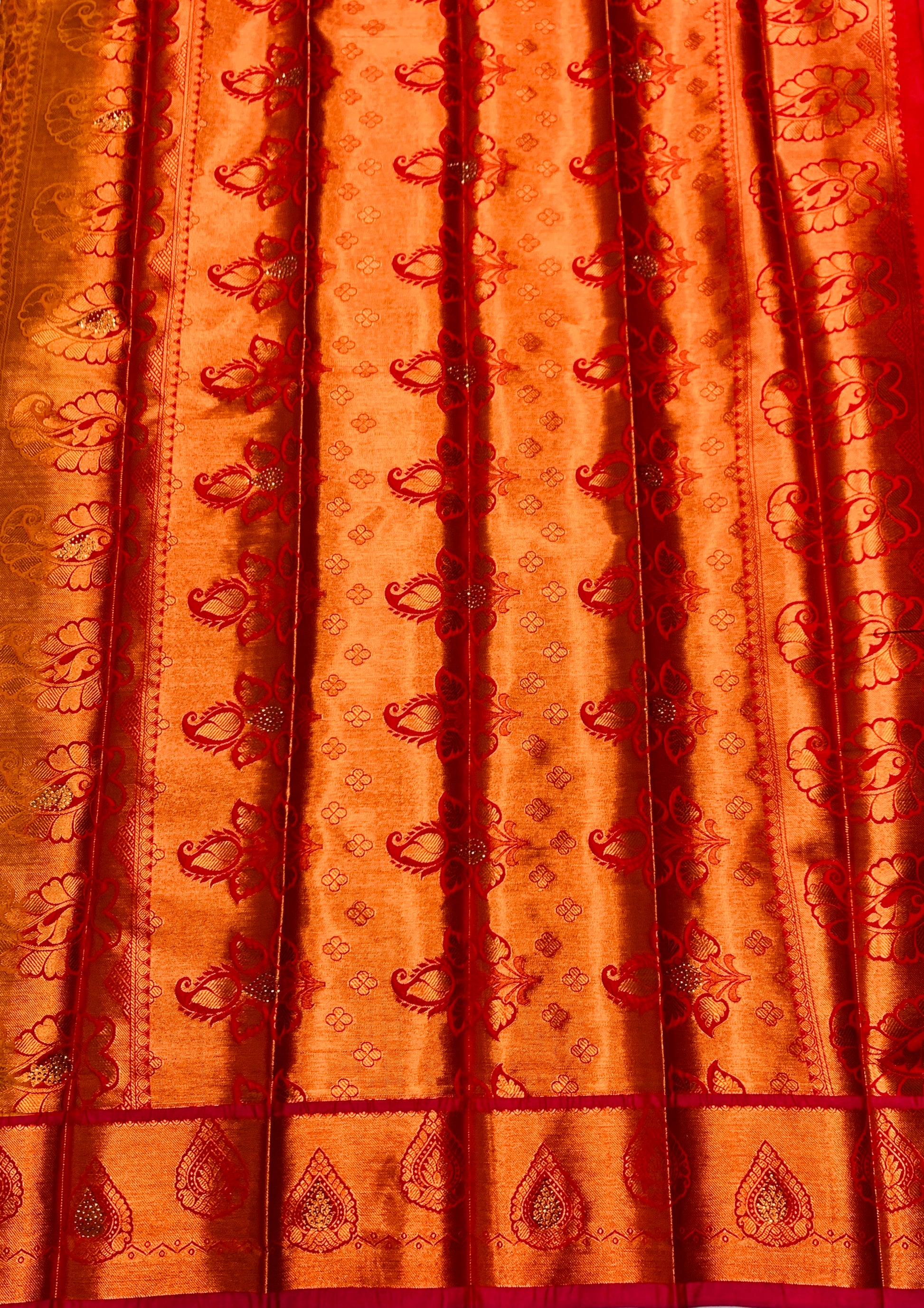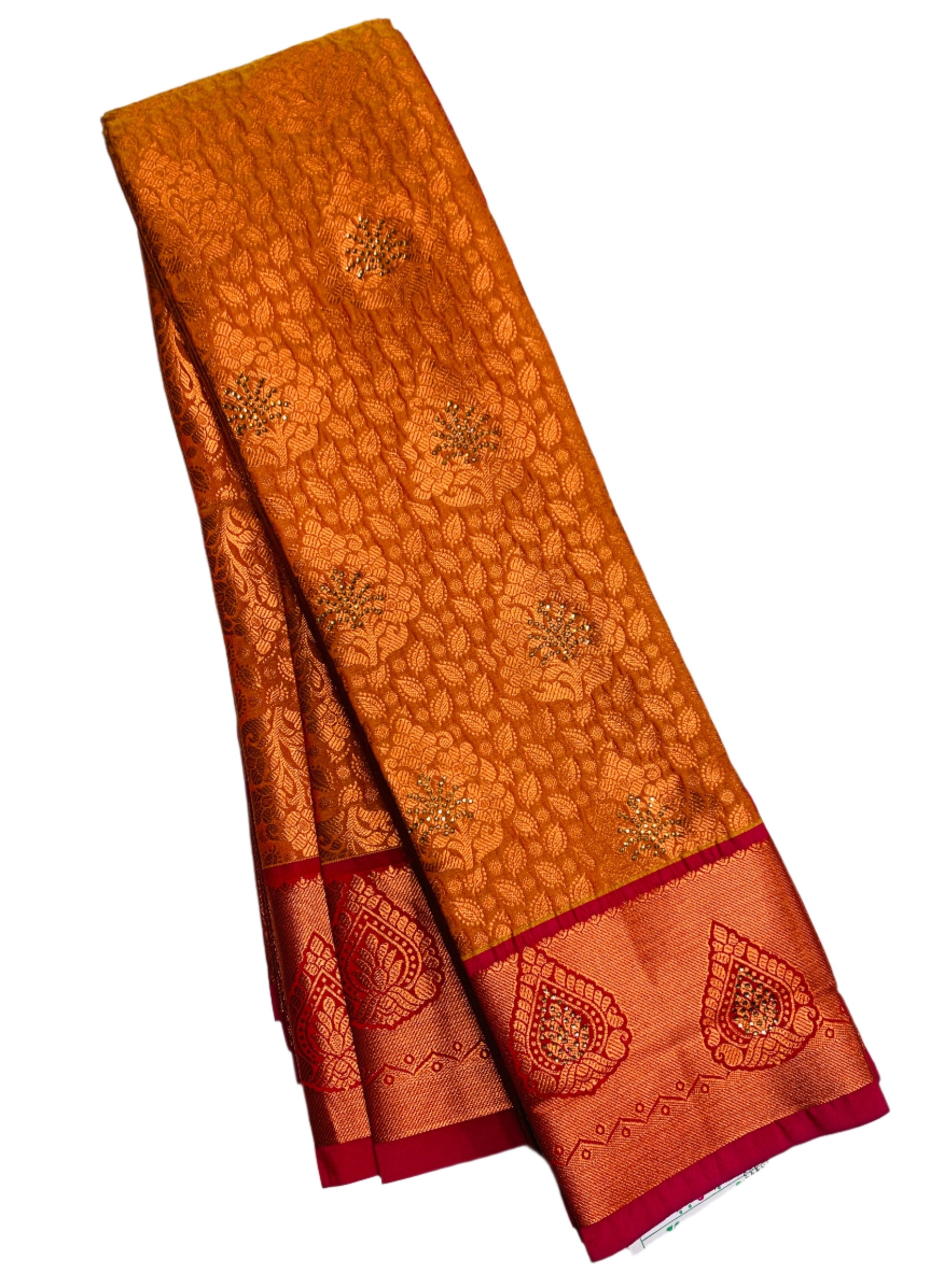 Bridal Vegan Silk Saree Mustard Colour and floral design. Copper and Pink Border with Floral design. Dry wash only.