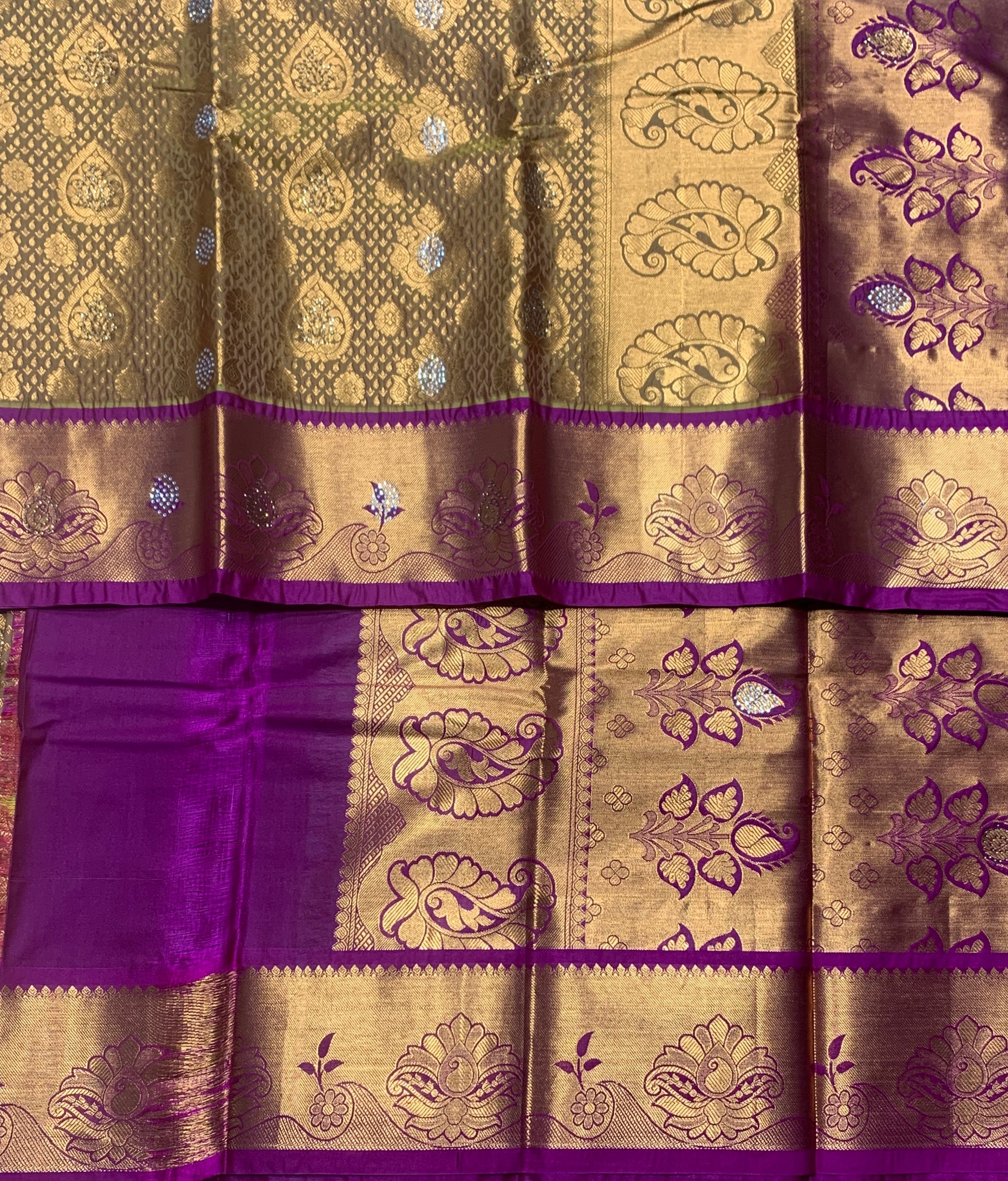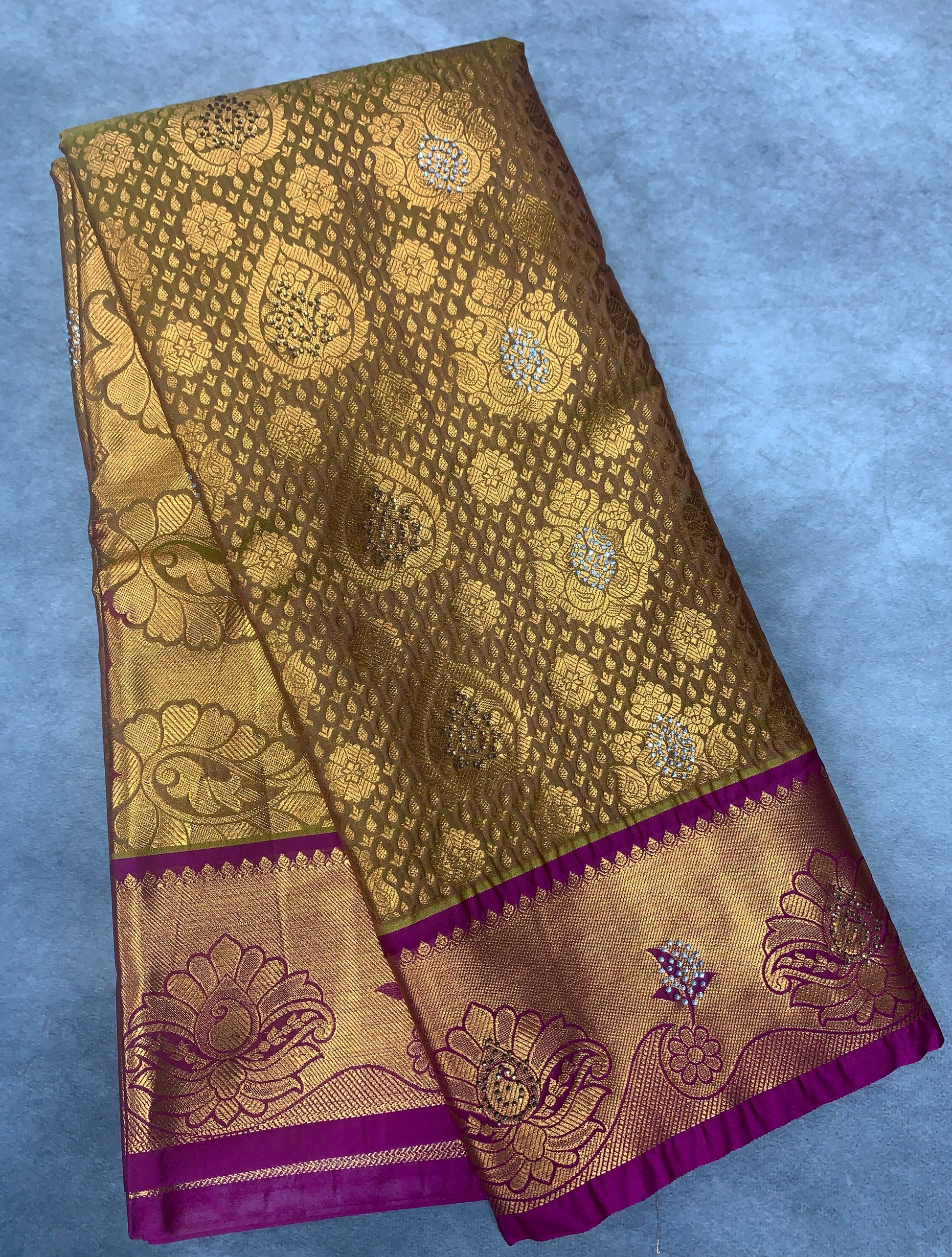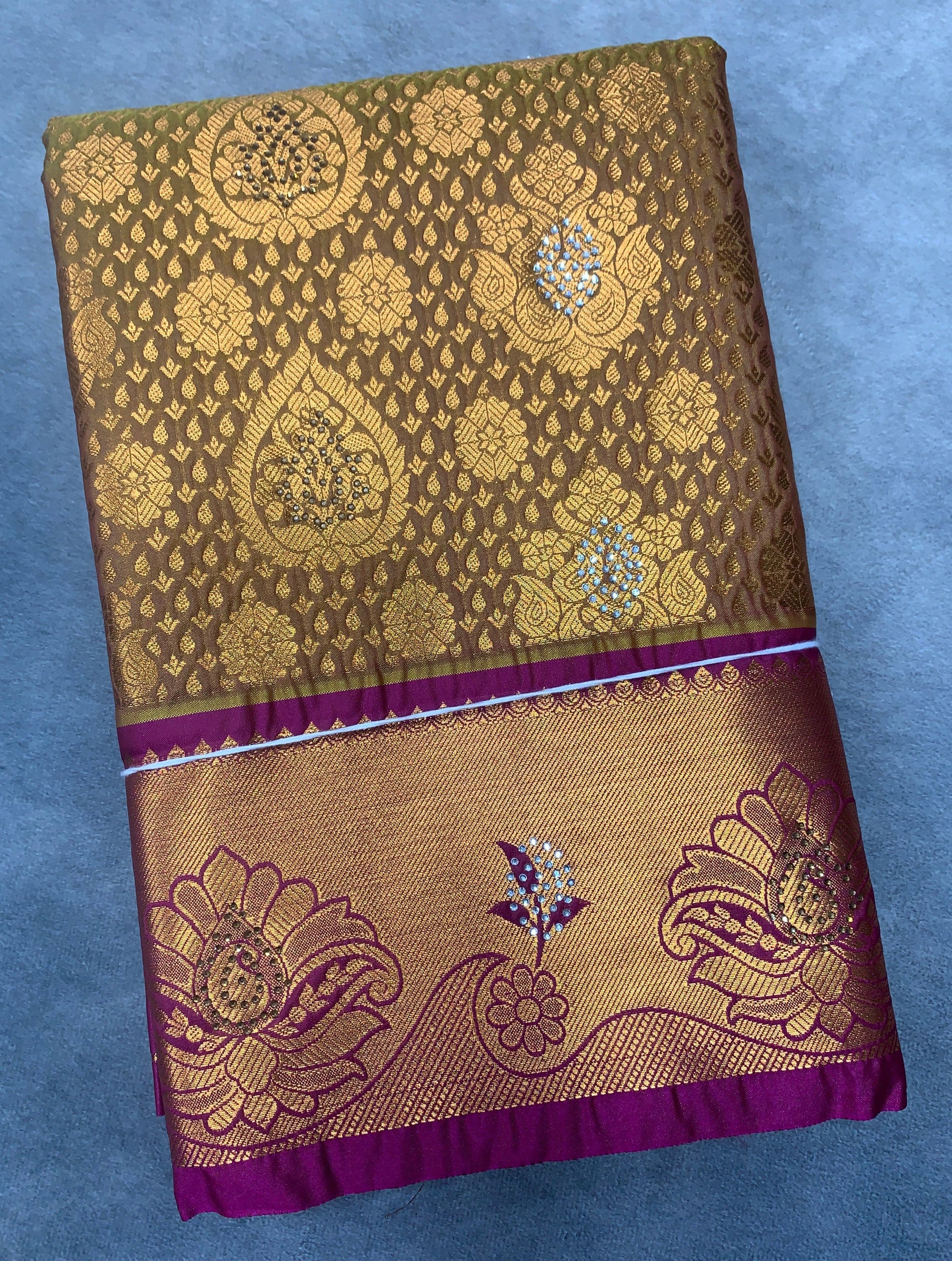 Vegan Silk Saree Mustard Colour with Copper and Pink Border .