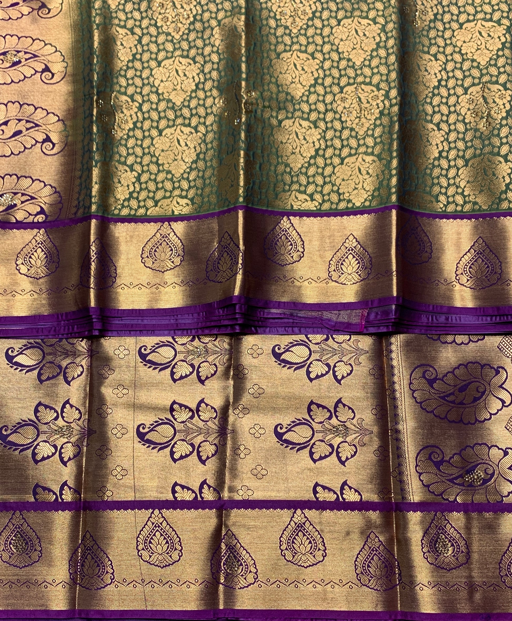 Vegan Silk Saree Olive Green Colour with Copper and Magenta Border.