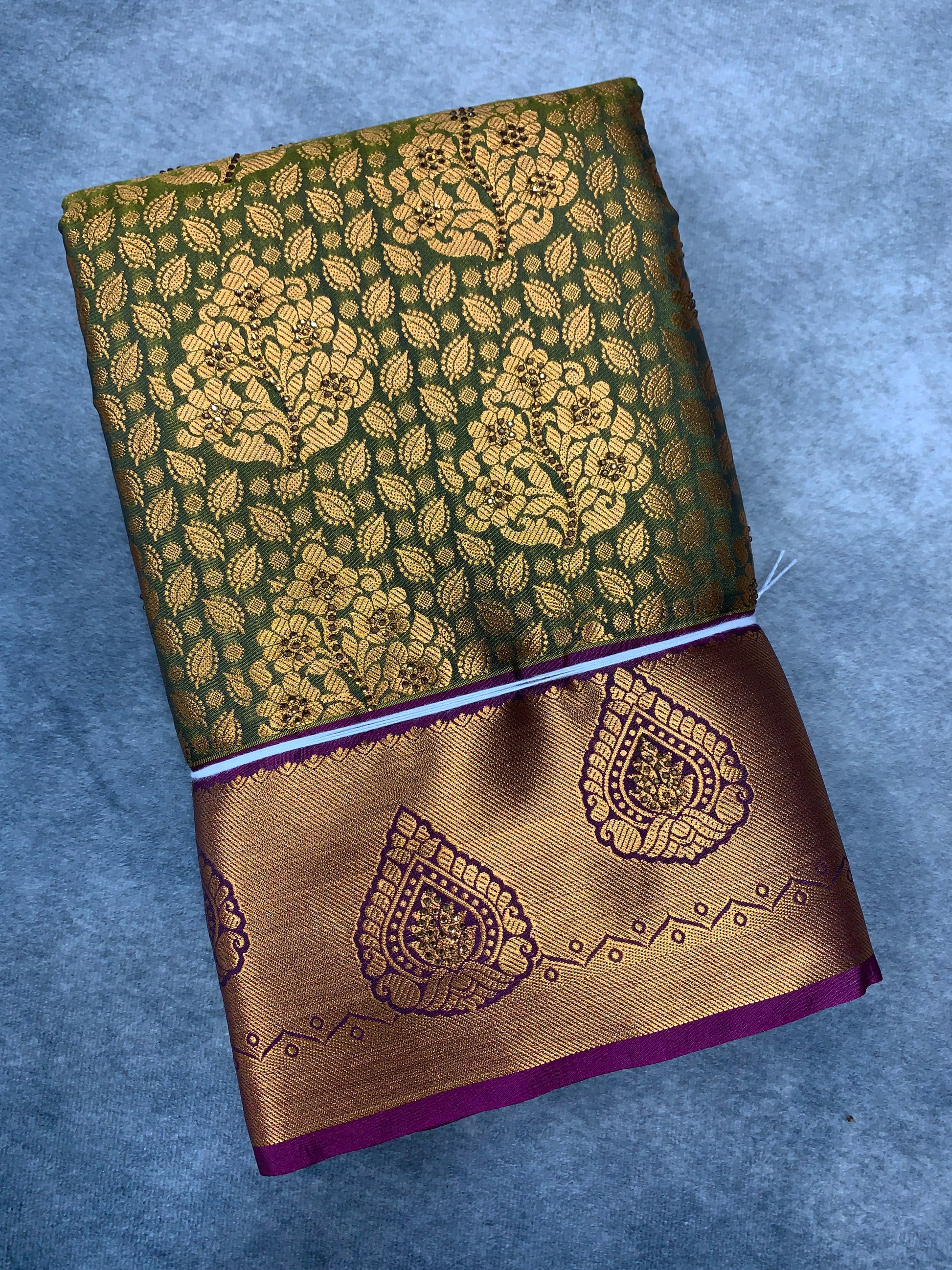 Vegan Silk Saree Olive Green Colour with Copper and Magenta Border