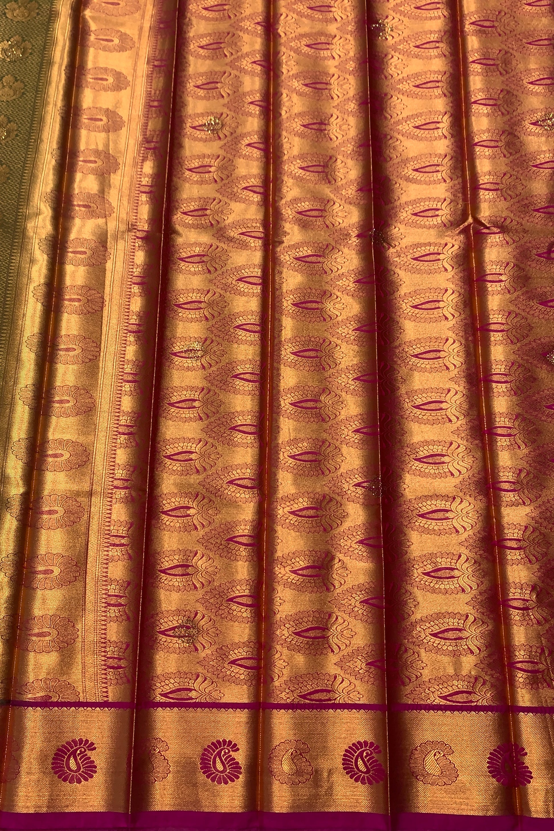 Vegan Silk Saree Olive Green Colour and floral design. Copper and Pink Border with Floral design. Dry wash only.