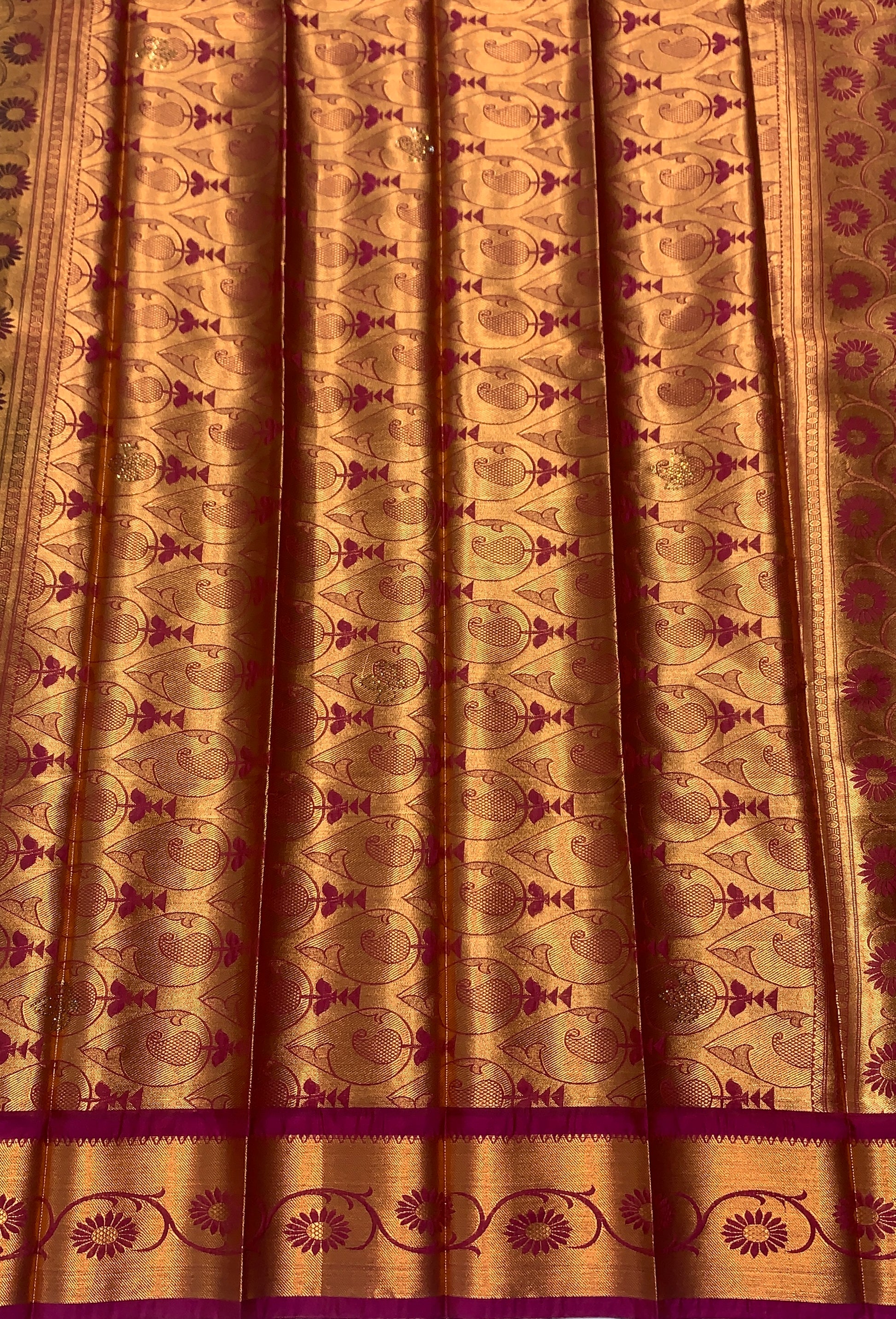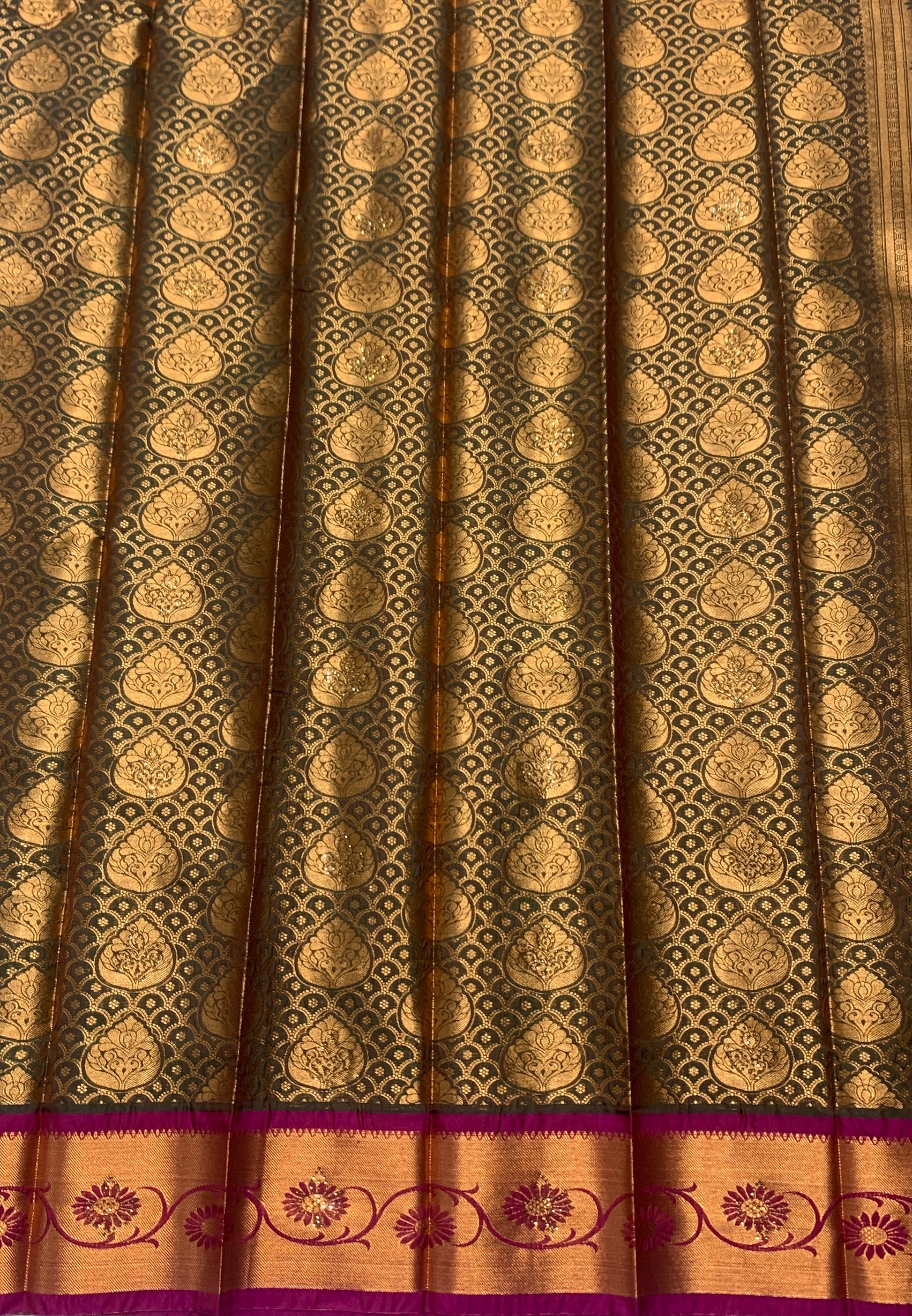 Vegan Silk Saree Olive Green Colour and floral design. Copper and Pink Border with Floral design. Dry wash only.