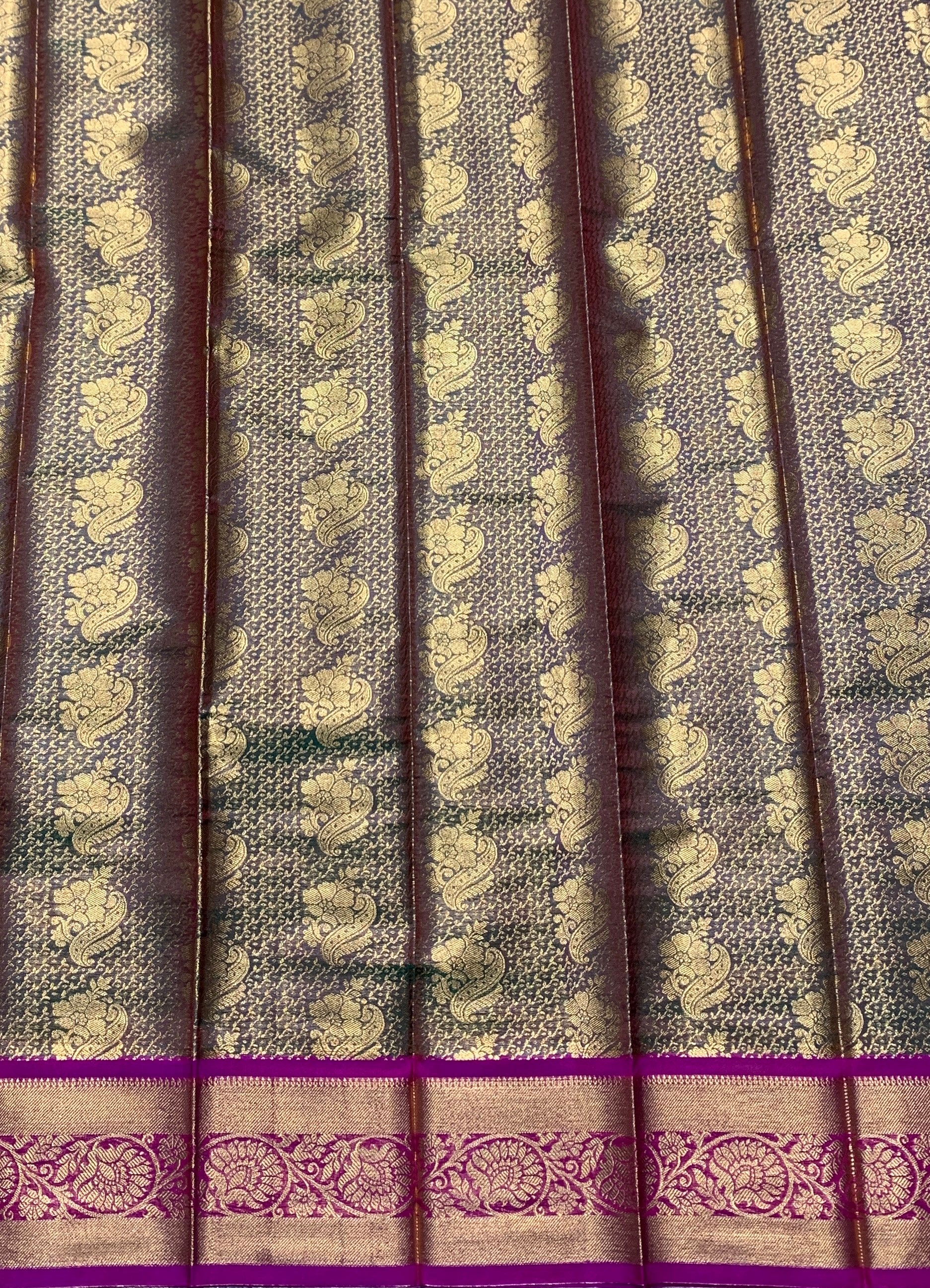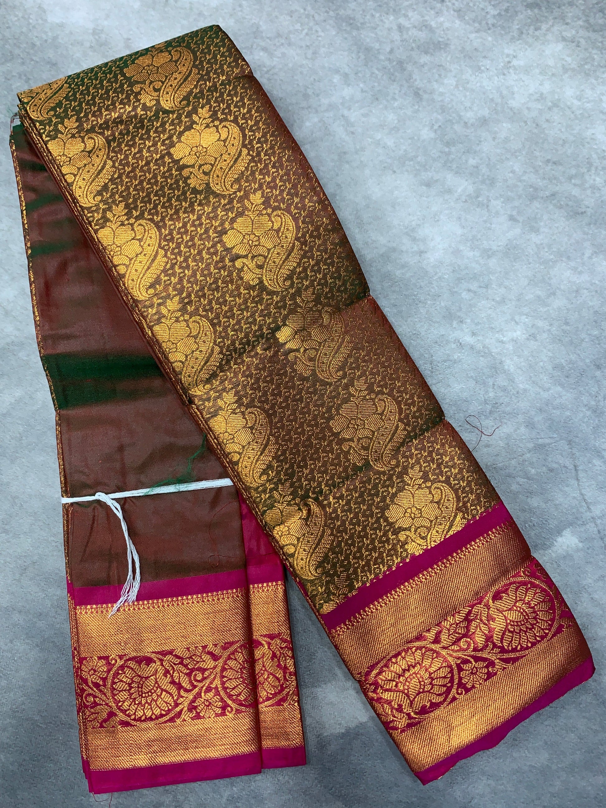 Vegan Silk Saree Olive Green Colour with Copper and Pink Border.