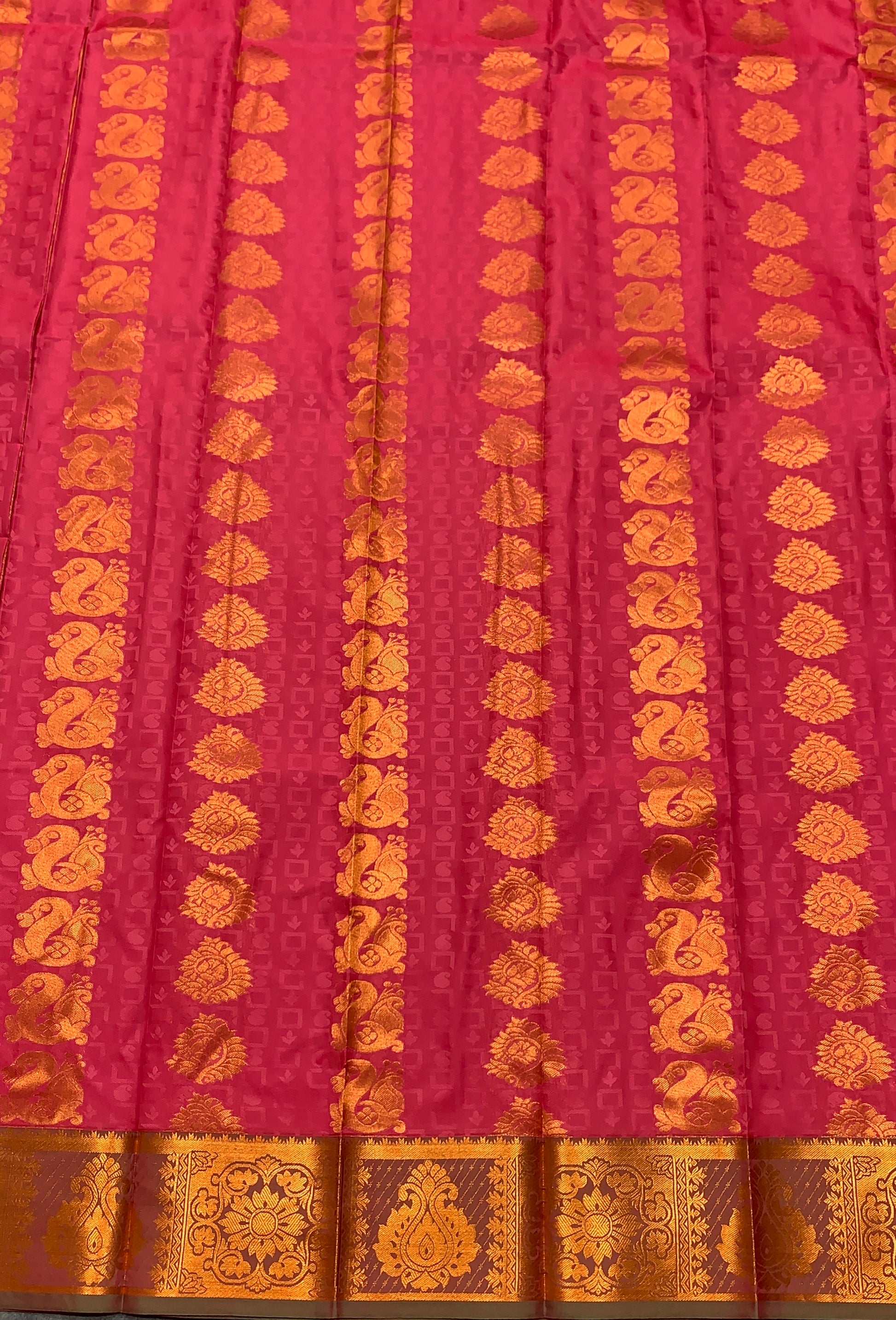 Vegan Silk Saree Peach Pink Colour with flower design. Copper Border with Flower design.