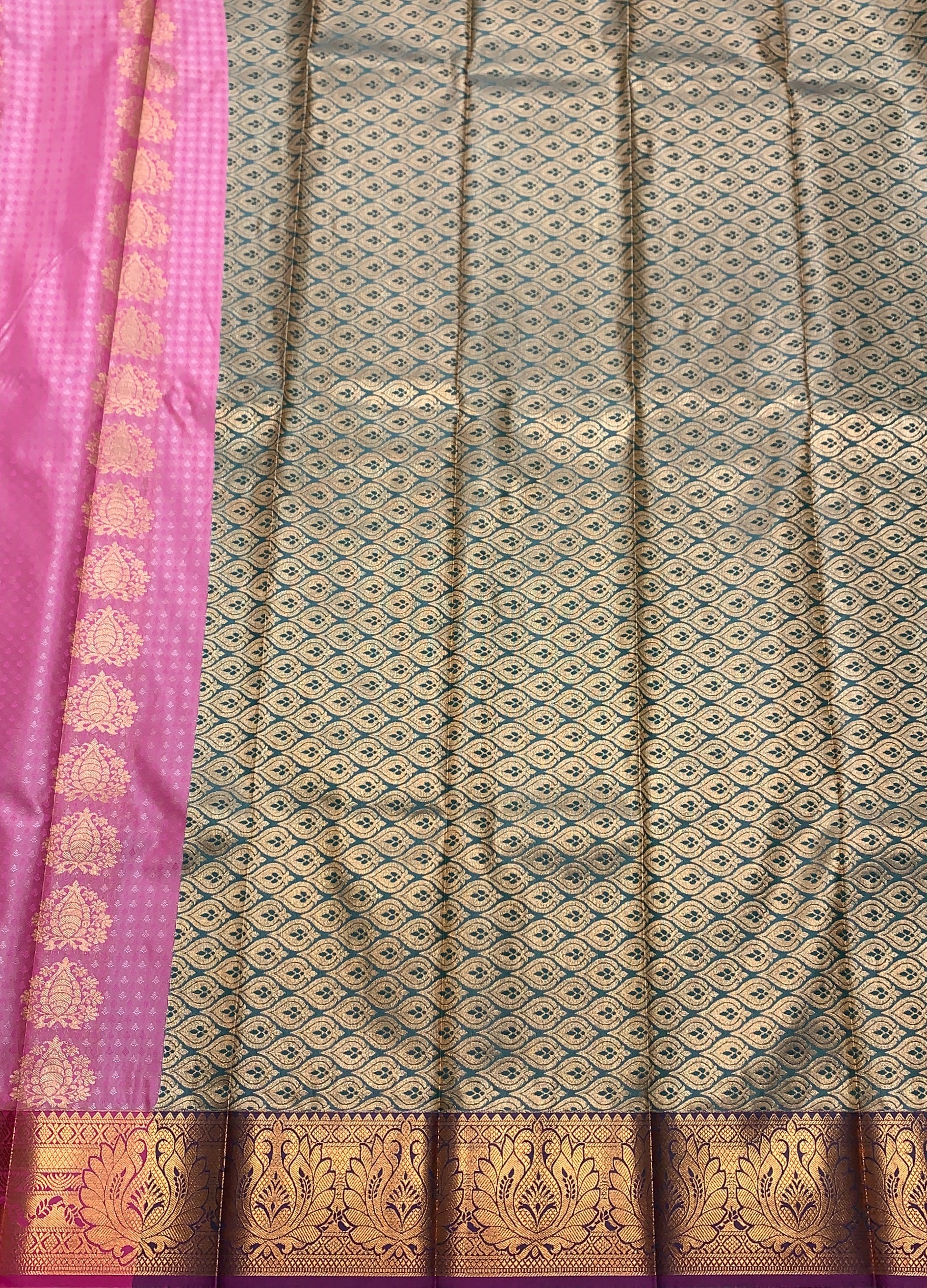 Vegan Silk Saree Peach Pink Colour with flower design. Copper Border with Flower design.