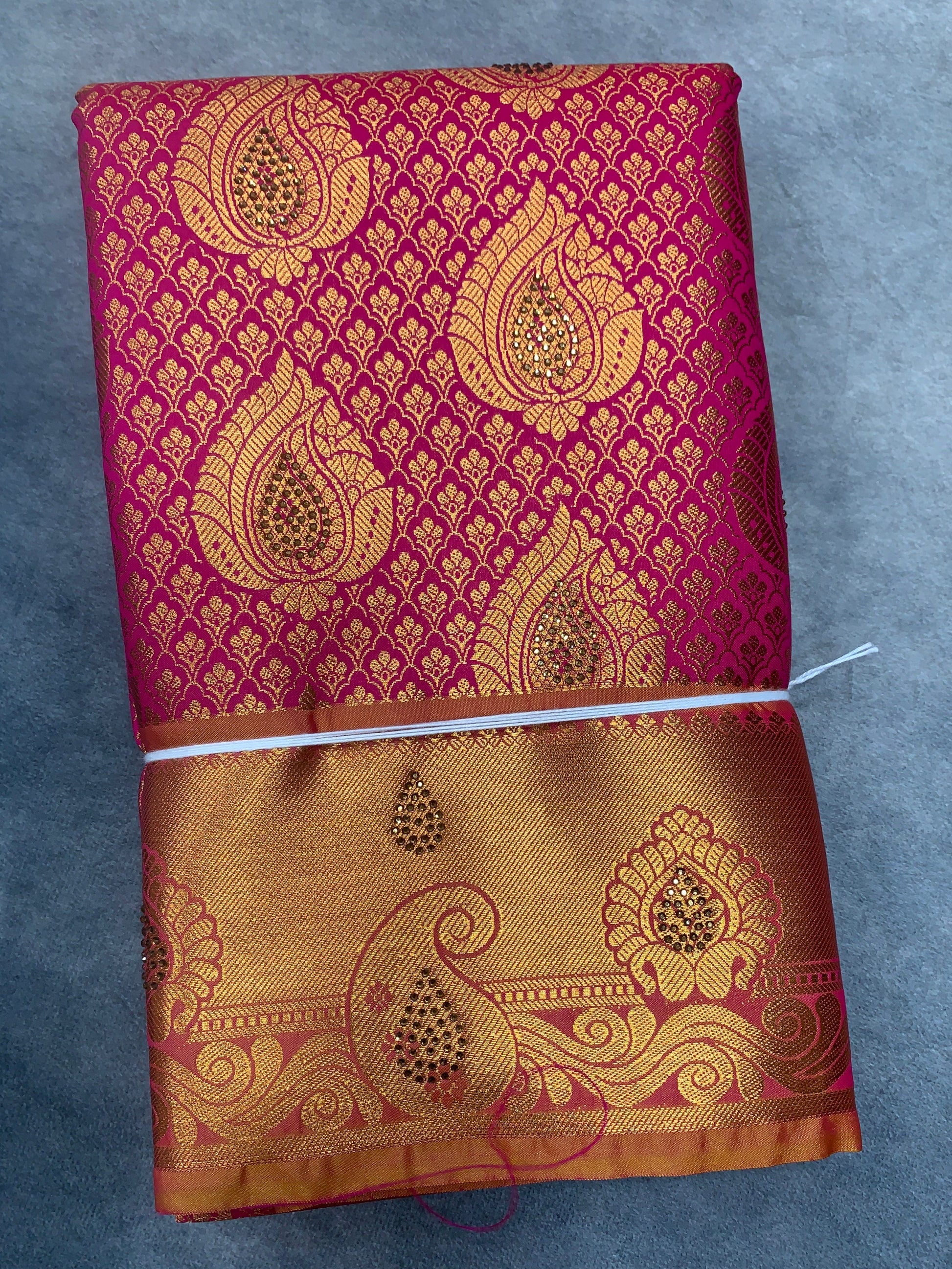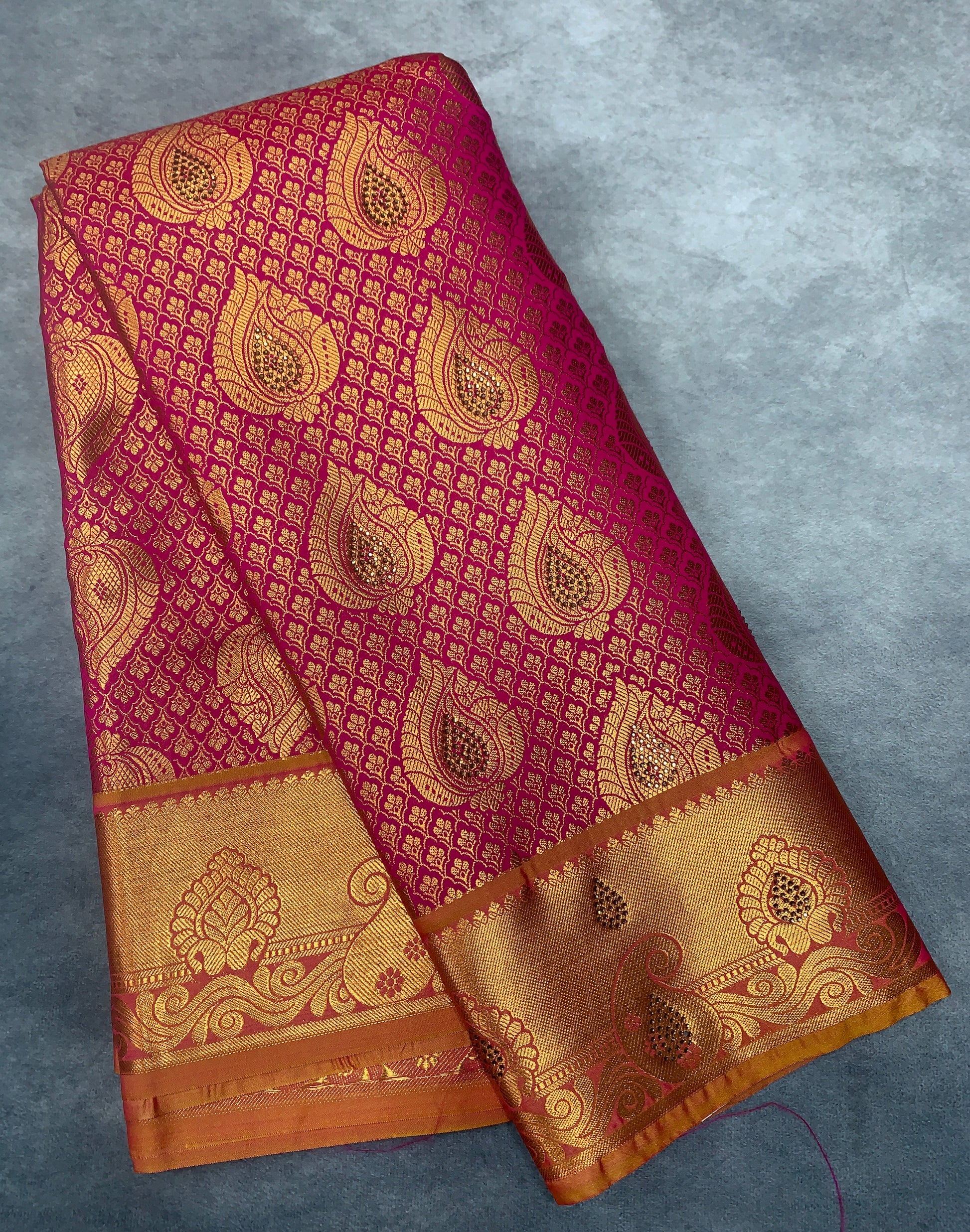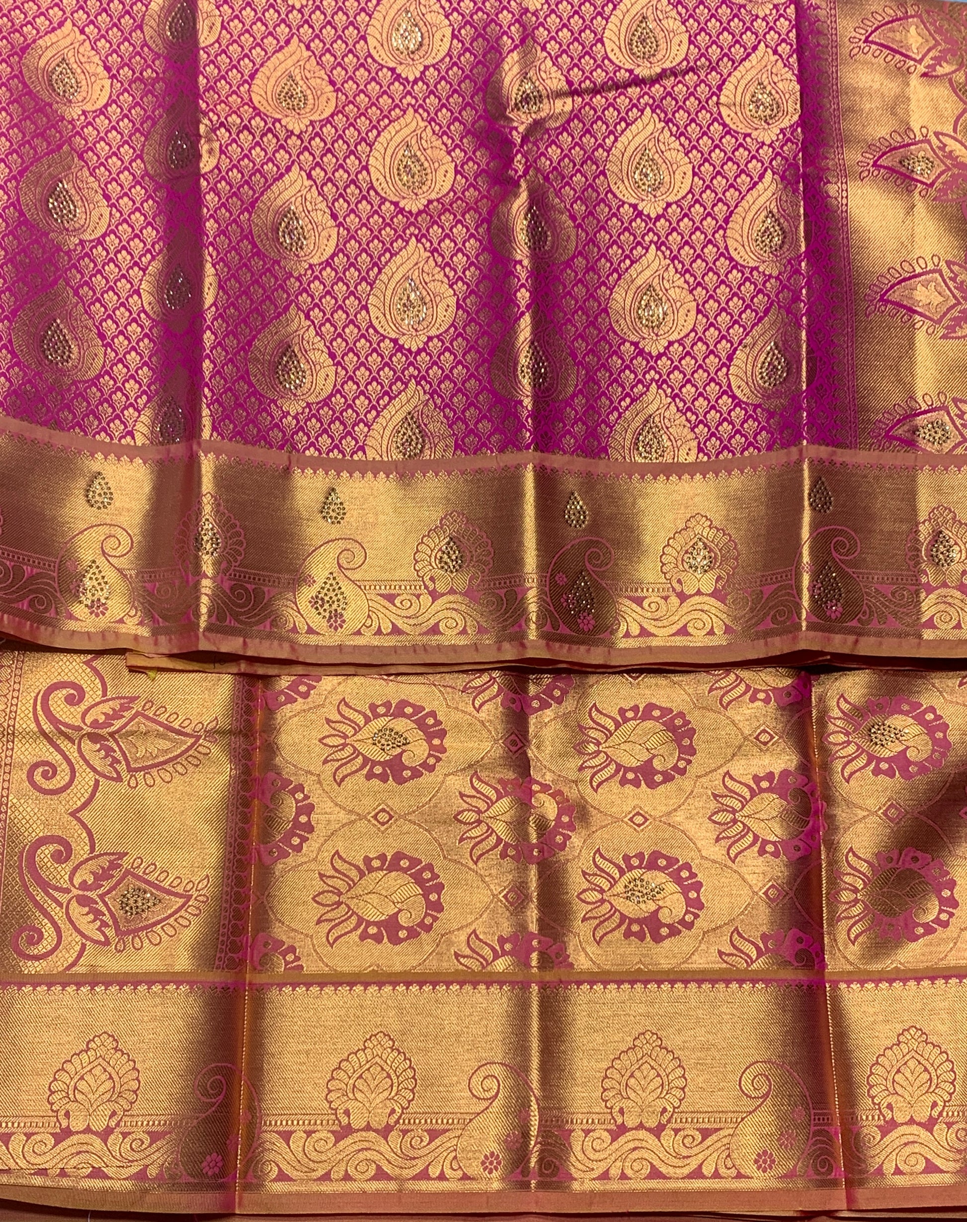 Vegan Silk Saree Pink Colour with Copper and Golden Yellow Border