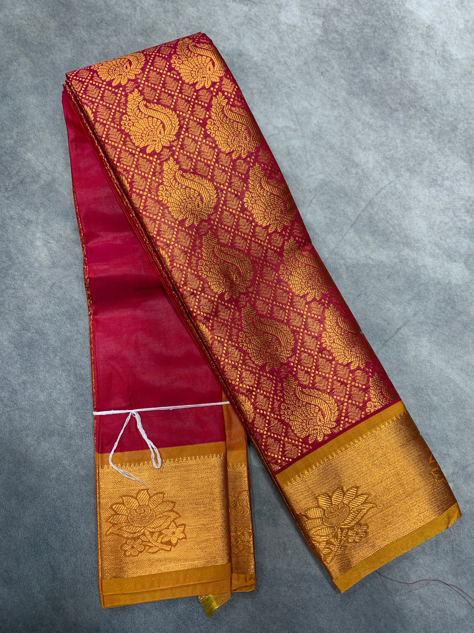 Vegan Silk Saree Pink Colour with Copper and Golden Yellow Border