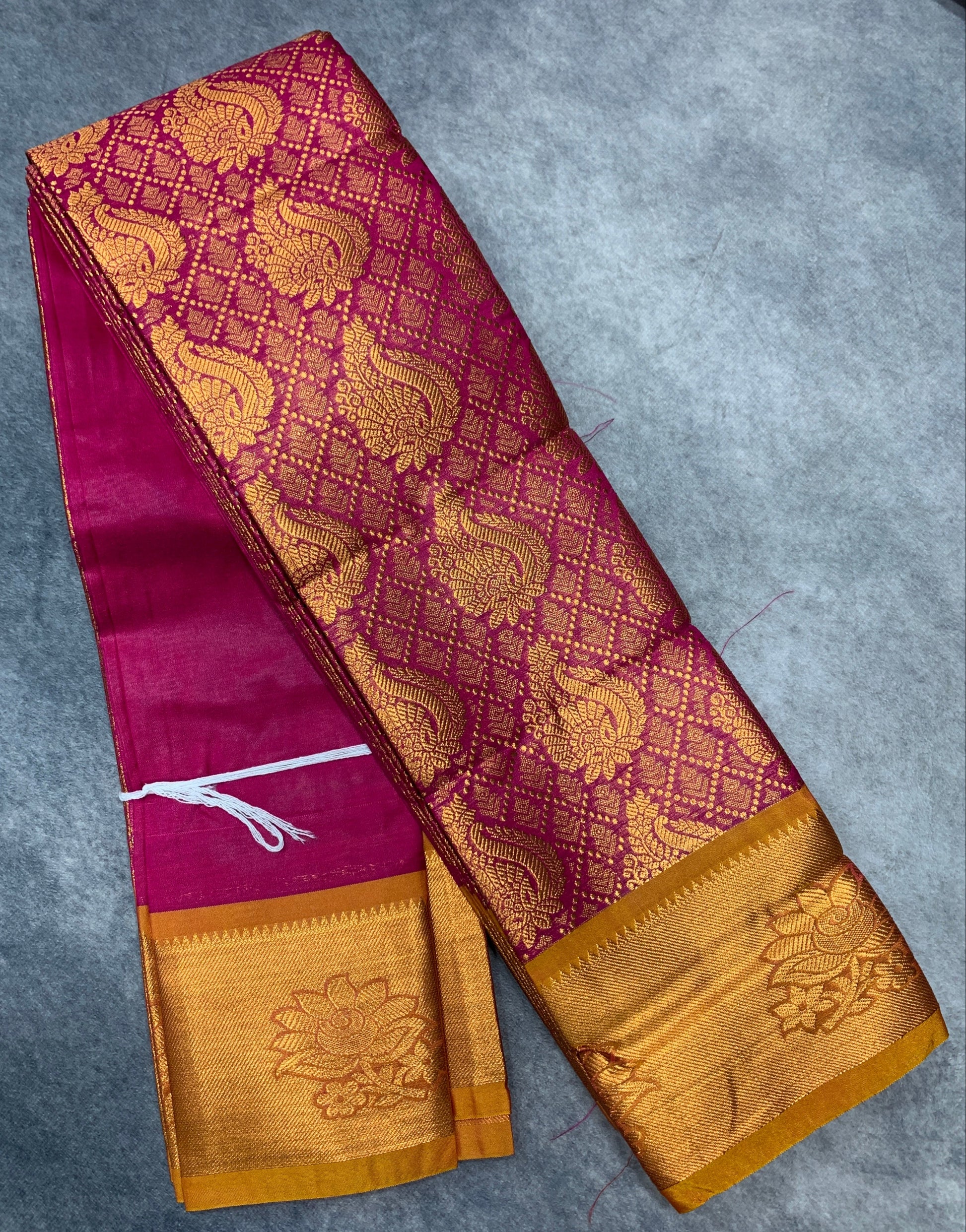 Vegan Silk Saree Pink Colour with Copper and Golden Yellow Border.