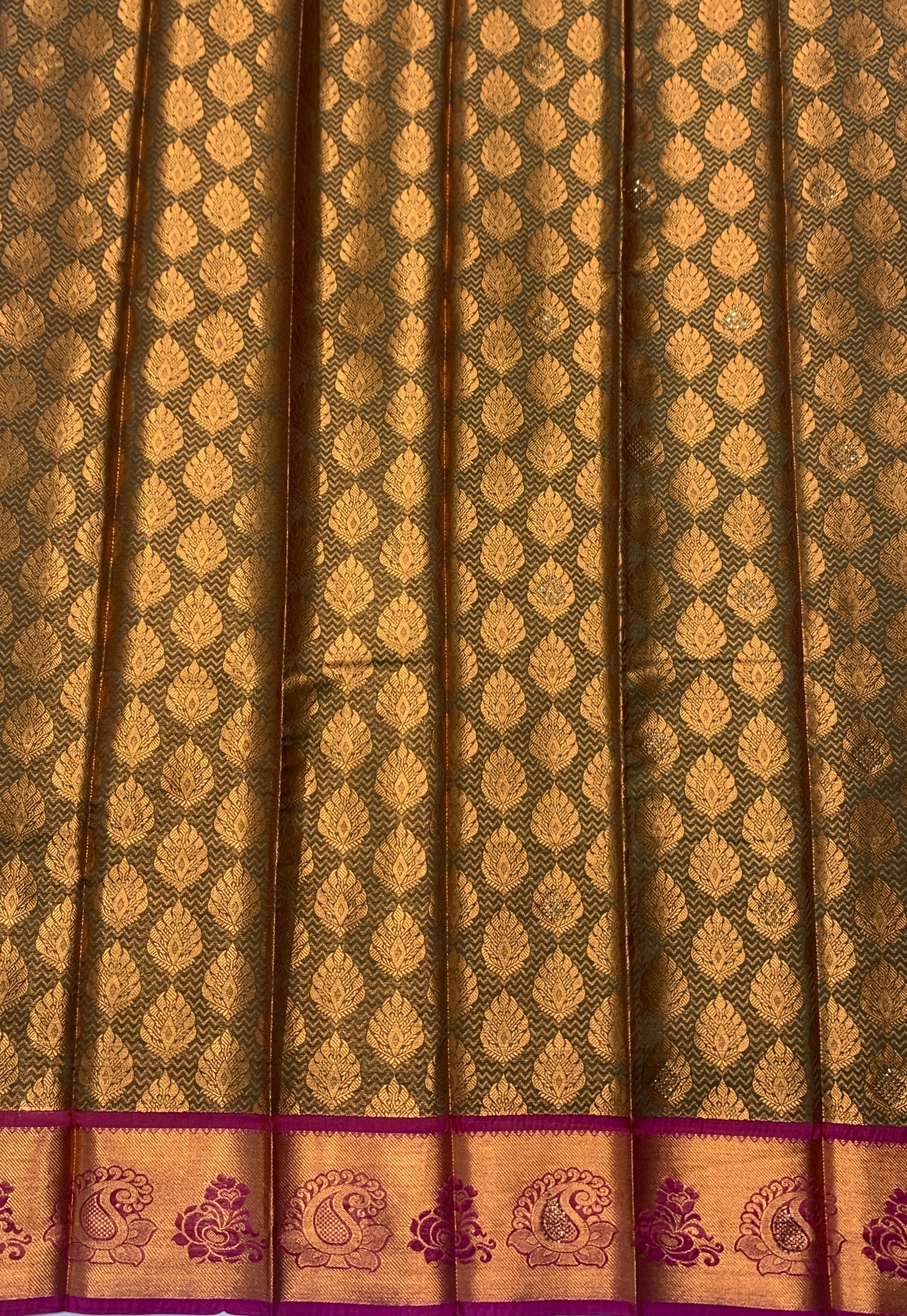 Vegan Silk Saree Olive Green Colour and floral design. Copper and Pink Border with Floral design. Dry wash only.