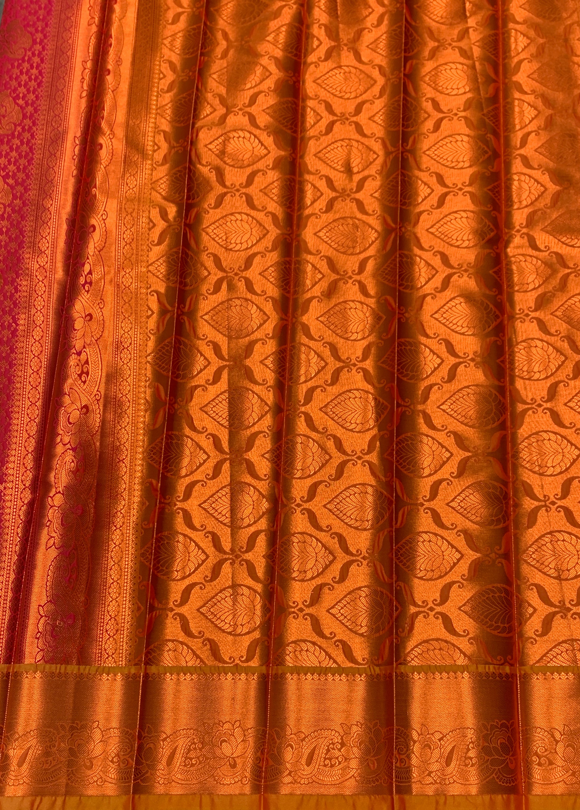Vegan Silk Saree Pink Colour with Golden Yellow and Copper Border.