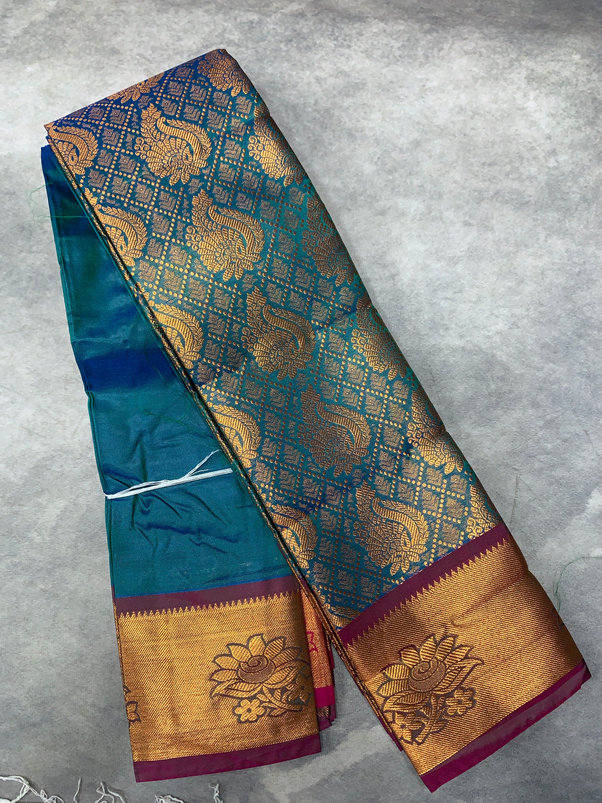 Vegan Silk Saree Rama Blue Colour with Copper and Magenta Border